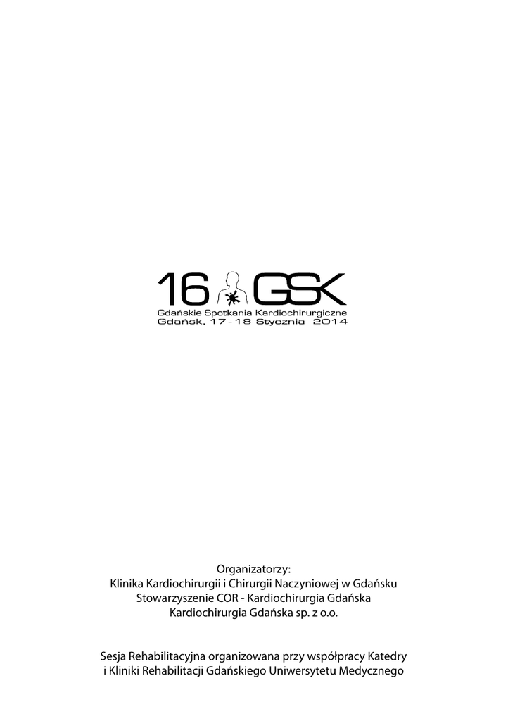 Organizatorzy: Klinika Kardiochirurgii i Chirurgii Naczyniowej w Gdańsku Stowarzyszenie COR - Kardiochirurgia Gdańska Kardiochirurgia Gdańska sp. z o.o. Sesja Rehabilitacyjna organizowana przy współpracy Katedry i Kliniki Rehabilitacji Gdańskiego Uniwersytetu Medycznego Piątek, 17 stycznia 2014 Sobota, 18 stycznia 2014 Piątek, 17 stycznia 2014 Program konferencji 12:00 – 12:50 Lunch w restauracji „Malinowy Ogród” w Domu Muzyka Sesja główna 13:00-15:00 Wykłady gości zagranicznych Sala Koncertowa Przewodniczący sesji: J. Rogowski, M. Brykczyński, K. Widenka 13:00 Jan Rogowski Klinika Kardiochirurgii i Chirurgii Naczyniowej, Gdański Uniwersytet Medyczny Otwarcie konferencji 13:10 Tom Treasure Clinical Operational Research Unit, University College London Past President of the European Association for Cardio-Thoracic Surgery Personalized External Aortic Root Support (PEARS) and the Big Aortic Root Study (BARS) 13:30 Hans Joachim Schäfers Universitätsklinikum des Saarlandes, Homburg/Saar, Germany Aortic valve repair - current status 13:50 Borut Gersak Department of Cardiovascular Surgery, University Medical Center Ljubljana, Slovenia Minimally Invasive Aortic Valve Replacement with Sutureless Valves 14:10 Justus Strauch Klinik für Herz- und Thoraxchirurgie Berufsgenossenschaftliches Universitätsklinikum Bergmannsheil, Bochum, Germany Is fast deployment valve the step forward? Bochum experience with Edwards Intuity System 14:30 Christoph Hans Huber University Hospital Bern, Switzerland The Symetis Acurate TA autopilot valve – The first intelligent transapical valve concept Przerwa kawowa 15:00-15:30 Piątek, 17 stycznia 2014 Sesja główna 15:30-18:10 Wykłady ciąg dalszy Sala Koncertowa Przewodniczący sesji: M. Zembala, P. Bugajski 15:30 Sabine Bleiziffer Department of Cardiovascular Surgery, German Heart Centre Munich Jena Valve - experience in German Heart Center Munich 15:50 Robert Bauernschmitt Klinik für Herz-; Thorax- und GefäßchirurgieUniversität Ulm TAVI prostheses - which one is the best ? 16:10 Joseph Zacharias Blackpool Teaching Hospitals, UK The Endoclamp in Minimally invasive surgery: Lessons learnt 16:30 Kazimierz Widenka Oddział Kardiochirurgii, Szpital Wojewódzki, Rzeszów Minimally invasive mitral valve surgery 16:50 Michał Zembala Katedra i Oddział Kliniczny Kardiochirurgii i Transplantologii ŚUM, Śląskie Centrum Chorób Serca, Zabrze Minimally Invasive Surgery for Atrial Fibrillation - reasons for the hybrid approach 17:10 Marian Zembala Katedra i Oddział Kliniczny Kardiochirurgii i Transplantologii ŚUM, Śląskie Centrum Chorób Serca, Zabrze Managing asymptomatic carotid disease in patients undergoing coronary artery bypass grafting 17:30 Maciej Kolowca Oddział Kardiochirurgii, Szpital Wojewódzki, Rzeszów Brain protection in aortic arch surgery 17:50 Jacek Wojciechowski Klinika Kardiochirurgii i Chirurgii Naczyniowej, Gdański Uniwersytet Medyczny Fenestrated and Branched Endografts For Aortic Aneurysms Przerwa kawowa 18:10 -18:30 Piątek, 17 stycznia 2014 Sesja główna 18:30-19:30 Prace oryginalne Sala Koncertowa Przewodniczący sesji: R. Kalawski, K. Suwalski 18:30 Michał Zembala Katedra i Oddział Kliniczny Kardiochirurgii i Transplantologii ŚUM, Ś ląskie Centrum Chorób Serca, Zabrze Transapical Aortic Valve Replacement with Symetis Accurate Valve – initial Polish experience 18:40 Piotr Olszówka Oddział Kardiochirurgii, Szpital Wojewódzki, Rzeszów TAVI mid-term results - single centre experience 18:50 Wojciech Karolak Katedra i Oddział Kliniczny Kardiochirurgii i Transplantologii ŚUM, Śląskie Centrum Chorób Serca, Zabrze Mini Invasive Aortic Valve Surgery - the best option? 19:00 Przemysław Szałański Klinika Kardiochirurgii WIM, Warszawa Minimally invasive aortic valve replacement by right mini thoracotomy 19:10 Radosław Smoczyński Klinika Kardiochirurgii, CSK MSW, Warszawa Minimal invasive approach for Bentall de Bono procedure 20:00 Kolacja (za zaproszeniami) Restauracja Filharmonia, ul. Ołowianka 1, Gdańsk Piątek, 17 stycznia 2014 Sesja równoległa 17:00-19:00 Projekty badawcze Sala Malinowy Ogród Przewodniczący sesji: G. Religa, L. Wilczyński, P. Siondalski 17:00 Janusz Konstanty-Kalandyk Klinika Chorób Serca i Naczyń, Collegium Medicum UJ, Kraków Stem-cells in treatment end-stage coronary artery disease 17:15 Roman Kustosz Fundacja Rozwoju Kardiochirurgii im. prof. Zbigniewa Religi, Zabrze Polish heart prostheses - technological development 17:45 Grzegorz Religa Klinika Kardiochirurgii IK Warszawa, Fundacja Rozwoju Kardiochirurgii im. prof. Zbigniewa Religi, Zabrze ReligaHeart EXT clinical trials 18:00 Maciej Darłak Fundacja Rozwoju Kardiochirurgii im. prof. Zbigniewa Religi, Zabrze Prototype of Polish implantable rotary pump ReligaHeart ROT 18:15 Leszek Wilczyński Centrum Techniki Okrętowej, Gdańsk A Novel Polish Implantable Axial Pump for Left Ventricle Assist - in vitro testing results 18:30 Kinga Dawidowska Centrum Techniki Okrętowej, Gdańsk Human Aortic Bioprosthesis - in vitro testing results 18:45 Piotr Siondalski Klinika Kardiochirurgii I Chirurgii Naczyniowej, Gdańsk Kardio-BNC research project - an attempt to apply bacterial nanocellulosis for cardiosurgery 20:00 Kolacja (za zaproszeniami) Restauracja Filharmonia, ul. Ołowianka 1, Gdańsk Piątek, 17 stycznia 2014 Sesja anestezjologii Sala Prób godz. 17:30 Przewodniczący sesji: Ewa Kucewicz, Romuald Lango 17:30 Dominik Drobiński Szpital MSWiA, Warszawa Levosimendan. Jak osiągnąć sukces terapeutyczny? 17:45 Dominik Drobiński Szpital MSWiA, Warszawa ECMO Transport Team for acute respiratory syndrome – lessons learned 18:00 Katarzyna Skuza Śląskie Centrum Chorób Serca w Zabrzu Sedation after cardiac surgery 18:15 Karol Krawczyk Warszawa Hartowanie serca poprzez niedokrwienie tkanek odległych w zabiegach OPCABG 18:30 Maciej Kowalik Zakład Kardioanestezjologii, Gdański Uniwersytet Medyczny Kliniczne i genetyczn