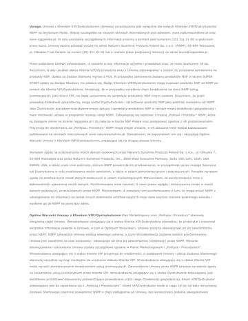 Uwaga: Umowa z Klientem VIP/Dystrybutorem (Umowa) przeznaczona jest wyłącznie dla nowych Klientów VIP/Dystrybutorów NSPP na terytorium Polski. Więcej szczegółów na naszych stronach internetowych pod adresem: www.naturessunshine.pl oraz www.nsppolska.pl. W celu uzyskania szczegółowych informacji prosimy o kontakt pod numerem (22) 311 21 00 w godzinach pracy biura. Umowę można przesłać pocztą na adres Nature’s Sunshine Products Poland Sp. z o.o. (NSPP), 02-604 Warszawa, ul. Olkuska 7 lub faksem na numer (22) 311 21 01 lub e-mailem (skan podpisanej Umowy) na adres [email protected]. Przez podpisanie Umowy potwierdzam, iż zawarte w niej informacje są pełne i prawdziwe oraz, że mam ukończone 18 lat. Rozumiem, iż aby uzyskać status Klienta VIP/Dystrybutora wraz z Umową zobowiązana/-y jestem do przesłania zamówienia na produkty NSP. Opłata za Zestaw Startowy wynosi 5 PLN. W przypadku zamówienia zestawu produktów NSP o nazwie SUPER START opłaty za Zestaw Startowy nie pobiera się. Będąc Klientem VIP/Dystrybutorem mogę kupować produkty NSP od NSPP po cenach dla Klienta VIP/Dystrybutora. Akceptuję, że w przypadku wyrażenia chęci świadczenia na rzecz NSPP usług promocyjnych, jako Klient VIP, nie będę uprawniony do sprzedaży produktów NSP innym osobom. Rozumiem, że jeżeli prowadzę działalność gospodarczą, mogę zostać Dystrybutorem i sprzedawać produkty NSP jako podmiot niezależny od NSPP. Jako Dystrybutor posiadam niewyłączne prawo zakupu i sprzedaży produktów NSP w ramach mojej działalności gospodarczej i mam możliwość udziału w programie rozwoju rangi NSPP. Zobowiązuję się zapoznać z treścią „Polityki i Procedur” NSPP, które są dostępne online na stronie nsppolska.pl i do nabycia w biurze NSP Polska oraz postępować zgodnie z ich postanowieniami. Przyjmuję do wiadomości, że „Polityka i Procedury” NSPP mogą ulegać zmianie, a ich aktualna treść będzie każdorazowo publikowana na stronach internetowych www.naturessunshine.pl. Oświadczam, że zapoznałam/-em się i akceptuję Ogólne Warunki Umowy z Klientem VIP/Dystrybutorem, znajdujące się na drugiej stronie Umowy. Wyrażam zgodę na przetwarzanie moich danych osobowych przez Nature’s Sunshine Products Poland Sp. z o.o., ul. Olkuska 7, 02-604 Warszawa oraz przez Nature’s Sunshine Products, Inc., 2500 West Executive Parkway, Suite 100, Lehi, Utah, USA 84043, USA, a także przez inne podmioty, którym NSPP powierzyła ich przetwarzanie, w szczególności przez mojego Sponsora lub Dystrybutora w celu zrealizowania moich zamówień, a także w celach administracyjnych i statystycznych. Ponadto wyrażam zgodę na przetwarzanie moich danych osobowych w celach marketingowych. Potwierdzam, że poinformowano mnie o dobrowolności ujawnienia moich danych. Poinformowano mnie również, iż mam prawo wglądu i dokonywania zmian w moich danych osobowych, przetwarzanych przez NSPP. Potwierdzam, iż zostałam/-em poinformowany o tym, że mogę prosić NSPP o udostępnienie mi informacji na temat innych podmiotów przetwarzających moje dane poprzez złożenie pisemnego wniosku i wysłanie go do NSPP na powyższy adres. Ogólne Warunki Umowy z Klientem VIP/Dystrybutorem Plan Marketingowy oraz „Polityka i Procedury” stanowią integralną część Umowy. Wnioskodawca ubiegający się o status Klienta VIP/Dystrybutora oświadcza, że przeczytał i zrozumiał wszystkie informacje zawarte w Umowie, w tym w Ogólnych Warunkach. Umowa zaczyna obowiązywać po jej zatwierdzeniu przez NSPP. NSPP zatwierdza Umowę według własnego uznania, o czym Wnioskodawca zostanie osobno poinformowany. Umowa jest zawierana na czas oznaczony i obowiązuje od dnia jej zatwierdzenia (rejestracji) przez NSPP. Warunki obowiązywania i odnowienia Umowy zostały szczegółowo opisane w Planie Marketingowym i „Polityce i Procedurach”. Wnioskodawca ubiegający się o status Klienta VIP przyjmuje do wiadomości, iż podpisanie Umowy i zakup Zestawu Startowego stanowią wszystkie wymogi niezbędne do uzyskania statusu Klienta VIP. Wnioskodawca ubiegający się o status Klienta VIP może wyrazić zainteresowanie świadczeniem usług promocyjnych. Zatwierdzenie Umowy przez NSPP oznacza wyrażenie zgody na świadczenie usług promocyjnych przez Klienta VIP. Wnioskodawca ubiegający się o status Dystrybutora zobowiązany jest dodatkowo przedstawić dokumenty potwierdzające prowadzenie przez niego działalności gospodarczej. Klient VIP/Dystrybutor zobowiązany jest do zapoznania się z „Polityką i Procedurami”. Klient VIP/Dystrybutor może w ciągu 10 dni od daty otrzymania Zestawu Startowego pisemnie powiadomić NSPP o chęci odstąpienia od Umowy, bez konieczności podania jakiegokolwiek powodu. W takiej sytuacji Umowa przestaje obowiązywać. Ponadto w takim przypadku Klient VIP/Dystrybutor ma prawo do otrzymania pełnego zwrotu kosztów za wszystkie nieotwarte produkty i niezniszczone materiały zakupione od NSPP pod warunkiem ich zwrotu NSPP. Po upływie wymienionego powyżej okresu każda ze stron może w dowolnym terminie wypowiedzieć Umowę na piśmie. Powodem, dla którego NSPP będzie uprawniona do wypowidzenia Umowy może być m.in. jakiekolwiek naruszenie przez Klienta VIP/Dystrybutora warunków Umowy, warunków „Polityki i Procedur” oraz Planu Marketingowego lub innych umów i zobowiązań podjętych wobec NSPP. Klient VIP/Dystrybutor, który wypowie Umowę, ma prawo do odsprzedania NSPP wszystkich nieotwartych produktów, materiałów informacyjnych i edukacyjnych, próbek produktów lub zestawów prezentacyjnych zakupionych od NSPP w ciągu 12 miesięcy poprzedzających datę doręczenia NSPP pisemnego wypowiedzenia, po cenach stanowiących 100% ceny, po której zostały one zakupione. Klient VIP/Dystrybutor przyjmuje do wiadomości, że w przypadku wypowiedzenia Umowy przez Klienta VIP/Dystrybutora, on sam, jego małżonek/-ka lub partner/-ka muszą odczekać okres sz