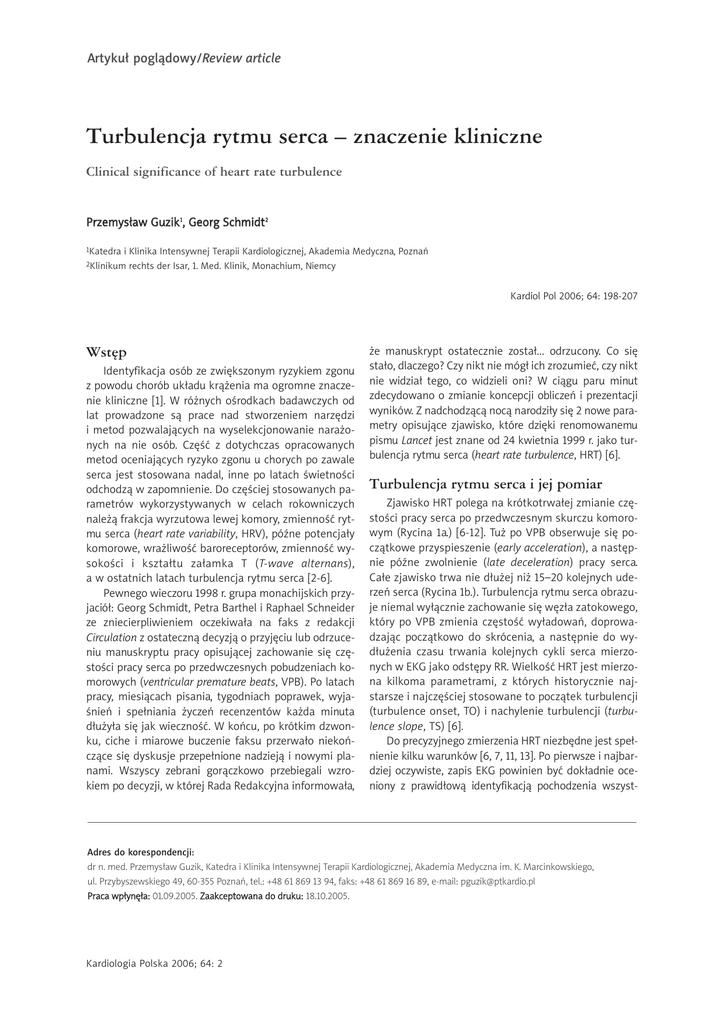 Artykuł poglądowy/Review article Turbulencja rytmu serca – znaczenie kliniczne Clinical significance of heart rate turbulence Przemysław Guzik1, Georg Schmidt2 1Katedra i Klinika Intensywnej Terapii Kardiologicznej, Akademia Medyczna, Poznań rechts der Isar, 1. Med. Klinik, Monachium, Niemcy 2Klinikum Kardiol Pol 2006; 64: 198-207 Wstęp Identyfikacja osób ze zwiększonym ryzykiem zgonu z powodu chorób układu krążenia ma ogromne znaczenie kliniczne [1]. W różnych ośrodkach badawczych od lat prowadzone są prace nad stworzeniem narzędzi i metod pozwalających na wyselekcjonowanie narażonych na nie osób. Część z dotychczas opracowanych metod oceniających ryzyko zgonu u chorych po zawale serca jest stosowana nadal, inne po latach świetności odchodzą w zapomnienie. Do częściej stosowanych parametrów wykorzystywanych w celach rokowniczych należą frakcja wyrzutowa lewej komory, zmienność rytmu serca (heart rate variability, HRV), późne potencjały komorowe, wrażliwość baroreceptorów, zmienność wysokości i kształtu załamka T (T-wave alternans), a w ostatnich latach turbulencja rytmu serca [2-6]. Pewnego wieczoru 1998 r. grupa monachijskich przyjaciół: Georg Schmidt, Petra Barthel i Raphael Schneider ze zniecierpliwieniem oczekiwała na faks z redakcji Circulation z ostateczną decyzją o przyjęciu lub odrzuceniu manuskryptu pracy opisującej zachowanie się częstości pracy serca po przedwczesnych pobudzeniach komorowych (ventricular premature beats, VPB). Po latach pracy, miesiącach pisania, tygodniach poprawek, wyjaśnień i spełniania życzeń recenzentów każda minuta dłużyła się jak wieczność. W końcu, po krótkim dzwonku, ciche i miarowe buczenie faksu przerwało niekończące się dyskusje przepełnione nadzieją i nowymi planami. Wszyscy zebrani gorączkowo przebiegali wzrokiem po decyzji, w której Rada Redakcyjna informowała, że manuskrypt ostatecznie został… odrzucony. Co się stało, dlaczego? Czy nikt nie mógł ich zrozumieć, czy nikt nie widział tego, co widzieli oni? W ciągu paru minut zdecydowano o zmianie koncepcji obliczeń i prezentacji wyników. Z nadchodzącą nocą narodziły się 2 nowe parametry opisujące zjawisko, które dzięki renomowanemu pismu Lancet jest znane od 24 kwietnia 1999 r. jako turbulencja rytmu serca (heart rate turbulence, HRT) [6]. Turbulencja rytmu serca i jej pomiar Zjawisko HRT polega na krótkotrwałej zmianie częstości pracy serca po przedwczesnym skurczu komorowym (Rycina 1a.) [6-12]. Tuż po VPB obserwuje się początkowe przyspieszenie (early acceleration), a następnie późne zwolnienie (late deceleration) pracy serca. Całe zjawisko trwa nie dłużej niż 15–20 kolejnych uderzeń serca (Rycina 1b.). Turbulencja rytmu serca obrazuje niemal wyłącznie zachowanie się węzła zatokowego, który po VPB zmienia częstość wyładowań, doprowadzając początkowo do skrócenia, a następnie do wydłużenia czasu trwania kolejnych cykli serca mierzonych w EKG jako odstępy RR. Wielkość HRT jest mierzona kilkoma parametrami, z których historycznie najstarsze i najczęściej stosowane to początek turbulencji (turbulence onset, TO) i nachylenie turbulencji (turbulence slope, TS) [6]. Do precyzyjnego zmierzenia HRT niezbędne jest spełnienie kilku warunków [6, 7, 11, 13]. Po pierwsze i najbardziej oczywiste, zapis EKG powinien być dokładnie oceniony z prawidłową identyfikacją pochodzenia wszyst- Adres do korespondencji: dr n. med. Przemysław Guzik, Katedra i Klinika Intensywnej Terapii Kardiologicznej, Akademia Medyczna im. K. Marcinkowskiego, ul. Przybyszewskiego 49, 60-355 Poznań, tel.: +48 61 869 13 94, faks: +48 61 869 16 89, e-mail: [email protected] Praca wpłynęła: 01.09.2005. Zaakceptowana do druku: 18.10.2005. Kardiologia Polska 2006; 64: 2 199 Turbulencja rytmu serca a VPB przerwa wyrównawcza RR–2 RR–1 RR1 RR2 czas sprzężenia b 1200 długość odstępu RR [ms] 1150 950 VPB późne zwolnienie 900 850 800 wczesne przyspieszenie 750 550 500 -3 -2 -1 0 1 2 3 4 5 6 7 8 9 10 11 12 13 14 15 16 pozycja odstępu RR względem VPB [#RR] Rycina 1. a): Przykładowy zapis EKG z VPB i określeniem pozycji kolejnych odstępów RR względem VPB – odstępy RR poprzedzające VPB są określone jako RR–2 i RR–1, natomiast następujące po VPB jako RR1 i RR2. b): Przykładowy tachogram czasu trwania odstępów RR względem VPB – zapis od osoby po zawale serca z niskim ryzykiem zgonu. Po VPB obserwuje się wczesne przyspieszenie depolaryzacji węzła zatokowego, tj. skrócenie czasu trwania kolejnych odstępów RR. Następnie dochodzi do zwolnienia depolaryzacji węzła zatokowego, czyli wydłużenia czasu trwania kolejnych odstępów RR kich pobudzeń. Należy odróżnić od siebie pobudzenia zatokowe, nadkomorowe, komorowe i wyzwolone przez stymulator, a także artefakty techniczne. W ocenie HRT uwzględniane są krótkie tachogramy złożone z 20 pobudzeń zatokowych otaczających VPB. Aby potencjalny tachogram został uwzględniony w analizie HRT, co najmniej 5 ewolucji przed i 15 po VPB musi być pochodzenia zatokowego. Oznacza to, że obecność choćby jednego niezatokowego skurczu lub artefaktu dyskwalifikuje dany tachogram z dalszej analizy HRT. Ponadto w celu ograniczenia ilości przypadkowo zakwalifikowanych pobudzeń niezatokowych stosuje się w ostatecznej analizie filtry usuwające zbyt krótkie lub zbyt długie odstępy RR. Dodatkowo w celu zakwalifikowania do analizy HRT danego tachogramu VPB musi mieć co najmniej 20% przedwczesności, z pauzą wyrównawczą dłuższą o co najmniej 20% od wartości odstępu referencyjnego. Ostatecznie wszystkie lokalne tachogramy odstępów RR wokół VPB kwalifikujące się do oceny HRT są uśredniane (Rycina 2.). W przypadku niespełnienia wymienionych kryteriów do analizy HRT mogą zostać nieprawidłowo zakwalifikowane pobudzenia, np. wtrącone VPB, które nie wyzwolą zjawiska turbulencji rytmu zatokowego (