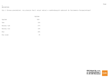 Page 1 WEIGHTING Pyt.1 Proszę powiedzieć, czy planuje Pan/i wziąć udział w nadchodzących wyborach do Parlamentu Europejskiego? Ogółem Ogolem 500 Tak 33% Raczej tak 27% Raczej nie 16% Nie 20% Nie wiem 3% GfK Polonia Sp. z o.o. ul. Smulikowskiego 4 PL-00-389 Warszawa Page 2 WEIGHTING Pyt.2 Proszę powiedzieć na kandydata której z wymienionych partii odda Pan/i swój glos? Ogółem Ogolem 500 Sojusz Lewicy DemokratycznejUnia Pracy 10% Platforma Obywatelska 49% Prawo i Sprawiedliwosc 24% Polskie Stronnictwo Ludowe 9% Porozumienie dla Przyszlosci CentroLewica 1% Libertas 0% Prawica Rzeczypospolitej 0% Samoobrona Rzeczypospolitej Polskiej 5% Unia Polityki Realnej 0% Inna partia 0% GfK Polonia Sp. z o.o. ul. Smulikowskiego 4 PL-00-389 Warszawa Page 3 WEIGHTING Pyt.3 A proszę powiedzieć na którego z kandydatów SLD-UP Pan/i zagłosuje? Ogółem Ogolem 52 ZEMKE Janusz Władysław 77% KRUSZYŃSKI Tomasz 0% MACKIEWICZ Anna Zofia 0% PAWLAK Stanisław 3% MAZUR Jan Benedykt 0% KUŹNIEWICZ Jacek 0% BRZOSKOWSKA Danuta Wioletta 1% NAJBERG Jarosław Przemysław 0% PAWŁOWSKI Roman Tadeusz 4% ZAWADZKI Jerzy 2% Nie wiem 13% GfK Polonia Sp. z o.o. ul. Smulikowskiego 4 PL-00-389 Warszawa Page 4 WEIGHTING Pyt.3 A proszę powiedzieć na którego z kandydatów PO Pan/i zagłosuje? Ogółem Ogolem ZWIEFKA Tadeusz Antoni 245 24% KOLASIŃSKI Marek Krzysztof 9% DOMBROWICZ Konstanty Adam 9% KOPYŚĆ Sławomir Andrzej 1% SZELIGA Sławomir Kazimierz 2% NOWAKOWSKA Aleksandra Bogumiła 6% KINDERMAN Andrzej 0% DUSZYŃSKI Leszek Marek 4% KANIA Barbara Danuta 3% DZIĘCIOŁ Janusz Andrzej 13% Nie wiem 30% GfK Polonia Sp. z o.o. ul. Smulikowskiego 4 PL-00-389 Warszawa Page 5 WEIGHTING Pyt.3 A proszę powiedzieć na którego z kandydatów PiS Pan/i zagłosuje? Ogółem Ogolem 120 CZARNECKI Richard Henry 25% PRZYBYLSKI Przemysław Tomasz 12% LATOS Tomasz Edward 5% CHMIELEWSKI Jarosław 4% STACHOWIAK Ireneusz 2% KACZMAREK-SŁAWIŃSKA Katarzyna Anna 17% ZAJĄKAŁA Jerzy 3% JEDYNAK Andrzej 1% TYBURSKI Jacek Aleksander 0% ĆWIEK Ryszard 2% Nie wiem 30% GfK Polonia Sp. z o.o. ul. Smulikowskiego 4 PL-00-389 Warszawa Page 6 WEIGHTING Pyt.3 A proszę powiedzieć na którego z kandydatów PSL Pan/i zagłosuje? Ogółem Ogolem 46 KŁOPOTEK Eugeniusz 60% PETRYKOWSKI Piotr Paweł 4% BOBER Ryszard Jakub 0% ZŁOTNIKIEWICZ Franciszek 0% KOZŁOWSKA Zofia Władysława 4% BARANOWSKI Krzysztof 2% ZAKRZEWSKA Edyta Lidia 11% SIERADZKI Andrzej Mikołaj 0% CIEŚLA Andrzej 0% OCZKOWSKA Silvana Jadwiga 3% Nie wiem 16% GfK Polonia Sp. z o.o. ul. Smulikowskiego 4 PL-00-389 Warszawa