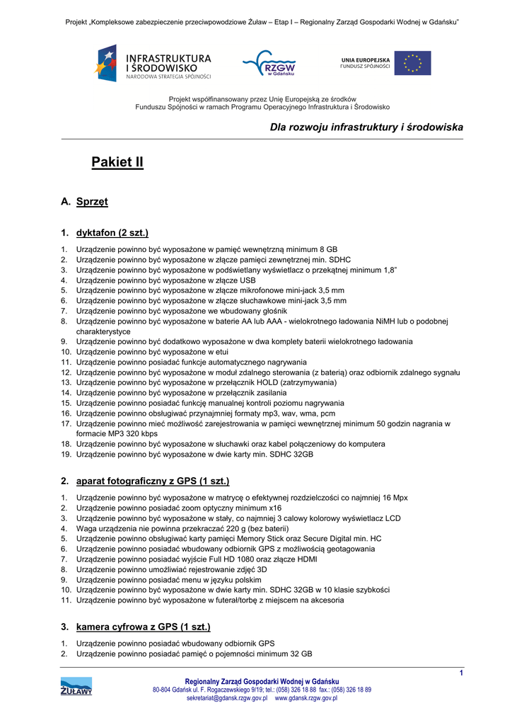 Projekt „Kompleksowe zabezpieczenie przeciwpowodziowe Żuław – Etap I – Regionalny Zarząd Gospodarki Wodnej w Gdańsku” Dla rozwoju infrastruktury i środowiska Pakiet II A. Sprzęt 1. dyktafon (2 szt.) 1. 2. 3. 4. 5. 6. 7. 8. 9. 10. 11. 12. 13. 14. 15. 16. 17. 18. 19. Urządzenie powinno być wyposażone w pamięć wewnętrzną minimum 8 GB Urządzenie powinno być wyposażone w złącze pamięci zewnętrznej min. SDHC Urządzenie powinno być wyposażone w podświetlany wyświetlacz o przekątnej minimum 1,8” Urządzenie powinno być wyposażone w złącze USB Urządzenie powinno być wyposażone w złącze mikrofonowe mini-jack 3,5 mm Urządzenie powinno być wyposażone w złącze słuchawkowe mini-jack 3,5 mm Urządzenie powinno być wyposażone we wbudowany głośnik Urządzenie powinno być wyposażone w baterie AA lub AAA - wielokrotnego ładowania NiMH lub o podobnej charakterystyce Urządzenie powinno być dodatkowo wyposażone w dwa komplety baterii wielokrotnego ładowania Urządzenie powinno być wyposażone w etui Urządzenie powinno posiadać funkcje automatycznego nagrywania Urządzenie powinno być wyposażone w moduł zdalnego sterowania (z baterią) oraz odbiornik zdalnego sygnału Urządzenie powinno być wyposażone w przełącznik HOLD (zatrzymywania) Urządzenie powinno być wyposażone w przełącznik zasilania Urządzenie powinno posiadać funkcję manualnej kontroli poziomu nagrywania Urządzenie powinno obsługiwać przynajmniej formaty mp3, wav, wma, pcm Urządzenie powinno mieć możliwość zarejestrowania w pamięci wewnętrznej minimum 50 godzin nagrania w formacie MP3 320 kbps Urządzenie powinno być wyposażone w słuchawki oraz kabel połączeniowy do komputera Urządzenie powinno być wyposażone w dwie karty min. SDHC 32GB 2. aparat fotograficzny z GPS (1 szt.) 1. 2. 3. 4. 5. 6. 7. 8. 9. 10. 11. Urządzenie powinno być wyposażone w matrycę o efektywnej rozdzielczości co najmniej 16 Mpx Urządzenie powinno posiadać zoom optyczny minimum x16 Urządzenie powinno być wyposażone w stały, co najmniej 3 calowy kolorowy wyświetlacz LCD Waga urządzenia nie powinna przekraczać 220 g (bez baterii) Urządzenie powinno obsługiwać karty pamięci Memory Stick oraz Secure Digital min. HC Urządzenie powinno posiadać wbudowany odbiornik GPS z możliwością geotagowania Urządzenie powinno posiadać wyjście Full HD 1080 oraz złącze HDMI Urządzenie powinno umożliwiać rejestrowanie zdjęć 3D Urządzenie powinno posiadać menu w języku polskim Urządzenie powinno być wyposażone w dwie karty min. SDHC 32GB w 10 klasie szybkości Urządzenie powinno być wyposażone w futerał/torbę z miejscem na akcesoria 3. kamera cyfrowa z GPS (1 szt.) 1. 2. Urządzenie powinno posiadać wbudowany odbiornik GPS Urządzenie powinno posiadać pamięć o pojemności minimum 32 GB 1 Regionalny Zarząd Gospodarki Wodnej w Gdańsku 80-804 Gdańsk ul. F. Rogaczewskiego 9/19; tel.: (058) 326 18 88 fax.: (058) 326 18 89 [email protected] www.gdansk.rzgw.gov.pl 3. 4. 5. 6. 7. Urządzenie powinno zapewniać możliwość nagrywania filmów video w standardzie High Definition, AVCHD (1920 x 1080, 1440 x 1080) Urządzenie powinno zapewniać możliwość nagrywania dźwięku w standardzie Dolby Digital 5.1 Urządzenie powinno posiadać funkcję filmowania w nocy Urządzenie powinno być wyposażone w wyświetlacz LCD o przekątnej minimum 3" Urządzenie powinno być wyposażone w futerał/torbę z miejscem na akcesoria 4. mobilny odbiornik GPS do zastosowań GIS (1 szt.) 1. 2. 3. 4. 5. 6. 7. 8. 9. 10. 11. 12. 13. 14. 15. Urządzenie powinno być wyposażone w system operacyjny zawierający aplikacje mobilne arkusz kalkulacyjny oraz edytor tekstu Urządzenie powinno być wyposażone w ekran o przekątnej minimum 3,5" i rozdzielczości VGA (480x640) Urządzenie powinno posiadać zintegrowany moduł komórkowy min. 2,5G z możliwością prowadzenia rozmów głosowych Urządzenie powinno posiadać minimum 6 GB wbudowanej pamięci wewnętrznej (nieulotnej) Urządzenie powinno posiadać minimum 128 MB wbudowanej pamięci operacyjnej Urządzenie powinno być wyposażone w gniazdo kart pamięci SD/SDHC oraz być wyposażone w kartę pamięci o poj. min. 4GB Urządzenie powinno posiadać zintegrowany moduł Wi-Fi w standardzie B/G Urządzenie powinno posiadać zintegrowany moduł Bletooth Urządzenie powinno posiadać zintegrowany cyfrowy aparat fotograficzny o matrycy co najmniej 5 Mpx z możliwością geotagowania Urządzenie powinno charakteryzować się wagą nie przekraczającą 600 g (z baterią) Urządzenie powinno być wyposażone w zintegrowaną antenę i odbiornik GPS o wysokiej czułości z obsługą SBAS Urządzenie powinno charakteryzować się dokładnością wyznaczania pozycji od 2 do 5 metrów w czasie rzeczywistym oraz dokładnością wyznaczania pozycji od 1 do 3 metrów w postprocessingu Odbiornik GPS urządzenia powinien wykorzystywać co najmniej 12 kanałów Urządzenie powinno zapewniać wsparcie dla protokołów NMEA i SIRF Urządzenie powinno być wyposażone w pokrowiec 2 Regionalny Zarząd Gospodarki Wodnej w Gdańsku 80-804 Gdańsk ul. F. Rogaczewskiego 9/19; tel.: (058) 326 18 88 fax.: (058) 326 18 89 [email protected] www.gdansk.rzgw.gov.pl
