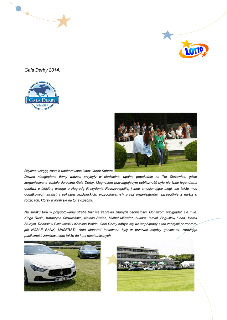 Gala Derby 2014. Błękitną wstęgą została udekorowana klacz Greek Sphere Dawno nieoglądane tłumy widzów przybyły w niedzielne, upalne popołudnie na Tor Służewiec, gdzie zorganizowana została doroczna Gala Derby. Magnesem przyciągającym publiczność była nie tylko legendarna gonitwa o błękitną wstęgę o Nagrodę Prezydenta Rzeczpospolitej i inne emocjonujące biegi, ale także moc dodatkowych atrakcji i pokazów jeździeckich, przygotowanych przez organizatorów, szczególnie z myślą o rodzicach, którzy wybrali się na tor z dziećmi. Na środku toru w przygotowanej strefie VIP nie zabrakło znanych osobistości. Gonitwom przyglądali się m.in. Kinga Rusin, Katarzyna Skowrońska, Natalia Siwiec, Michał Milowicz, Łukasz Jemioł, Bogusław Linda, Marek Siudym, Radoslaw Piwowarski i Karolina Wajda. Gala Derby odbyła się we współpracy z tak zacnymi partnerami jak NOBLE BANK, MASERATI. Auta Maserati testowane były w przerwie między gonitwami, zarażając publiczność zamiłowaniem także do koni mechanicznych. Dzięki oddaniu do użytku odrestaurowanej zabytkowej II Trybuny Toru Służewiec na obiekcie podczas całego wydarzenia mogło przebywać nawet do 15 tysięcy osób . Przebieg gonitw można było oglądać także na dużym telebimie, ustawionym tuż za zieloną bieżnią, w połowie ostatniej prostej. Napięcie sięgnęło zenitu, gdy tuż przed oczami widzów zaprezentowało się na bieżni 15 koni, zgłoszonych do jubileuszowej 70. gonitwy Derby na Torze Służewiec, obchodzącym w tym roku 75-lecie otwarcia (3. czerwca 1939). Gdy bomba poszła w górę i sędzia-starter wypuścił derbową piętnastkę rozległ się przeciągły okrzyk charyzmatycznego służewieckiego spikera Andrzeja Szydlika: Ruuuuuuuuuszyyyyyłyyyyy! Poprowadził umiarkowanym tempem końz nr. 1 Vif Garcon, co miało wpływ na końcową rozgrywkę. Ława koni wpadła na ostatnią prostą i rozpoczął się szaleńczy finisz, podczas którego górą były klacze. Wygrała trenowana przez Andrzeja Walickiego irlandzkiej hodowli Greek Sphere, której dosiadał czeski dżokej Tomáš Lukášek. Było to jego drugie zwycięstwo w tej gonitwiew Warszawie (przed trzema laty wygrał na Intensie). Jako druga niespodziewanie finiszowała niemiecka Dolomiti (tr. Grzegorz Wasążnik), a trzecia była brytyjska Zielona Herbatka (tr. Adam Wyrzyk). Totalizator Sportowy odnotował najlepszy wynik frekwencji na Gali DERBY w ostatnich sześciu latach. Przez cały dzień przewinęło się przez powracający do lat świetności Tor Służewiec aż 18 tysięcy ludzi. Gala Derby zakończyła pierwszą część sezonu wyścigowego 2014 na Służewcu. W niedzielę 27. VII. rozegrane zostaną Derby dla koni czystej krwi arabskiej.W sierpniu czekają nas Dzień Wenus – wyjątkowy dzień dla kobiet oraz Dzień Zjednoczonych Emiratów Arabskich – Abu Dhabi, który jest częścią Światowego Festiwalu Gonitw Płaskich Koni Arabskich Shejka Mansoora Bin Zayeda Al. Nahyana. Serdecznie zapraszamy.