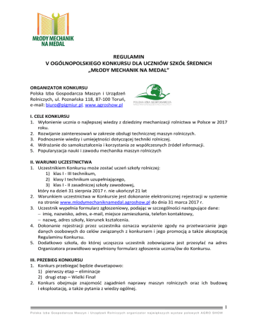REGULAMIN V OGÓLNOPOLSKIEGO KONKURSU DLA UCZNIÓW SZKÓŁ ŚREDNICH „MŁODY MECHANIK NA MEDAL” ORGANIZATOR KONKURSU Polska Izba Gospodarcza Maszyn i Urządzeń Rolniczych, ul. Poznańska 118, 87-100 Toruń, e-mail: [email protected], www.agroshow.pl I. CELE KONKURSU 1. Wyłonienie ucznia o najlepszej wiedzy z dziedziny mechanizacji rolnictwa w Polsce w 2017 roku. 2. Rozwijanie zainteresowań w zakresie obsługi technicznej maszyn rolniczych. 3. Podnoszenie wiedzy i umiejętności dotyczącej techniki rolniczej. 4. Wdrażanie do samokształcenia i korzystania ze współczesnych źródeł informacji. 5. Popularyzacja nauki i zawodu mechanika maszyn rolniczych II. WARUNKI UCZESTNICTWA 1. Uczestnikiem Konkursu może zostać uczeń szkoły rolniczej: 1) klas I - III technikum, 2) klasy I technikum uzupełniającego, 3) klas I - II zasadniczej szkoły zawodowej, który na dzień 31 sierpnia 2017 r. nie ukończył 21 lat 2. Warunkiem uczestnictwa w Konkursie jest dokonanie elektronicznej rejestracji w systemie na stronie www.mlodymechaniknamedal.agroshow.pl do dnia 31 marca 2017 r. 3. Uczestnik wypełnia formularz zgłoszeniowy, podając w szczególności następujące dane: imię, nazwisko, adres, e-mail, miejsce zamieszkania, telefon kontaktowy, nazwę, adres szkoły, kierunek kształcenia. 4. Dokonanie rejestracji przez uczestnika oznacza wyrażenie zgody na przetwarzanie jego danych osobowych do celów związanych z konkursem i jego promocją a także akceptację Regulaminu Konkursu. 5. Dodatkowo szkoła, do której uczęszcza uczestnik zobowiązana jest przesyłać na adres Organizatora prawidłowo wypełniony formularz zgłoszenia ucznia/ów do Konkursu. III. PRZEBIEG KONKURSU 1. Konkurs przebiegać będzie dwuetapowo: 1) pierwszy etap – eliminacje 2) drugi etap – Wielki Finał 2. Konkurs obejmuje znajomość zagadnień naprawy maszyn rolniczych oraz ich budowę i eksploatację, a także pytania z wiedzy ogólnej. 1 P o lsk a Izb a G o s p o d a r c za Ma s z yn i U r zą d ze ń R o l n i c zyc h o r g a n i za t o r n a j wi ęk s zy c h w ys t a w p o l o w yc h A G R O SH OW A. Eliminacje 3. Podczas eliminacji oceniana będzie wiedza teoretyczna uczestników. 4. Uczestnicy rozwiązywać będą trzy testy z wiedzy technicznej: pierwszy w okresie od 31 stycznia 2017 r. do 31 marca 2017 r., drugi w okresie od 1 kwietnia 2017 r. do 30 kwietnia 2017 r., natomiast trzeci w okresie od 1 maja 2017 r. do 31 maja 2017 r. 5. Zestaw testowy zawierać będzie 25 pytań jednokrotnego wyboru (tylko jedna odpowiedź z trzech możliwych jest poprawna). Na rozwiązanie każdego z testów uczestnik będzie miał 9 minut. Za każdą prawidłowo odpowiedź otrzymuje się 1 pkt. Po zakończeniu testu uczestnik uzyska informację o łącznej liczbie zdobytych punktów, bez odnoszenia ich do poszczególnych pytań. 6. Dobór zestawu pytań jest losowy. 7. Testy uczestnik rozwiązuje on-line po wcześniejszym zalogowaniu się na swoim koncie. Test zapisywany jest w systemie po jego ukończeniu. 8. W przypadku wylogowania się przed ukończeniem testu, nie jest on zapisywany i przy ponownym zalogowaniu uczestnik otrzymuje nowy zestaw pytań, a czas na rozwiązanie testu zostanie pomniejszony o ilość czasu, jaka upłynęła w trakcie poprzedniej próby. Maksymalna ilość prób (logowań) to 3, po przekroczeniu tej ilości uczestnik zostanie zdyskwalifikowany i nie będzie klasyfikowany. 9. Uczestnicy mogą na bieżąco sprawdzać swoje aktualne miejsce w rankingu. 10. Do finałów awansuje 10 uczestników zgłoszonych przez szkołę, którzy uzyskają najwięcej punktów z tym, że nie więcej niż 2 z tej samej szkoły. W przypadku zdobycia przez kilku uczestników takiej samej liczby punktów, o pozycji decyduje czas rozwiązywania testów. 11. Jeżeli po weryfikacji okaże się, że finalista nie spełnia warunków określonych w pkt II.1. zostanie on zdyskwalifikowany, nie będzie klasyfikowany a na jego miejsce wejdzie osoba, z kolejną najwyższą ilością punktów. B. Wielki Finał 12. Podczas finałów oceniane będą zarówno umiejętności praktyczne uczestników jak i ich wiedza teoretyczna. 13. Finały odbędą się podczas XIX Międzynarodowej Wystawy Rolniczej AGRO SHOW w Bednarach gm. Pobiedziska w piątek 22 września 2017 r. (tzw. „Dzień dla Szkół”). Uczestnik zobowiązany jest dojechać na teren wystawy wraz z opiekunem. 14. Dopuszcza się przeprowadzenie sprawdzianu praktycznego również w terminie wcześniejszym. 15. Podczas sprawdzianów finaliści będą równocześnie wykonywali czynności, oceniane i punktowane przez Komisję Konkursową. 16. Zwycięzcą Konkursu zostanie uczestnik, który uzyska największą liczbę punktów w finale. Następne pozycje zajmą uczestnicy z kolejną największą łączną liczbą punktów. Punkty z eliminacji nie będą uwzględniane. IV. KOMISJA KONKURSOWA Komisję Konkursową powołuje Organizator. V. NAGRODY 1. Nagrody dla uczestników: - 1 miejsce – stypendium w kwocie 2500 zł brutto (wypłacane przez 5 miesięcy po 500 zł) - 2 miejsce – stypendium w kwocie 2000 zł brutto (wypłacane przez 5 miesięcy po 400 zł) 2 P o lsk a Izb a G o s p o d a r c za Ma s z yn i U r zą d ze ń R o l n i c zyc h o r g a n i za t o r n a j wi ęk s zyc h w ys t a w p o l o w yc h A G R O SH OW - 3 miejsce – stypendium w kwocie 1500 zł brutto (wypłacane przez 5 miesięcy po 300 zł) 2. Dodatkowo przyznane zostaną również nagrody dla szkół, których uczniowie zajmą 1, 2 lub 3 miejsce w Konkursie w kwocie: - 1 miejsce – 3000 zł brutto - 2 miejsce – 2000 zł brutto - 3 miejsce – 1000 zł brutto 3. Organizator zastrzega sobie możliwość innego podziału lub zwiększenia ogólnej puli nagród oraz możliwość dodatkowego przyznania wyróżnień. 4. Uroczyste podsumowanie Konkursu oraz wręczenie nagród nastąpi podczas XIX Międzynarodowej Wystawy Rolniczej AGRO SHOW w piątek 22 września 2016 r. VI. POSTANOWIENIA KOŃCOWE 1