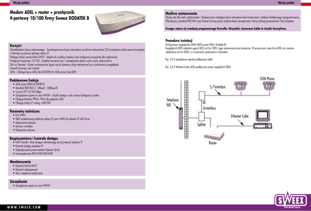 Wersja polska Modem ADSL + router + przełącznik 4-portowy 10/100 firmy Sweex DODATEK B Wersja polska Możliwe zastosowania Zbuduj sieć dla wielu użytkowników i błyskawicznie udostępnij łącze internetowe bez konieczności instalacji dodatkowego oprogramowania. Wbudowany standard PAT/NAT oraz firewall chronią przed użytkownikami zewnętrznymi, którzy próbują przeszukiwać Twój komputer. Uwaga: zaleca się instalację programowego firewalla. Wszystkie stosowane kable to skrętki dwużyłowe. Procedura instalacji Korzyści Współdzielenie łącza internetowego – Szerokopasmowe łącze internetowe umożliwia maksymalnie 253 komputerom jednoczesne korzystanie z Internetu za pomocą jednego adresu IP. Obsługa funkcji serwer/klient DHCP – Idealne do szybkiej instalacji oraz konfiguracji przyjaznej dla użytkownika. Przełącznik 4-portowy 10/100 – Szybkie tworzenie sieci i udostępnianie plików wielu innym użytkownikom. Dial on Demand – Router automatycznie loguje się do dostawcy usług internetowych po uruchomieniu przeglądarki. Firewall chroniący sieć intranet ADSL – Obsługa łącza ADSL dla DODATKU B, ADSL przez linię ISDN. Konfiguracja rozgałęźnika ISDN (ADSL przez ISDN, Dodatek B) Rozgałęźnik ISDN oddziela sygnał ADSL od linii ISDN. Jego zastosowanie jest konieczne. W przeciwnym razie linia ADSL nie zostanie oddzielona od linii ISDN, co uniemożliwi połączenie z Internetem. Rys. 2-3.3 przedstawia sposób podłączenia kabli. Rys. 2-3.3 Modem/router ADSL podłączony przez rozgałęźnik ISDN ISDN Phone Podstawowe funkcje • • • • • • ADSL przez ISDN DODATEK B Standard IEEE 802.3. 10Base-T, 100Base-TX 4 porty UTP 10/100 Mbps Zarządzanie oparte na sieci WWW – Szybki dostęp w celu zmiany konfiguracji routera Obsługa klientów PPPoE i PPoA dla połączeń xDSL Obsługa funkcji IP routing i NAT/PAT Parametry techniczne • • • • • Port WAN DMZ przekierowuje publiczne adresy IP portu WAN do adresów IP LAN Drive Mapowanie adresów Serwery wirtualne Połączenie mostowe S/T-interface Telephone NID NT U-interface Ethernet Cable Splitter Bezpieczeństwo i kontrola dostępu • • • • NAT Firewall – Brak dostępu internetowego do prywatnych adresów IP Kontrola dostępu pakietów IP Zabezpieczenie przed atakami hakerów (DoS) Uwierzytelnianie PAP/CHAP/MS-CHAP Monitorowanie • Dziennik klienta DHCP • Dziennik zabezpieczeń • Stan urządzenia/połączenia Zarządzanie • Zarządzanie oparte na sieci WWW W W W. S W E E X . C O M Router Wersja polska Szybka konfiguracja w systemach Windows 95, 98 i ME Wersja polska Bieżący adres IP to xxx.xxx.xxx.xxx. Kliknij przycisk ‘Zwolnij wszystko’. Spowoduje to zmianę adresu IP na 0.0.0.0 Aby móc przystąpić do konfiguracji routera, komputer musi być wstępnie skonfigurowany. Poniżej podano podstawowe czynności konfiguracyjne. Kliknij prawym przyciskiem myszy ‘Otoczenie sieciowe’ i wybierz ‘Właściwości’. Pojawi się okno ‘Sieć’, służące do konfiguracji parametrów sieci. Jeśli Twój komputer jest wyposażony w modem, w oknie tym pojawi się również karta Dial-Up, protokół TCP/IP karty Dial-Up oraz protokół NetBEUI. Następnie kliknij przycisk ‘Odnów wszystko’. Router przypisze adres IP. Następnie kliknij protokół ‘TCP/IP’ swojej karty sieciowej.Jeśli podano adres IP, kliknij opcję ‘Automatycznie uzyskaj adres IP’. Na tym kończy się podstawowa konfiguracja w systemach Windows 95, 98 i ME. W razie potrzeby usuń stare połączenie Dial-Up Twojego dostawcy usług internetowych. Teraz podłącz swój router szerokopasmowy do komputera; podłącz go do karty sieciowej za pomocą zwykłego (nieskrosowanego) kabla. Przejdź do menu ‘Start’ i kliknij ‘Uruchom’. Wpisz polecenie 'winipcfg' (bez cudzysłowu), a następnie wybierz swoją kartę sieciową w celu uzyskania informacji na jej temat. W W W. S W E E X . C O M Dołączona płyta CD-ROM zawiera dodatkowe informacje o zastosowaniach routera. Wersja polska Wersja polska Szybka konfiguracja w systemach Windows 2000 i XP Oprócz konfiguracji routera, najpierw wymagana jest konfiguracja kilku podstawowych ustawień komputera; w tym celu należy wykonać następujące czynności. Kliknij prawym przyciskiem myszy ‘Otoczenie sieciowe’ i wybierz ‘Właściwości’. Pojawi się okno ‘Sieć’, służące do konfiguracji parametrów sieci. Wybierz opcję ‘Protokół internetowy’ (TCP/IP) i kliknij ‘OK’. Teraz wpisz polecenie ‘Ipconfig/release’ i naciśnij ‘Enter’. Adres IP został odnowiony. Również w tym przypadku będzie on wyglądał następująco: 0.0.0.0. Teraz wpisz polecenie ‘Ipconfig/renew’ i naciśnij ‘Enter’. Zaznacz opcję ‘Uzyskaj adres IP automatycznie’ i kliknij przycisk ‘OK’. Router przypisze teraz nowy adres IP. UWAGA!! Następująca procedura spowoduje usunięcie wszystkich danych wprowadzonych do routera. Oznacza to konieczność ponownego wpisania nazwy użytkownika, hasła, adresów MAC i IP. W celu pełnego zresetowania routera należy nacisnąć długopisem przycisk reset i przytrzymać przez cztery sekundy. Wszystkie diody LAN 1 do 4 zgasną, informując o zakończeniu procedury resetowania. Ustawienia routera powrócą do wartości fabrycznych. Przy wpisywaniu poleceń nie dodawaj apostrofów!! Przejdź do menu ‘Start’, kliknij ‘Uruchom’ i wpisz ‘CMD’. Zatwierdź klawiszem ‘Enter’. Wpisz polecenie ‘Ipconfig’ i naciśnij ‘Enter’. W W W. S W E E X . C O M Konfiguracja routera Po zakończeniu konfiguracji sieciowej komputera możesz utworzyć połączenie internetowe. Uruchom przeglądarkę i wpisz następujący adres w pasku adresów: http://192.168.8.1 Naciśnij ‘Enter’.