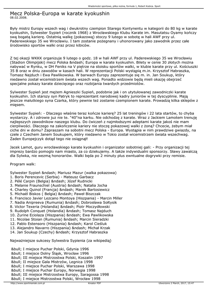 Wiadomości sportowe, piłka nożna, formuła 1, Robert Kubica. Sport Mecz Polska-Europa w karate kyokushin 08.02.2008. Były mistrz Europy wszech wag i dwukrotny czempion Starego Kontynentu w kategorii do 80 kg w karate kyokushin, Sylwester Sypień (rocznik 1968) z Wrocławskiego Klubu Karate im. Masutatsu Oyamy kończy swą bogatą karierę. Ostatnią walkę (pokazową) stoczy 9 lutego w sobotę w hali AWF przy ul. Paderewskiego 35 we Wrocławiu. I tam zostanie pożegnany i uhonorowany jako zawodnik przez całe środowisko sportów walki oraz przez kibiców. Z tej okazji WKKK organizuje 9 lutego o godz. 18 w hali AWF przy ul. Paderewskiego 35 we Wrocławiu (Stadion Olimpijski) mecz Polska – Europa w karate kyokushin. Bilety w cenie 30 złotych można nabywać w Rynku, w DH Feniks na V piętrze na stoisku sportów walki, w klubie karate przy ul. Kościuszki 35 B oraz w dniu zawodów w kasach hali. W reprezentacji Polski wystąpią m.in. Krzysztof Habraszka, Tomasz Najduch i Ewa Pawlikowska. W barwach Europy zaprezentuje się m. in. Jan Soukup, który niedawno został wicemistrzem świata wszech wag. Ponadto widzowie będą mieli okazję obejrzeć specjalne pokazy karate dziecięcego oraz rozbijania twardych przedmiotów. Sylwester Sypień jest mężem Agnieszki Sypień, podobnie jak i on utytułowanej zawodniczki karate kyokushin. Ich starszy syn Patryk to reprezentant narodowej kadry juniorów w tej dyscyplinie. Mają jeszcze malutkiego syna Czarka, który pewnie też zostanie czempionem karate. Prowadzą kilka sklepów z mięsem. Sylwester Sypień: - Dlaczego właśnie teraz kończe karierę? 25 lat treningów i 22 lata startów, to chyba wystarczy. A i zdrowie juz nie te. "40"na karku. Nie odchodzę z karate. Wraz z Jackiem Lamotem trenuję najlepszych zawodnikow naszego klubu. Do ćwiczeń z najmłodszymi adeptami karate jakoś nie mam cierpliwości. Dlaczego na zakończenie kariery nie stoczę pokazowej walki z żoną? Chcecie, żebym miał ciche dni w domu? Zapraszam na sobotni mecz Polska - Europa. Wystąpia w nim prawdziwe gwiazdy, na czele z Czechem Janem Soukupem, który niedawno w Tokio został wicemistrzem świata wszechwag. Żaden Europejczyk dotąd tego nie osiągnął! Jacek Lamot, guru wrocławskiego karate kyokushin i organizator sobotniej gali: - Przy organizacji tej imprezy bardzo pomoglo nam miasto, za co dziekujemy. A także indywidualni sponsorzy. Sławy zawalczą dla Sylwka, nie wezmą honorariów. Walki będa po 2 minuty plus ewntualne dogrywki przy remisie. Program walk: Sylwester Sypień – Mariusz Mazur (walka pokazowa) 1. Boris Perencevic (Serbia) - Mateusz Garbacz 2. Pélé Carpin (Belgia) – Józef Rudnicki 3. Melanie Fraunschiel (Austria) – Natalia Jocha 4. Charley Quinol (Francja) – Marek Bartosiewicz 5. Michaël Biskos ( Belgia) – Paweł Biszczak 6. Francisco Javier Lezcano Montoya (Hiszpania) - Marcin Miller 7. Nadia Anipreeva (Rumunia) – Dobrosława Sołtysik 8. Victor Texeria (Holandia) – Piotr Moczydłowski 9. Rudolph Conquet (Holandia) – Tomasz Najduch 10. Zurine Eciolaza (Hiszpania) – Ewa Pawlikowska 11. Nicolae Stoian (Rumunia) – Marcin Sieradzki 12. Pablo Estensoro (Hiszpania) – Karol Cieśluk 13. Alejandro Navarro (Hiszpania) – Michał Krzak 14. Jan Soukup (Czechy) – Krzysztof Habraszka Najważniejsze sukcesy Sylwestra Sypienia (za wikipedią) • • • • • • • • I miejsce Puchar Polski, Gdynia 1996 I miejsce Dolny Śląsk, Wrocław 1996 III miejsce Mistrzostwa Polski, Koszalin 1997 II miejsce Gala Mistrzów, Legnica 1998 I miejsce Puchar Polski, Warszawa 1998 I miejsce Puchar Europy, Norwegia 1998 III miejsce Mistrzostwa Europy, Saragossa 1998 I miejsce Mistrzostwa Polski, Wrocław 1998 http://www.sportmaniak.com.pl Kreator PDF Utworzono 2 March, 2017, 15:47 Wiadomości sportowe, piłka nożna, formuła 1, Robert Kubica. Sport • • • • • • • • • • • • • • • • • • • • • II miejsce Europejski Turniej Mistrz. Warszawa 1998 I miejsce Mistrzostwa Polski, Siedlce 1999 I miejsce Ogólnopolski Turniej Open, Sieradz 1999 I miejsce Mistrzostwa Dolnego Śląska, Ząbkowice Śl. 1999 Udział w Mistrzostwach Świata III miejsce Puchar Europy, Bergen 2000 I miejsce Mistrzostwa Dolnego Śląska, Opole 2000 III miejsce Mistrzostwa Europy, Portugalia 2000 II miejsce Mistrzostwa Polski, Kielce 2000 III miejsce Mistrzostwa Polski Wszechwag, Wrocław 2000 I miejsce Mistrzostwa Europy Wszechwag, Katowice 2000 I miejsce XXVIII Mistrzostwa Polski, Krosno 2001 I miejsce Mistrzostwa Europy (wagowe), Węgry 2001 II miejsce Mistrzostwa Polski Open, Kielce 2001 III miejsce Mistrzostwa Europy Wszechwag, Wrocław 2002 I miejsce Mistrzostwa Polski, Warszawa 2003 I miejsce XVII Wagowe Mistrzostwa Europy, Użhorod (Ukraina) 2003 I miejsce Mistrzostwa Dolnego Śląska, Legnica 2004 III miejsce Mistrzostwa Europy Open, Warszawa 2004 V miejsce Mistrzostwa Ameryk, Nowy Jork 2005 I miejsce Mistrzostwa Polski, Katowice 2006 http://www.sportmaniak.com.pl Kreator PDF Utworzono 2 March, 2017, 15:47