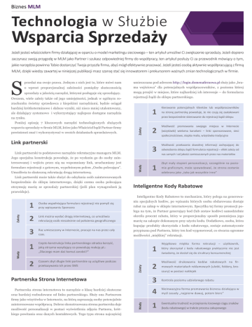 Biznes MLM Technologia w Służbie Wsparcia Sprzedaży Jeżeli jesteś właścicielem firmy działającej w oparciu o model marketingu sieciowego – ten artykuł umożliwi Ci zwiększenie sprzedaży. Jeżeli dopiero zaczynasz swoją przygodę w MLM jako Partner i szukasz odpowiedniej firmy do współpracy, ten artykuł posłuży Ci za przewodnik mówiący o tym, jakie narzędzia powinna Tobie dostarczyć Twoja przyszła firma, abyś mógł efektywnie pracować. Jeżeli jesteś osobą aktywnie współpracującą z firmą MLM, dzięki wiedzy zawartej w niniejszej publikacji masz szansę stać się innowatorem i prekursorem ważnych zmian technologicznych w firmie. S przedaż ma swoje prawa. Jednym z nich jest to, które mówi nam umieszczana pod adresem http://login.domenafirmowa.pl służy jako „bra- o wprost proporcjonalnej zależności pomiędzy skutecznością ma wejściowa” dla potencjalnych współpracowników, z poziomu której sprzedaży a jakością narzędzi, którymi posługuje się sprzedający. mogą przejść w miejsce, które najbardziej ich interesuje – do formularza Owszem, wiele zależy także od jego umiejętności, jednak w ogólnym ro- rejestracji bądź do sklepu partnerskiego. zrachunku świetny sprzedawca z kiepskimi narzędziami, będzie osiągał bardziej krótkoterminowe i słabsze wyniki, niż nieco mniej utalentowany, ale działający systemowo i wykorzystujący najlepsze dostępne narzędzia na rynku. 1 Kierowanie potencjalnych klientów lub współpracowników 2 Możliwość promowania swojego miejsca w Internecie 3 Możliwość przekazania dowolnej informacji zachęcającej do powinieneś znać i wykorzystywać w swoich działaniach sprzedażowych. Zalety Poniżej opisuję 7 kluczowych narzędzi technologicznych służących wsparciu sprzedaży w firmie MLM, które jako Właściciel bądź Partner firmy Link partnerski Link partnerski to podstawowe narzędzie rekrutacyjne managera MLM. Jego specjalna konstrukcja powoduje, że po wysłaniu go do osoby zainformularz rejestracji z gotowym, wypełnionym polem „Osoba polecająca”. Umożliwia to skuteczną rekrutację drogą internetową. Wady teresowanej i wejściu przez nią na wspomniany link, uruchamiany jest 1 na stronę partnerską powoduje, że nie czują się zaatakowani przez bezpośrednie skierowanie do rejestracji bądź sklepu (wizytówki) wieloma kanałami – linki sponsorowane, sieci społecznościowe, stopka maila, wizytówka tradycyjna odwiedzenia sklepu bądź formularza rejestracji – efekt zależy od nas samych i od jakości zamieszczonych przez nas materiałów Zbyt mały stopień personalizacji, szczególnie na poziomie graficznym, może spowodować, że strona zostanie odebrana jako „taka jak wszystkie inne” Link partnerski może także służyć do odsyłania osób zainteresowanych bezpośrednio do sklepu internetowego, dzięki czemu osoba polecająca otrzymuję marżę ze sprzedaży partnerskiej (jeśli plan wynagrodzeń ją Inteligentne Kody Rabatowe przewiduje). 1 Osoba wypełniająca formularz rejestracji nie pomyli się przy wpisywaniu Sponsora 2 Link można wysłać drogą internetową, co umożliwia rekrutację osób niezależnie od położenia geograficznego 3 Raz umieszczony w Internecie, pracuje na nas przez cały czas. 1 Często konstrukcja linka partnerskiego zdradza korzyść, jaką otrzyma wysyłający co powoduję reakcję pt.: „Dlaczego mam dać komuś zarobić?” 2 Czasem zbyt długie linki partnerskie są uciążliwe podczas przekazywania ich przez SMS rabat na zakup w sklepie internetowym. Specyfika tej formy promocji polega na tym, że Partner generujący kod (lub zestaw kodów) samodzielnie określa procent rabatu, który w proporcjonalny sposób pomniejsza jego marżę na zakupie dokonanym przy użyciu kodu. Dodatkowo, osoba, która kupując produkty skorzystała z kodu rabatowego, zostaje automatycznie przypisana pod Partnera, który ten kod wygenerował, co stwarza ogromne możliwości „miękkiej” rekrutacji. 1 Zalety Wady Zalety Inteligentne Kody Rabatowe to mechanizm, który polega na generowaniu specjalnych kodów, po wpisaniu których osoba obdarowana dostaje 3 4 Partnerska Strona Internetowa Partnerska strona internetowa to narzędzie o klasę bardziej skuteczne oraz bardziej rozbudowane od linku partnerskiego. Służy ona Partnerom możliwość personalizacji w postaci wyświetlenia zdjęcia Partnera, krótkiego powitania oraz danych kontaktowych. Tego typu strona najczęściej Wady firmy jako wizytówka w Internecie, na którą zapraszają osoby potencjalnie zainteresowane współpracą. Dobrze skonstruowana strona partnerska daje 2 1 Wyjątkowo miękka forma rekrutacji – użytkownik, który skorzystał z kodu rabatowego praktycznie nie jest świadomy, że dostał się do struktury konsumenckiej Możliwość drukowania kodów rabatowych na firmowych materiałach reklamowych (ulotki, foldery, broszury) w postaci naklejek Kontrola poziomu udzielanego rabatu Nieinwazyjna forma promowania biznesu działająca w myśl zasady „najpierw dawaj, potem bierz” Ewentualna trudność w przepisaniu losowego ciągu znaków (kodu rabatowego) w trakcie procesu zakupowego Biznes MLM System Bannerów Partnerskich System Bannerów Partnerskich daje nam możliwości wynikające z synergii programów afiliacyjnych i marketingu wielopoziomowego. Firma przygotowuje zestawy różnego rodzaju bannerów reklamowych - Partner może pobrać kod odpowiedzialny za wyświetlenie każdego z bannerów i wklejać go wszędzie tam, gdzie chciałby promować biznes, w którym uczestniczy: na forach, w stopce maila, blogu, stronie www czy sieciach aktywność/kwalifikację. Na podstawie tak zdefiniowanego koszyka system informatyczny firmy składa automatyczne zamówienie każdego miesiąca rozliczeniowego. Płatność za takie zamówienie pobierana jest z prowizji bądź automatycznie z wcześniej wprowadzonej karty kredytowej. Dzięki temu zabiegowi sprzedaż w MLM p