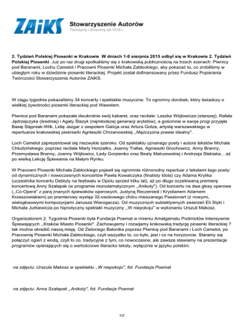 2. Tydzień Polskiej Piosenki w Krakowie W dniach 1-8 sierpnia 2015 odbył się w Krakowie 2. Tydzień Polskiej Piosenki. Już po raz drugi spotkaliśmy się z krakowską publicznością na trzech scenach: Piwnicy pod Baranami, Lochu Camelot i Pracowni Piosenki Michała Zabłockiego, aby pokazać to, co zrobiliśmy w ubiegłym roku w dziedzinie piosenki literackiej. Projekt został dofinansowany przez Fundusz Popierania Twórczości Stowarzyszenia Autorów ZAiKS. W ciągu tygodnia pokazaliśmy 34 koncerty i spektakle muzyczne. To ogromny dorobek, który świadczy o wielkiej żywotności piosenki literackiej pod Wawelem. Piwnica pod Baranami pokazała dwukrotnie swój kabaret, oraz recitale: Leszka Wójtowicza (starszej), Rafała Jędrzejczyka (średniej) i Agaty Ślazyk (najmłodszej generacji arytstów), a gościnnie w swoje progi przyjęła Basię Stępniak-Wilk, Lidię Jazgar z zespołem Galicja oraz Artura Gotza, artystę warszawskiego w repertuarze krakowskiej pieśniarki Agnieszki Chrzanowskiej ,,Mężczyzna prawie idealny''. Loch Camelot zaprezentował się niezwykle szeroko. Od spektaklu uznanego poety i autora tekstów Michała Chludzińskiego, poprzez recitale Marty Honzatko, Joanny Trafas, Agnieszki Grochowicz, Anny Branny, Przemysława Branny, Joanny Wójtowicz, Łady Gorpienko oraz Beaty Malczewskiej i Andrzeja Słabiaka... aż po wielką Lekcję Śpiewania na Małym Rynku. W Pracowni Piosenki Michała Zabłockiego pojawił się ogromnie różnorodny repertuar z tekstami tego poety: od dynamicznych i nowoczesnych koncertów Pawła Kowalczyka (finalisty Idola) czy Adama Krylika (uczestnika koncertu Debiuty na festiwalu w Opolu sprzed kilku lat), aż po długo oczekiwaną premierę koncertową Anny Szałapak (w programie monotematycznym ,,Anikoty''). Od koncertu na dwa głosy operowe (,,Co-Opera'' z parą znanych śpiewaków operowych, Justyną Reczeniedi i Krystianem Adamem Krzeszowiakiem) po premierowy występ 32-osobowego chóru mieszanego Passionart (z nowymi, wielogłosowymi kompozycjami Janusza Wierzgacza). Od muzycznych subiektywnych zwierzeń Eli Styki i Michała Jurkiewicza po hipnotyczny spektakl muzyczny ,,W niepokoju'' w wykonaniu Urszuli Makosz. Organizatorem 2. Tygodnia Piosenki była Fundacja Poemat w imieniu Amalgamatu Podmiotów Intensywnie Śpiewających ,,Kraków Miasto Piosenki''. Zachowujemy i rozwijamy krakowską tradycję piosenki literackiej ? tak można określić naszą misję. Od Zielonego Balonika poprzez Piwnicę pod Baranami i Loch Camelot, po Pracownię Piosenki Michała Zabłockiego, czyli wszystko to, co było, jest i co na horyzoncie. Staramy się połączyć ogień z wodą, czyli to co, tradycyjne z tym, co nowoczesne, ale zawsze stawiamy na prezentacje programów opierających się o wartościowe literacko teksty, wyłącznie w języku polskim. na zdjęciu: Urszula Makosz w spektaklu ,,W niepokoju'', fot. Fundacja Poemat na zdjęciu: Anna Szałapak ,,Anikoty'', fot. Fundacja Poemat 1/2 na zdjęciu:Koncert chóru Passionart, fot. Fundacja Poemat na zdjęciu: Kovalczyk ,,Turlaj się'', fot. Fundacja Poemat Wszelkie prawa zastrzeżone 2017 ZAiKS / data wygenerowania strony 02.03.2017 16:43:38 PDF ze strony: http://www.zaiks.org.pl/1007,111,2_tydzien_polskiej_piosenki_w_krakowie 2/2