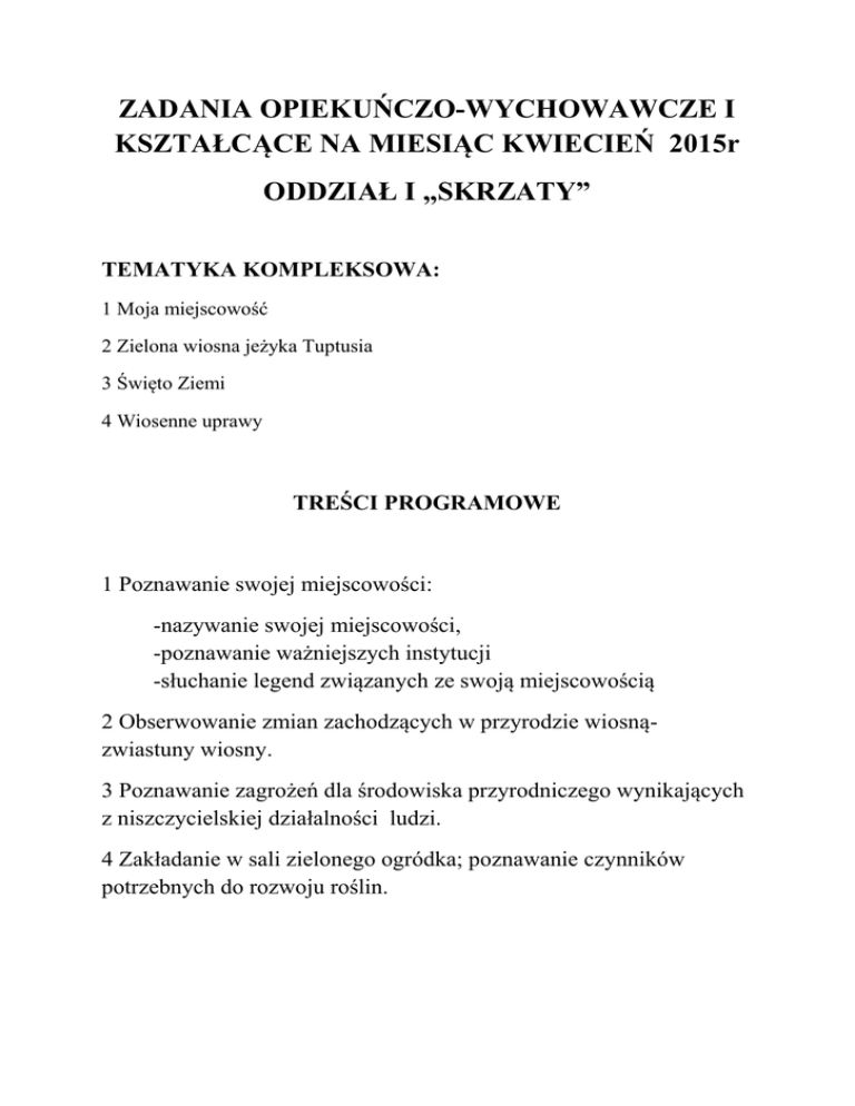ZADANIA OPIEKUŃCZO-WYCHOWAWCZE I KSZTAŁCĄCE NA MIESIĄC KWIECIEŃ 2015r ODDZIAŁ I ,,SKRZATY” TEMATYKA KOMPLEKSOWA: 1 Moja miejscowość 2 Zielona wiosna jeżyka Tuptusia 3 Święto Ziemi 4 Wiosenne uprawy TREŚCI PROGRAMOWE 1 Poznawanie swojej miejscowości: -nazywanie swojej miejscowości, -poznawanie ważniejszych instytucji -słuchanie legend związanych ze swoją miejscowością 2 Obserwowanie zmian zachodzących w przyrodzie wiosnązwiastuny wiosny. 3 Poznawanie zagrożeń dla środowiska przyrodniczego wynikających z niszczycielskiej działalności ludzi. 4 Zakładanie w sali zielonego ogródka; poznawanie czynników potrzebnych do rozwoju roślin. UCZYMY SIĘ WIERSZA ,,PORTRET WIOSNY” Oto wiosna na obrazku. Grzeje uszy w słońcu blasku. Kwiat jej zakwitł na sukience I na nosie I na ręce. Szpak jej w bucie gniazdo uwił, choć o gnieździe nic nie mówił. A na palcu Siadł skowronek I wygląda jak pierścionek UCZYMY SIĘ PIOSENKI ,, TO JUŻ WIOSNA” Dziś w przedszkolu kwiatów tyle, Tulipany i żonkile. Mały jeż otworzył oczy I do dzieci śmiało kroczy. Refren Nasz jeżyku, to już wiosna! Ona kwiaty nam przyniosła. Słońce mocniej zaświeciło I przyrodę obudziło. Drzewa już puszczają pąki, Brzęczą muszki, pszczoły, bąki. Słychać w dali śpiew skowronka, Grzeje ciepły promień słonka. Refren Nasz jeżyku… Zimne wiatry już nie wieją. Dzieci się radośnie śmieją. Tak zielono, kolorowo! To już wiosna, daję słowo