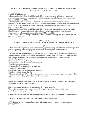PROCEDURA ORGANIZOWANIA POMOCY PSYCHOLOGICZNO -PEDAGOGICZNEJ W ZESPOLE SZKÓŁ W DARZLUBIU. PODSTAWA PRAWNA 1. Rozporządzenie MEN z dnia 30 kwietnia 2013r. w sprawie zasad udzielania i organizacji pomocy psychologiczno- pedagogicznej w publicznych przedszkolach, szkołach i placówkach (Dz. U. z 2013r., poz. 532). 2. Rozporządzenie MEN z dnia 2 sierpnia 2013r. w sprawie warunków organizowania kształcenia, wychowania i opieki dla dzieci i młodzieży niepełnosprawnych oraz niedostosowanych społecznie w przedszkolach, szkołach i oddziałach ogólnodostępnych lub integracyjnych (Dz. U z 2013r., poz. 957). 3. Rozporządzenie MEN z dnia 25 kwietnia 2013r. w sprawie warunków i sposobu oceniania, klasyfikowania i promowania uczniów i słuchaczy oraz przeprowadzania sprawdzianów i egzaminów w szkołach publicznych (Dz. U. z 2013r., poz. 520). 4. Art. 22 ust. 2 pkt 11 Ustawy z 7 września 1991r. o systemie oświaty (Dz. U. z 2004r., Nr 256, poz. 2572, z późn. zm.) ROZDZIAŁ I ZASADY ORGANIZACJI POMOCY PSYCHOLOGICZNO -PEDAGOGICZNEJ §1 1. Szkoła udziela i organizuje uczniom uczęszczającym do szkoły, ich rodzicom oraz nauczycielom pomoc psychologiczno- pedagogiczną na zasadach określonych w rozporządzeniu. 2. Pomoc psychologiczno -pedagogiczna udzielana uczniowi w szkole polega na rozpoznawaniu i zaspokajaniu indywidualnych potrzeb rozwojowych i edukacyjnych ucznia oraz rozpoznawaniu indywidualnych możliwości psychofizycznych ucznia, wynikających w szczególności: 1) z niepełnosprawności, 2) z niedostosowania społecznego, 3) z zagrożenia niedostosowaniem społecznym, 4) ze szczególnych uzdolnień, 5) ze specyficznych trudności w uczeniu się, 7) z choroby przewlekłej, 8) z sytuacji kryzysowych lub traumatycznych, 9) z niepowodzeń edukacyjnych, 10) z zaniedbań środowiskowych związanych z sytuacją bytową ucznia i jego rodziny, sposobem spędzania czasu wolnego, kontaktami środowiskowymi. 3. Pomoc psychologiczno-pedagogiczna udzielana w szkole rodzicom i nauczycielom polega na wspieraniu rodziców i nauczycieli w: a) rozwiązywaniu problemów wychowawczych i dydaktycznych, b) rozwijaniu umiejętności wychowawczych w celu zwiększania efektywności pomocy psychologiczno-pedagogicznej dla uczniów. 4. Korzystanie z pomocy psychologiczno-pedagogicznej w szkole jest dobrowolne i nieodpłatne. 5. Dyrektor szkoły organizuje pomoc psychologiczno-pedagogiczną. 6. Wychowawca klasy planuje i koordynuje udzielanie uczniowi pomocy psychologicznopedagogicznej. 7. Pedagog wspiera nauczycieli i innych specjalistów w udzielaniu pomocy psychologicznopedagogicznej. 8. Pomocy psychologiczno-pedagogicznej w szkole udzielają uczniom nauczyciele oraz specjaliści, wykonujący w szkole zadania z zakresu pomocy psychologiczno- pedagogicznej. 9. Pomoc psychologiczno-pedagogiczna jest organizowana i udzielana we współpracy z: 1) rodzicami uczniów, 2) poradniami psychologiczno-pedagogicznymi, w tym poradniami specjalistycznymi, 10. Pomoc psychologiczno -pedagogiczna w szkole jest udzielana z inicjatywy: 1) ucznia, 2) rodziców ucznia, 3) dyrektora szkoły, 4) nauczyciela lub specjalisty, prowadzących zajęcia z uczniem, 6) poradni, 9) pracownika socjalnego, 10) asystenta rodziny, 11) kuratora sądowego. 11. Osoby wskazane w § 1 ust. 10 pkt 2,4 i 6 składają wniosek w sprawie objęcia ucznia pomocą psychologiczno-pedagogiczną do dyrektora szkoły (załącznik nr 1) §2 FORMY UDZIELANEJ POMOCY 1. W szkole pomoc psychologiczno- pedagogiczna jest udzielana w trakcie bieżącej pracy z uczniami oraz w formie: 2) zajęć rozwijających uzdolnienia, 3) zajęć dydaktyczno- wyrównawczych/ korekcyjno- kompensacyjnych 4) zajęć specjalistycznych: logopedycznych, o charakterze terapeutycznym, 5) warsztatów, 6) porad i konsultacji. 2. W szkole pomoc psychologiczno-pedagogiczna jest udzielana rodzicom uczniów i nauczycielom w formie porad, konsultacji, warsztatów i szkoleń. §3 DZIAŁANIA NAUCZYCIELI I SPECJALISTÓW 1. Porady, konsultacje, warsztaty i szkolenia prowadzą nauczyciele i specjaliści. 2. Nauczyciele oraz specjaliści w szkole rozpoznają odpowiednio indywidualne potrzeby rozwojowe i edukacyjne oraz indywidualne możliwości psychofizyczne uczniów, w tym ich zainteresowania i uzdolnienia. 3. Nauczyciele i specjaliści w szkole prowadzą w szczególności: 1) obserwację pedagogiczną, w trakcie bieżącej pracy z uczniami, mającą na celu rozpoznanie u uczniów: a) trudności w uczeniu się, b) szczególnych uzdolnień, c) wystąpienia ryzyka specyficznych trudności w uczeniu się –klas I-III. 4. W przypadku stwierdzenia, że uczeń ze względu na potrzeby rozwojowe lub edukacyjne oraz możliwości psychofizyczne wymaga objęcia pomocą psychologiczno pedagogiczną,odpowiednio nauczyciel lub specjalista niezwłocznie udzielają uczniowi tej pomocy w trakcie bieżącej pracy z uczniem i informują o tym wychowawcę klasy. ROZDZIAŁ II ZADANIA DYREKTORA §4 1. Dyrektor szkoły organizuje pomoc psychologiczno-pedagogiczną, w szczególności: 1) ustala wymiar godzin poszczególnych form pomocy psychologiczno -pedagogicznej, biorąc pod uwagę wszystkie godziny, które w danym w roku szkolnym mogą być przeznaczone na realizację tych form. ROZDZIAŁ III ZADANIA WYCHOWAWCY §5 1.Planuje i koordynuje udzielanie uczniowi pomocy psychologiczno-pedagogicznej, uwzględniając zalecenia zawarte w orzeczeniach o potrzebie indywidualnego nauczania i opiniach poradni. 2. Informuje innych nauczycieli lub specjalistów o potrzebie objęcia ucznia pomocą psychologiczno-pedagogiczną. 3. Ustala formy udzielania pomocy psychologiczno-pedagogicznej, okres ich udzielania oraz wymiar godzin, w którym poszczególne formy będą realizowane, z zastrzeżeniem § 4 ust. 1 pkt 1. 4. Sporządza wykaz uczniów objętych pomocą psychologiczno-pedagogiczną swojej klasy po wcześniejszych konsultacjach z dyrektorem szkoły, innymi nauczycielami i specjalistami (załącznik 3). 5. Współprac