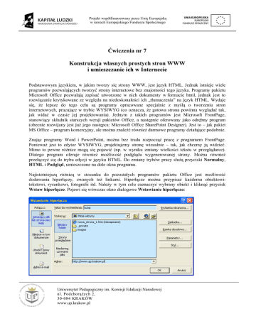 Projekt współfinansowany przez Unię Europejską w ramach Europejskiego Funduszu Społecznego Ćwiczenia nr 7 Konstrukcja własnych prostych stron WWW i umieszczanie ich w Internecie Podstawowym językiem, w jakim tworzy się strony WWW, jest język HTML. Jednak istnieje wiele programów pozwalających tworzyć strony internetowe bez znajomości tego języka. Programy pakietu Microsoft Office pozwalają zapisać utworzone w nich dokumenty w formacie html, jednak jest to rozwiązanie krytykowane ze względu na niedoskonałości ich „tłumaczenia” na język HTML. Wydaje się, że lepsze do tego celu są programy opracowane specjalnie z myślą o tworzeniu stron internetowych, pracujące w trybie WYSIWYG (co oznacza, że gotowa strona powinna wyglądać tak, jak widać w czasie jej projektowania). Jednym z takich programów jest Microsoft FrontPage, stanowiący składnik starszych wersji pakietów Office, a następnie oferowany jako odrębny program (obecnie rozwijany jest już jego następca: Microsoft Office SharePoint Designer). Jest to – jak pakiet MS Office – program komercyjny, ale można znaleźć również darmowe programy działające podobnie. Znając programy Word i PowerPoint, można bez trudu rozpocząć pracę z programem FrontPage. Ponieważ jest to edytor WYSIWYG, projektujemy stronę wizualnie – tak, jak chcemy ją widzieć. Mimo to pewne różnice mogą się pojawić (np. w wyniku zmiany wielkości tekstu w przeglądarce). Dlatego program oferuje również możliwość podglądu wygenerowanej strony. Można również przełączyć się do trybu edycji w języku HTML. Do zmiany trybów pracy służą przyciski Normalny, HTML i Podgląd, umieszczone na dole okna programu. Najistotniejszą różnicą w stosunku do pozostałych programów pakietu Office jest możliwość dodawania hiperłączy, zwanych też linkami. Hiperłącze można przypisać każdemu obiektowi: tekstowi, rysunkowi, fotografii itd. Należy w tym celu zaznaczyć wybrany obiekt i kliknąć przycisk Wstaw hiperłącze. Pojawi się wówczas okno dialogowe Wstawianie hiperłącza: Uniwersytet Pedagogiczny im. Komisji Edukacji Narodowej ul. Podchorążych 2, 30-084 KRAKÓW www.up.krakow.pl Projekt współfinansowany przez Unię Europejską w ramach Europejskiego Funduszu Społecznego W oknie tym możemy określić, do jakiej strony ma prowadzić nasz link. Może to być strona istniejąca w sieci, np. www.ap.krakow.pl, ale może to być również inna tworzona przez nas strona, jeszcze nie umieszczona w sieci (np. link może prowadzić od naszej strony głównej do następnej naszej strony, a strony te właśnie opracowujemy). Można również umieścić link do innego miejsca w tworzonym dokumencie (np. powrót na górę strony). Hiperłącze może również stanowić adres e-mail. Wszystkie opcje są widoczne w omawianym oknie dialogowym. Uwaga: Przy wskazywaniu innej tworzonej strony (stanowiącej zawsze odrębny plik htm) należy zwrócić uwagę, by nie wskazywać pełnej ścieżki dostępu, np. C:\nasz_katalog_www\strona2.htm – należy wskazać jedynie strona2.htm. W przeciwnym wypadku łącze nie będzie prowadziło do strony umieszczonej później w Internecie, lecz na nasz dysk C. Należy również zwrócić uwagę, by plik stanowiący naszą stronę startową miał nazwę index.html. Po opracowaniu stron internetowych należy umieścić je w sieci, czyli na wybranym serwerze. Do tego celu służą programy zwane klientami FTP. Jednym z popularnych programów mogących pełnić funkcję klienta FTP jest Total Commander. Aby nawiązać połączenie, należy wybrać ikonę FTP: Połącz i podać wymagane dla nowego połączenia indywidualne informacje (nazwę hosta, nazwę użytkownika itp.). Po nawiązaniu połączenia, uzyskujemy dostęp jak na poniższym zrzucie ekranu (po prawej stronie widoczne połączenie ftp://ultra.ap.krakow.pl oraz podkatalogi i pliki widoczne w katalogu użytkownika o nazwie pbieniek: Uniwersytet Pedagogiczny im. Komisji Edukacji Narodowej ul. Podchorążych 2, 30-084 KRAKÓW www.up.krakow.pl