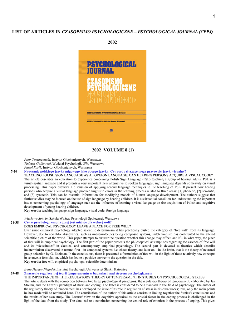 1 LIST T OF ARTIICLES IN CZASOPIS SMO PSYC CHOLOGIC CZNE – PS SYCHOLOG GICAL JOU URNAL (CP PPJ) 2002 2002 VOLUME E 8 (1) 7-20 21-38 39-48 Piotr Tomasszewski, Instytuut Głuchoniemy ych, Warszawa Tadeusz Gałłkowski, Wydziiał Psychologii, UW, Warszaw wa Paweł Rosikk, Instytut Głuchhoniemych, Waarszawa Nauczanie p polskiego język ka migowego jako obcego jęzzyka: Czy osob by słyszące mogą przyswoić jjęzyk wizualny y? TEACHING G POLISH SIGN N LANGUAGE E AS A FOREIIGN LANGUA AGE: CAN HEA ARING PERSO ONS ACQUIRE E A VISUAL CODE? C The article ddescribes an edducation to exp perience concerrning Polish Siign Language (PSL) ( teachingg a group of heearing adults. PSL P is a visual-spatiaal language andd it presents a very v important new alternativee to spoken lan nguages; sign laanguage depend ds so heavily on o visual processing. This paper proovides a discusssion of applyiing second lang guage techniqu ues to the teachhing of PSL. It I present how hearing persons whoo acquire a visuual language prroduce linguistiic errors in the learning proceess related to thhree areas: [1] phonetic, p [2] seemantic, and [3] synttactic. This cann be essential information foor modifying models m of humaan language deevelopment. Th he authors sugggest that further studiies may be focuused on the use of sign languagge by hearing children. c It is a substantial s conddition for underrstanding the im mportant issues conceerning psycholoogy of languagee such as: the iinfluence of leaarning a visual language on thhe acquisition of o Polish and cognitive developmennt of young hearring children. Key words: teaching languuage, sign langu uage, visual codde, foreign lang guage Wiesława Sootwin, Szkoła Wyższa W Psychollogii Społecznej ej, Warszawa Czy w psych hologii empiryycznej jest miejjsce dla wolnejj woli? DOES EMP PIRICAL PSYC CHOLOGY LEA AVE A PLACE E FOR FREE WILL? W Ever since eempirical psychhology adopted d scientific deteerminism it has practically ou usted the categgory of "free will" w from its laanguage. However, duue to scientificc discoveries, such s as microm molecules being g composed systems, indeterm minism has con ntributed to thee altered scientific piccture of the woorld. This paperr attempts to annswer the questiion whether this change may aaffect, and if – in what way, thhe place of free will in empirical pssychology. The first part of thhe paper presen nts the philosophical assumptioons regarding the t essence of free f will c and contemporary c eempirical psycchology. The second s part is devoted to th heories which describe d and its "viccissitudes" in classical indeterminissm discovered in i nature, first – in composed ssystems, i.e. ch haos theory, and d later on – in thhe brain, that iss the theory of neuronal n group selecttion by G. Edelm man. In the con nclusions, there is presented a formulation of free will in thee light of these relatively r new concepts c in science, a formulation, which w has led to o a positive answ wer to the questtion in the title. Key words: free will, empiirical psycholog gy, scientific deeterminism gii, Uniwersyteet Śląski, Katow wice Irena Heszenn-Niejodek, Insstytut Psycholog Znaczenie rregulacyjnej teeorii temperam mentu w badan niach nad stresem psychologiicznym THE IMPOR RTANCE OF THE T REGULAT TORY THEOR RY OF TEMPE ERAMENT IN STUDIES S ON PPSYCHOLOGICAL STRESS S The article ddeals with the connection c betw ween two large ppsychological paradigms: p the regulatory theoory of temperam ment, elaboratedd by Jan Strelau, and the Lazarus' paaradigm of streess and coping. The latter is co onsidered to be a standard in tthe field of psychology. The author a of the regulatorry theory of tem mperament has developed the iissue of its rolee in regulation of o stress in his oown works; thu us, only the maiin points he has madee will be remindded here. The contribution c off the author of this article conssists in linking ttogether the Strrelau's conclusiions and the results oof her own studdy. The Lazaruss' view on the ccognitive appraaisal as the cruccial factor in thhe coping proceess is challengeed in the light of the ddata from the study. s The data lead to a conc lusion concerning the central role of emotionn in the process of coping. Thhis gives 2 strong support to the statement about the importance of the regulatory theory of temperament for research on psychological stress, formulated by Jan Strelau. Key words: temperament, psychological stress, regulatory theory 49-64 65-74 75-85 87-94 95-102 Aleksander A. Gorbatkow, Instytut Pedagogiki i Psychologii, Akademia Świętokrzyska, Kielce Zależność relacji między pozytywnymi i negatywnymi emocjami od poziomu rozwoju podmiotowego jednostki EFFICIENCY AS A MODERATOR OF CORRELATIONS BETWEEN POSITIVE AND NEGATIVE EMOTIONS In some reports the data on the dependence of linear correlations between positive and negative emotions on the level of performance of activity are received. The basic types of this dependence are as follows: inverse, direct and nonmonotonic (direct-inverse-direct). Two models are proposed for integration and explanation of these data. The U-model is based on the form of curves of dynamics of positive and negative emotions during the increasing level of performance. The W-model is based on the curves of dynamics of emotional ambivalence and emotional balance during the increasing level of performance. In this study, the same empirical data, appropriate to this hypothesis have been received. The participants (181 village, small and big city final class students of a primary school, aged 13-16 years) completed the two-dimensional version of the Beck Hopelessness Scale. The dependence of the correlations between opposite emotions on the level of performance (academic achievement) is: quadratic (U-shaped) in a sample of female and negative linear in a sample of male. The generalization and limitation of the findings is discussed. Key words: emotions, efficiency, correla