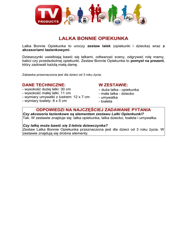 LALKA BONNIE OPIEKUNKA Lalka Bonnie Opiekunka to uroczy zestaw lalek (opiekunki i dziecka) wraz z akcesoriami łazienkowymi. Dziewczynki uwielbiają bawić się lalkami, odtwarzać sceny, odgrywać rolę mamy, babci czy przedszkolnej opiekunki. Zestaw Bonnie Opiekunka to pomysł na prezent, który zadowali każdą małą damę. Zabawka przeznaczona jest dla dzieci od 3 roku życia. DANE TECHNICZNE: - wysokość dużej lalki: 30 cm - wysokość małej lalki: 11 cm - wymiary umywalki z lustrem: 12 x 7 cm - wymiary toalety: 8 x 5 cm W ZESTAWIE: - duża lalka - opiekunka - mała lalka - dziecko - umywalka - toaleta ODPOWIEDZI NA NAJCZĘŚCIEJ ZADAWANE PYTANIA Czy akcesoria łazienkowe są elementem zestawu Lalki Opienkunki? Tak. W zestawie znajduje się: lalka opiekunka, lalka dziecko, toaleta i umywalka. Czy lalką może bawić się 2-letnia dziewczynka? Zestaw Lalka Bonnie Opiekunka przeznaczona jest dla dzieci od 3 roku życia. W zestawie znajdują się drobne elementy.