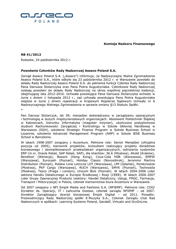 Komisja Nadzoru Finansowego RB 41/2012 Rzeszów, 24 października 2012 r. Powołanie Członków Rady Nadzorczej Asseco Poland S.A. Zarząd Asseco Poland S.A. („Asseco”) informuje, że Nadzwyczajne Walne Zgromadzenie Asseco Poland S.A., które odbyło się 23 października 2012 r. w Warszawie powołało do składu Rady Nadzorczej Asseco Poland S.A. do pełnienia funkcji Członka Rady Nadzorczej Pana Dariusza Stolarczyka oraz Pana Piotra Augustyniaka. Członkowie Rady Nadzorczej zostają powołani do składu Rady Nadzorczej na okres wspólnej pięcioletniej kadencji, obejmującej lata 2012-2016. Uchwała powołująca Pana Dariusza Stolarczyka wchodzi w życie z dniem 1 listopada 2012 r., zaś uchwała powołująca Pana Piotra Augustyniaka wejdzie w życie z dniem rejestracji w Krajowym Rejestrze Sądowym Uchwały nr 6 Nadzwyczajnego Walnego Zgromadzenia w sprawie zmiany §13 Statutu Spółki. * Pan Dariusz Stolarczyk, lat 39; menadżer doświadczony w zarządzaniu operacyjnym i technologią w dużych międzynarodowych organizacjach. Absolwent Politechniki Śląskiej w Katowicach, kierunku Informatyka (magister inżynier), ukończone podyplomowe studium Rachunkowości Zarządczej i Kontrolingu w Szkole Głównej Handlowej w Warszawie (SGH), szkolenie Strategic Finance Program w Szkole Business School w Lozannie, szkolenie Advanced Management Program (AMP) w Szkole IESE Business School w Barcelonie. W latach 1998-2007 związany z Accenture. Pełnione role: Senior Menadżer (oficjalna pozycja od 2005), kierownik projektów, konsultant realizujący projekty doradztwa biznesowego i skomplikowanych przekształceń organizacyjnych, wdrożenia systemów ERP (m.in. Oracle Retail, SAP Retail, SAP), dla klientów: 36.6 (Moskwa), Ahold (Kraków), Benetton (Wenecja), Bossini (Hong Kong), Coca-Cola HSB (Warszawa), EMPIK (Warszawa), Eurocash (Poznań), Holiday Classic (Novosibirsk), Jeronimo Martins Distribution (Poznań), Polskie Linie Lotnicze LOT (Warszawa), LPP (Gdańsk), Perekriostok (Moskwa), PKP Cargo (Warszawa), RUCH (Warszawa), SMYK (Poznań), Technosila (Moskwa), Tesco (Praga i Londyn), Unicom Bols (Poznań). W latach 2004-2006 Lider sektora Handlu Detalicznego w Europie Środkowej i Rosji (CEER). W latach 2006-2007 Lider Grupy Operacyjnej Products (sektory: Handel Detaliczny, Usługi, FMGC, Farmacja, Transport i Motoryzacja) w Polsce, członek kierownictwa biura Accenture w Warszawie. Od 2007 związany z NFI Empik Media and Fashions S.A. (NFIEMF). Pełnione role: COO/ Dyrektor ds. Operacji, IT i Łańcucha Dostaw, członek zarządu NFIEMF – od 2007. Dyrektor Zarządzający dywizji biznesowej Empik Digital – od 2011. Ponadto: Przewodniczący Rady Nadzorczej spółki E-Muzyka S.A., Członek Zarządu i/lub Rad Nadzorczych w spółkach: Learning Systems Poland, Gandalf, Virtualo and GryOnLine. Pan Dariusz Stolarczyk nie prowadzi działalności konkurencyjnej w stosunku do Asseco Poland S.A., nie uczestniczy w spółce konkurencyjnej jako wspólnik spółki cywilnej, spółki osobowej lub jako członek organu władz spółki kapitałowej oraz nie uczestniczy w innej konkurencyjnej osobie prawnej jako członek jej organu. Pan Dariusz Stolarczyk nie został wpisany do Rejestru Dłużników Niewypłacalnych prowadzonego na podstawie Ustawy o Krajowym Rejestrze Sądowym. * Pan Piotr Augustyniak, lat 49. Absolwent Uniwersytetu Warszawskiego na kierunku filologia angielska (1990) oraz zarządzanie (1994). W latach 1991-1992 tłumacz w New York Times. W latach 1992-1993 asystent oficera finansowego w Fundacji Przekształceń Własnościowych przy Ministerstwie Przekształceń Własnościowych. W latach 1993-1994 związany z Ministerstwem Przekształceń Własnościowych, kolejno jako kierownik projektu i kierownik projektu prywatyzacyjnego. W latach 1994-2011 związany z Enterprise Investors (EI), kolejno jako: analityk, dyrektor inwestycyjny, wiceprezes, partner W roku 2001 Prezes Zarządu Energoaparatury S.A., oddelegowany w ramach pracy w EI do przeprowadzenia restrukturyzacji spółki. Jako partner EI (2006-2011) odpowiedzialny za monitoring, wprowadzanie spółek na GPW, transakcje sprzedaży znaczących pakietów akcji spółek portfela EI na rynku publicznym i prywatnym, członek rad nadzorczych: Polfa Kutno, Energoaparatura, Elektrobudowa, Wizów, Sfinks, CSS, Bauma, Comp Rzeszów, Comp Rzeszów (obecnie Asseco Poland), Agros Nova, Teta, Opoczno, AB, Siveco (Rumunia), STD Donivo (Słowacja), AVG Technologies (Holandia). Obecnie prowadzi własną działalność gospodarczą w zakresie doradztwa finansowego. Pan Piotr Augustyniak nie prowadzi działalności konkurencyjnej w stosunku do Asseco Poland S.A., nie uczestniczy w spółce konkurencyjnej jako wspólnik spółki cywilnej, spółki osobowej lub jako członek organu władz spółki kapitałowej oraz nie uczestniczy w innej konkurencyjnej osobie prawnej jako członek jej organu. Pan Piotr Augustyniak nie został wpisany do Rejestru Dłużników Niewypłacalnych prowadzonego na podstawie Ustawy o Krajowym Rejestrze Sądowym. Podstawa prawna: Zgodnie z § 5 ust. 1 pkt. 22 Rozporządzenia Ministra Finansów z dnia 19 lutego 2009 r. w sprawie informacji bieżących i okresowych przekazywanych przez emitentów papierów wartościowych oraz warunków uznawania za równoważne informacji wymaganych przepisami prawa państwa niebędącego państwem członkowskim (Dz. U. 2009, nr 33, poz. 259)