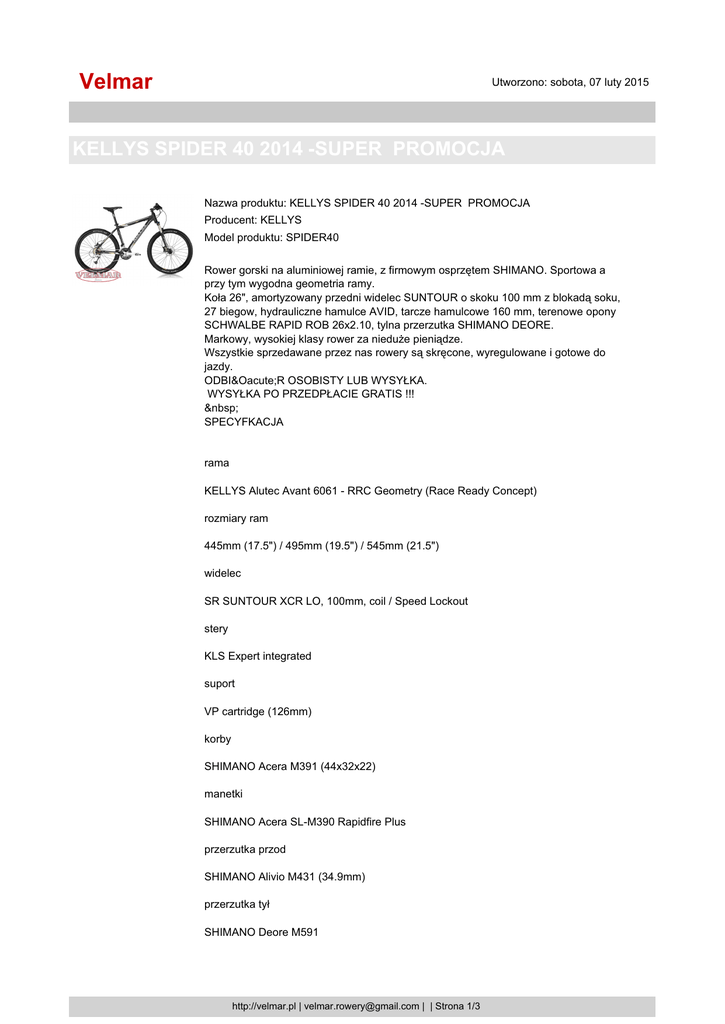 Velmar Utworzono: sobota, 07 luty 2015 KELLYS SPIDER 40 2014 -SUPER PROMOCJA Nazwa produktu: KELLYS SPIDER 40 2014 -SUPER PROMOCJA Producent: KELLYS Model produktu: SPIDER40 Rower gorski na aluminiowej ramie, z firmowym osprzętem SHIMANO. Sportowa a przy tym wygodna geometria ramy. Koła 26", amortyzowany przedni widelec SUNTOUR o skoku 100 mm z blokadą soku, 27 biegow, hydrauliczne hamulce AVID, tarcze hamulcowe 160 mm, terenowe opony SCHWALBE RAPID ROB 26x2.10, tylna przerzutka SHIMANO DEORE. Markowy, wysokiej klasy rower za nieduże pieniądze. Wszystkie sprzedawane przez nas rowery są skręcone, wyregulowane i gotowe do jazdy. ODBIÓR OSOBISTY LUB WYSYŁKA. WYSYŁKA PO PRZEDPŁACIE GRATIS !!! SPECYFKACJA rama KELLYS Alutec Avant 6061 - RRC Geometry (Race Ready Concept) rozmiary ram 445mm (17.5") / 495mm (19.5") / 545mm (21.5") widelec SR SUNTOUR XCR LO, 100mm, coil / Speed Lockout stery KLS Expert integrated suport VP cartridge (126mm) korby SHIMANO Acera M391 (44x32x22) manetki SHIMANO Acera SL-M390 Rapidfire Plus przerzutka przod SHIMANO Alivio M431 (34.9mm) przerzutka tył SHIMANO Deore M591 http://velmar.pl | [email protected] | | Strona 1/3 Velmar Utworzono: sobota, 07 luty 2015 KELLYS SPIDER 40 2014 -SUPER PROMOCJA ilość biegow 27 kaseta SHIMANO CS-HG20-9 (11-34) łańcuch KMC X9 (108 links) hamulce AVID DB1 Hydraulic Disc tarcze hamulcowe 160mm front / 160mm rear dżwignie hamulcowe AVID DB1 piasty SRAM MTH-306 Disc (32 holes) szprychy stainless steel black obręcze KLS Draft Disc 559x19 (32 holes) opony SCHWALBE Rapid Rob 54-559 (26x2.10) wspornik kierownicy KLS Expert (diam 28.6mm / bar bore 31.8mm / 7°) kierownica KLS Expert RiseBar (31.8mm) chwyty KLS Advancer 2Density sztyca KLS Expert (30.9mm) http://velmar.pl | [email protected] | | Strona 2/3 Velmar Utworzono: sobota, 07 luty 2015 KELLYS SPIDER 40 2014 -SUPER PROMOCJA siodło KLS Apex pedały KLS Master - alloy _____________________________ Paragon lub faktura VAT gwarancja 2 lata Cena: 2599.00zł Cena promocyjna: 1999.00zł Opcje dostępne dla KELLYS SPIDER 40 2014 -SUPER PROMOCJA : rozmiar ramy 19,5, 21,5. Dostępność: Ten produkt został dodany do sklepu w dniu piątek, 01 sierpień 2014 http://velmar.pl | [email protected] | | Strona 3/3