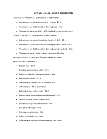 CENNIK USŁUG – BIURO TŁUMACZEŃ TŁUMACZENIA PRZYSIĘGŁE – jedna strona to 1125 znaków • Jedna strona tłumaczenia (termin – 1 dzień) – 30 zł • Tryb ekspres (na dziś lub większa ilość na jutro) – 50 zł • Tłumaczenia ustne (np. USC) – 100 zł za każde rozpoczęte 60 minut TŁUMACZENIA ZWYKŁE – jedna strona to 1800 znaków • Jedna strona tłumaczenia zwykłego (termin - 2 dni) – 35 zł • Jedna strona tłumaczenia specjalistycznego (termin - 2 dni) – 38 zł • Tryb ekspres (na dziś lub większa ilość na jutro lub pojutrze) – 50 zł • Tłumaczenia ustne - 100 zł za każde rozpoczęte 60 minut PRZY WIĘKSZYCH ZLECENIACH MOŻLIWOŚĆ NEGOCJACJI CEN PRZYKŁADOWE DOKUMENTY: Dyplom mgr – 30 zł Świadectwo ukończenia szkoły – 50 zł Dyplom uzyskania tytułu zawodowego – 30 zł Akt ślubu (brytyjski) – 30 zł Akt ślubu (USA, polski) – 50 zł, skrócony 30 zł Akt urodzenia – 50 zł, polski 30 zł Zaświadczenie o niekaralności – 50 zł Dyplom ukończenia studiów podyplomowych – 50 zł Świadectwo dojrzałości (stare) – 50 zł Świadectwo dojrzałości technikum – 60 zł Dowód rejestracyjny – 50 zł Przebieg ubezpieczenia – 30 zł Indeks politechniki – od 180 zł Suplement do dyplomu uniwersyteckiego – od 180 zł