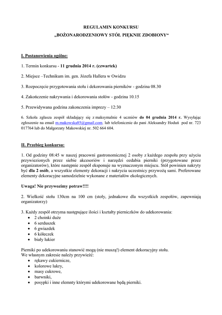 REGULAMIN KONKURSU „BOŻONARODZENIOWY STÓŁ PIĘKNIE ZDOBIONY“ I. Postanowienia ogólne: 1. Termin konkursu - 11 grudnia 2014 r. (czwartek) 2. Miejsce –Technikum im. gen. Józefa Hallera w Owidzu 3. Rozpoczęcie przygotowania stołu i dekorowania pierników - godzina 08.30 4. Zakończenie nakrywania i dekorowania stołów - godzina 10.15 5. Przewidywana godzina zakonczenia imprezy – 12:30 6. Szkoła zgłasza zespół składający się z maksymalnie 4 uczniów do 04 grudnia 2014 r. Wysyłając zgłoszenie na email [email protected], lub telefonicznie do pani Aleksandry Hoduń pod nr. 723 017764 lub do Małgorzaty Makowskiej nr. 502 664 604. II. Przebieg konkursu: 1. Od godziny 08:45 w naszej pracowni gastronomicznej 2 osoby z każdego zespołu przy użyciu przywiezionych przez siebie akcesoriów i narzędzi ozdabia pierniki (przygotowane przez organizatorów), które następnie zespół eksponuje na wyznaczonym miejscu. Stół powinien nakryty być dla 2 osób, a wszystkie elementy dekoracji i nakrycia uczestnicy przywożą sami. Preferowane elementy dekoracyjne samodzielnie wykonane z materiałów ekologicznych. Uwaga! Nie przywozimy potraw!!!! 2. Wielkość stołu 130cm na 100 cm (stoły, jednakowe dla wszystkich zespołów, zapewniają organizatorzy) 3. Każdy zespół otrzyma następujące ilości i kształty pierniczków do udekorowania: 2 choinki duże 6 serduszek 6 gwiazdek 6 kółeczek biały lukier Pierniki po udekorowaniu stanowić mogą (nie muszą!) element dekoracyjny stołu. We własnym zakresie należy przywieźć: rękawy cukiernicze, kolorowe lukry, masy cukrowe, barwniki, posypki i inne elemnty którymi udekorowane będą pierniki. Uwaga! Można dodatkowo przywieźć pierniki wykonane w domu, które posłużą do dekoracji stołu konkursowego. Nie będą one jednak brane pod uwagę w ocenie i przyznaniu nagrody za dekorację pierników. III. Jury: Ekspozycję będzie oceniać profesjonalne jury złożone z przedstawicieli branży gastronomicznej, firmy sponsorującej nagrody, mediów i dyrekcji szkoły. Przy ocenie stołów jury będzie brało pod uwagę następujące kryteria: poprawność nakrycia; elementy dekoracyjne wykonane samodzielnie użycie elementów dekoracji pochodzacych z surowców naturalnych (np. drewno, papier itp) ogólną estetykę stołu. IV. Nagrody: Nagrody zostaną przyznane w dwóch kategoriach. Pierwszą kategorią będzie – najładniej udekorowany stół Bożonarodzeniowy. W tej kategorii przyznane zostaną trzy pierwsze miejsca. Drugą (osobną) kategorią będzie – najpiękniej ozdobione pierniki (chodzi o pierniki dekorowane podczas konkursu). Kategoria I – Najpiękniejszy Stół Bożonarodzeniowy I miejsce –nagroda o wartości - 400 zł II miejsce- nagroda o wartości - 300 zł III miejsce- nagroda o wartości - 200 zł Kategoria II – Napiękniej ozdobione pierniki: I miejsce – nagroda o wartości 250 zł Wszyscy uczestnicy otrzymają pamiątkowe dyplomy . Na naszej stronie internetowej http://www.technikumowidz.pl/ można obejrzeć zdjęcia z poprzednich konkursów.