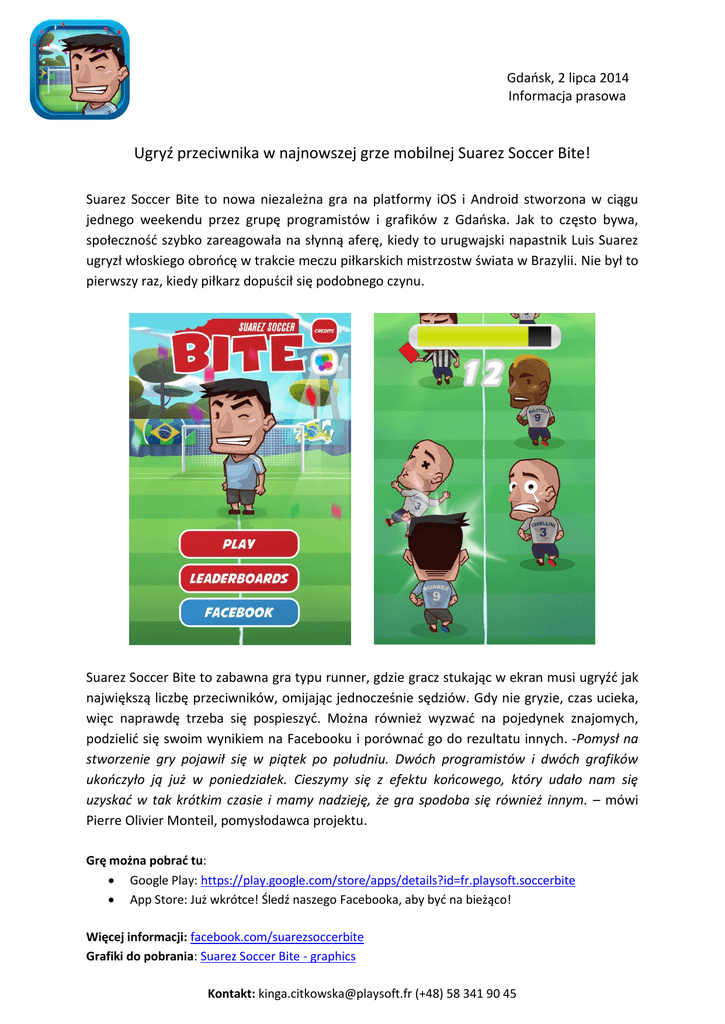 Gdańsk, 2 lipca 2014 Informacja prasowa Ugryź przeciwnika w najnowszej grze mobilnej Suarez Soccer Bite! Suarez Soccer Bite to nowa niezależna gra na platformy iOS i Android stworzona w ciągu jednego weekendu przez grupę programistów i grafików z Gdańska. Jak to często bywa, społeczność szybko zareagowała na słynną aferę, kiedy to urugwajski napastnik Luis Suarez ugryzł włoskiego obrońcę w trakcie meczu piłkarskich mistrzostw świata w Brazylii. Nie był to pierwszy raz, kiedy piłkarz dopuścił się podobnego czynu. Suarez Soccer Bite to zabawna gra typu runner, gdzie gracz stukając w ekran musi ugryźć jak największą liczbę przeciwników, omijając jednocześnie sędziów. Gdy nie gryzie, czas ucieka, więc naprawdę trzeba się pospieszyć. Można również wyzwać na pojedynek znajomych, podzielić się swoim wynikiem na Facebooku i porównać go do rezultatu innych. -Pomysł na stworzenie gry pojawił się w piątek po południu. Dwóch programistów i dwóch grafików ukończyło ją już w poniedziałek. Cieszymy się z efektu końcowego, który udało nam się uzyskać w tak krótkim czasie i mamy nadzieję, że gra spodoba się również innym. – mówi Pierre Olivier Monteil, pomysłodawca projektu. Grę można pobrać tu: Google Play: https://play.google.com/store/apps/details?id=fr.playsoft.soccerbite App Store: Już wkrótce! Śledź naszego Facebooka, aby być na bieżąco! Więcej informacji: facebook.com/suarezsoccerbite Grafiki do pobrania: Suarez Soccer Bite - graphics Kontakt: [email protected] (+48) 58 341 90 45
