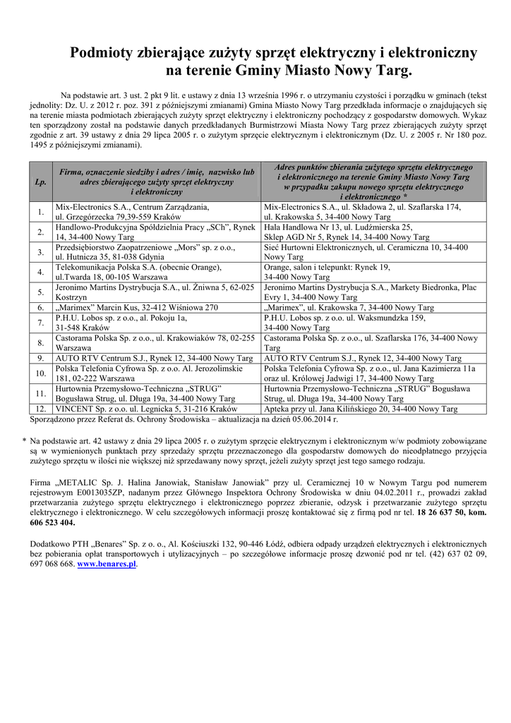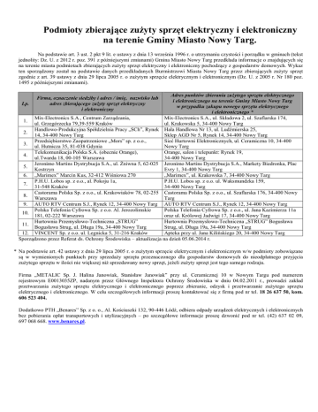 Podmioty zbierające zużyty sprzęt elektryczny i elektroniczny na terenie Gminy Miasto Nowy Targ. Na podstawie art. 3 ust. 2 pkt 9 lit. e ustawy z dnia 13 września 1996 r. o utrzymaniu czystości i porządku w gminach (tekst jednolity: Dz. U. z 2012 r. poz. 391 z późniejszymi zmianami) Gmina Miasto Nowy Targ przedkłada informacje o znajdujących się na terenie miasta podmiotach zbierających zużyty sprzęt elektryczny i elektroniczny pochodzący z gospodarstw domowych. Wykaz ten sporządzony został na podstawie danych przedkładanych Burmistrzowi Miasta Nowy Targ przez zbierających zużyty sprzęt zgodnie z art. 39 ustawy z dnia 29 lipca 2005 r. o zużytym sprzęcie elektrycznym i elektronicznym (Dz. U. z 2005 r. Nr 180 poz. 1495 z późniejszymi zmianami). Adres punktów zbierania zużytego sprzętu elektrycznego i elektronicznego na terenie Gminy Miasto Nowy Targ Lp. w przypadku zakupu nowego sprzętu elektrycznego i elektronicznego * Mix-Electronics S.A., Centrum Zarządzania, Mix-Electronics S.A., ul. Składowa 2, ul. Szaflarska 174, 1. ul. Grzegórzecka 79,39-559 Kraków ul. Krakowska 5, 34-400 Nowy Targ Handlowo-Produkcyjna Spółdzielnia Pracy „SCh”, Rynek Hala Handlowa Nr 13, ul. Ludźmierska 25, 2. 14, 34-400 Nowy Targ Sklep AGD Nr 5, Rynek 14, 34-400 Nowy Targ Przedsiębiorstwo Zaopatrzeniowe „Mors” sp. z o.o., Sieć Hurtowni Elektronicznych, ul. Ceramiczna 10, 34-400 3. ul. Hutnicza 35, 81-038 Gdynia Nowy Targ Telekomunikacja Polska S.A. (obecnie Orange), Orange, salon i telepunkt: Rynek 19, 4. ul.Twarda 18, 00-105 Warszawa 34-400 Nowy Targ Jeronimo Martins Dystrybucja S.A., ul. Żniwna 5, 62-025 Jeronimo Martins Dystrybucja S.A., Markety Biedronka, Plac 5. Kostrzyn Evry 1, 34-400 Nowy Targ 6. „Marimex” Marcin Kus, 32-412 Wiśniowa 270 „Marimex”, ul. Krakowska 7, 34-400 Nowy Targ P.H.U. Lobos sp. z o.o., al. Pokoju 1a, P.H.U. Lobos sp. z o.o. ul. Waksmundzka 159, 7. 31-548 Kraków 34-400 Nowy Targ Castorama Polska Sp. z o.o., ul. Krakowiaków 78, 02-255 Castorama Polska Sp. z o.o., ul. Szaflarska 176, 34-400 Nowy 8. Warszawa Targ 9. AUTO RTV Centrum S.J., Rynek 12, 34-400 Nowy Targ AUTO RTV Centrum S.J., Rynek 12, 34-400 Nowy Targ Polska Telefonia Cyfrowa Sp. z o.o. Al. Jerozolimskie Polska Telefonia Cyfrowa Sp. z o.o., ul. Jana Kazimierza 11a 10. 181, 02-222 Warszawa oraz ul. Królowej Jadwigi 17, 34-400 Nowy Targ Hurtownia Przemysłowo-Techniczna „STRUG” Hurtownia Przemysłowo-Techniczna „STRUG” Bogusława 11. Bogusława Strug, ul. Długa 19a, 34-400 Nowy Targ Strug, ul. Długa 19a, 34-400 Nowy Targ 12. VINCENT Sp. z o.o. ul. Legnicka 5, 31-216 Kraków Apteka przy ul. Jana Kilińskiego 20, 34-400 Nowy Targ Sporządzono przez Referat ds. Ochrony Środowiska – aktualizacja na dzień 05.06.2014 r. Firma, oznaczenie siedziby i adres / imię, nazwisko lub adres zbierającego zużyty sprzęt elektryczny i elektroniczny * Na podstawie art. 42 ustawy z dnia 29 lipca 2005 r. o zużytym sprzęcie elektrycznym i elektronicznym w/w podmioty zobowiązane są w wymienionych punktach przy sprzedaży sprzętu przeznaczonego dla gospodarstw domowych do nieodpłatnego przyjęcia zużytego sprzętu w ilości nie większej niż sprzedawany nowy sprzęt, jeżeli zużyty sprzęt jest tego samego rodzaju. Firma „METALIC Sp. J. Halina Janowiak, Stanisław Janowiak” przy ul. Ceramicznej 10 w Nowym Targu pod numerem rejestrowym E0013035ZP, nadanym przez Głównego Inspektora Ochrony Środowiska w dniu 04.02.2011 r., prowadzi zakład przetwarzania zużytego sprzętu elektrycznego i elektronicznego poprzez zbieranie, odzysk i przetwarzanie zużytego sprzętu elektrycznego i elektronicznego. W celu szczegółowych informacji proszę kontaktować się z firmą pod nr tel. 18 26 637 50, kom. 606 523 404. Dodatkowo PTH „Benares” Sp. z o. o., Al. Kościuszki 132, 90-446 Łódź, odbiera odpady urządzeń elektrycznych i elektronicznych bez pobierania opłat transportowych i utylizacyjnych – po szczegółowe informacje proszę dzwonić pod nr tel. (42) 637 02 09, 697 068 668. www.benares.pl.