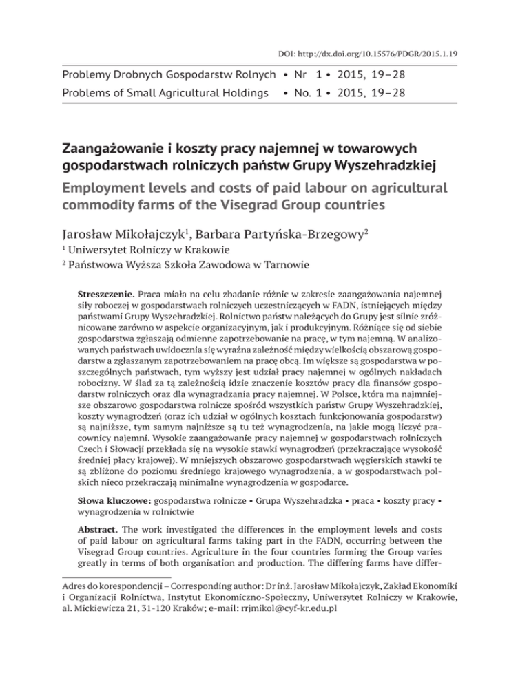 DOI: http://dx.doi.org/10.15576/PDGR/2015.1.19 Problemy Drobnych Gospodarstw Rolnych • Nr 1 • 2015, 19–28 Problems of Small Agricultural Holdings • No. 1 • 2015, 19–28 Zaangażowanie i koszty pracy najemnej w towarowych gospodarstwach rolniczych państw Grupy Wyszehradzkiej Employment levels and costs of paid labour on agricultural commodity farms of the Visegrad Group countries Jarosław Mikołajczyk1, Barbara Partyńska-Brzegowy2 1 2 Uniwersytet Rolniczy w Krakowie Państwowa Wyższa Szkoła Zawodowa w Tarnowie Streszczenie. Praca miała na celu zbadanie różnic w zakresie zaangażowania najemnej siły roboczej w gospodarstwach rolniczych uczestniczących w FADN, istniejących między państwami Grupy Wyszehradzkiej. Rolnictwo państw należących do Grupy jest silnie zróżnicowane zarówno w aspekcie organizacyjnym, jak i produkcyjnym. Różniące się od siebie gospodarstwa zgłaszają odmienne zapotrzebowanie na pracę, w tym najemną. W analizowanych państwach uwidocznia się wyraźna zależność między wielkością obszarową gospodarstw a zgłaszanym zapotrzebowaniem na pracę obcą. Im większe są gospodarstwa w poszczególnych państwach, tym wyższy jest udział pracy najemnej w ogólnych nakładach robocizny. W ślad za tą zależnością idzie znaczenie kosztów pracy dla finansów gospodarstw rolniczych oraz dla wynagradzania pracy najemnej. W Polsce, która ma najmniejsze obszarowo gospodarstwa rolnicze spośród wszystkich państw Grupy Wyszehradzkiej, koszty wynagrodzeń (oraz ich udział w ogólnych kosztach funkcjonowania gospodarstw) są najniższe, tym samym najniższe są tu też wynagrodzenia, na jakie mogą liczyć pracownicy najemni. Wysokie zaangażowanie pracy najemnej w gospodarstwach rolniczych Czech i Słowacji przekłada się na wysokie stawki wynagrodzeń (przekraczające wysokość średniej płacy krajowej). W mniejszych obszarowo gospodarstwach węgierskich stawki te są zbliżone do poziomu średniego krajowego wynagrodzenia, a w gospodarstwach polskich nieco przekraczają minimalne wynagrodzenia w gospodarce. Słowa kluczowe: gospodarstwa rolnicze • Grupa Wyszehradzka • praca • koszty pracy • wynagrodzenia w rolnictwie Abstract. The work investigated the differences in the employment levels and costs of paid labour on agricultural farms taking part in the FADN, occurring between the Visegrad Group countries. Agriculture in the four countries forming the Group varies greatly in terms of both organisation and production. The differing farms have differ- Adres do korespondencji – Corresponding author: Dr inż. Jarosław Mikołajczyk, Zakład Ekonomiki i Organizacji Rolnictwa, Instytut Ekonomiczno-Społeczny, Uniwersytet Rolniczy w Krakowie, al. Mickiewicza 21, 31-120 Kraków; e-mail: [email protected] 20 Jarosław Mikołajczyk, Barbara Partyńska-Brzegowy ent demands for labour, including paid labour. In the countries being studied, there is a clear relationship between farm area and the demand for hired workforce. The larger the farms are in a country, the higher the contribution of paid labour to the overall labour expenditure. This has an effect on the importance of labour costs to the finances of agricultural farms and the remuneration of paid labour. In Poland, where agricultural farms are smallest (in terms of area) among the Visegrad Group countries, the costs of remunerations (and their share in the overall costs of farming operations) are lowest, hence, the remunerations offered to hired farm workers are also lowest. The high levels of hired labour on agricultural farms in the Czech Republic and Slovakia translate into high rates of pay (exceeding the average national pay). On Hungarian farms, smaller in area, the rates are similar to the average national pay, whereas on Polish farms, they slightly exceed the minimum pay in the economy. Key words: agricultural farms • Visegrad Group • work • costs of labour • remunerations in agriculture Wstęp Jednym z głównych celów współpracy państw Grupy Wyszehradzkiej (GW) było dążenie do członkostwa w strukturach Unii Europejskiej. Stosunek samej Unii do państw Grupy ewoluował w okresie przed- i okołoakcesyjnym, zapewniła ona jednak docelowo państwom obecnie już członkowskim narzędzia niezbędne do dostosowania swoich struktur (w tym gospodarek i poszczególnych ich składowych) do struktur UE (Gawron 2011). Zmiany obejmowały też sektory rolne poszczególnych państw, stwarzając rolnikom i instytucjom możliwość korzystania z narzędzi Wspólnej Polityki Rolnej, a nauce i innym zainteresowanym podmiotom dając dostęp do jednolitej – porównywalnej – sprawozdawczości FADN. Rolnictwo państw Grupy Wyszehradzkiej jest silnie zróżnicowane. Mimo wspólnego wieloletniego kandydowania do Unii Europejskiej, a obecnie już ponad dziesięcioletniego korzystania z narzędzi WPR, umożliwiających modernizację i zmiany struktury agrarnej, sektory rolne poszczególnych państw wciąż jeszcze wykazują więcej różnic niż podobieństw zarówno pod względem organizacyjnym, jak i produkcyjnym. Szczególnie duże zróżnicowanie dotyczy przeciętnej wielkości gospodarstw, struktury agrarnej i struktury zatrudnienia (Braja 2009). Spośród wszystkich państw Grupy Wyszehradzkiej najmniejsze obszarowo gospodarstwa rolnicze ma Polska. Mimo najwyższej w Grupie produktywności ziemi, rolnictwo polskie charakteryzuje zdecydowanie najniższa produktywność pracy (Tarnowska 2014). Jest to zależność stosunkowo łatwa do przewidzenia w przypadku małych obszarowo gospodarstw. Istotny element polskiego rolnictwa stanowi także przerost zatrudnienia w przypadku własnej siły roboczej i niewielki udział pracy najemnej w ogólnych nakładach pracy w gospodarstwach rolniczych, co wpływa na strukturę kosztów gospodarstw (praca najemna ma zwykle niski udział w kosztach ogółem). Głównym celem pracy było określenie i ocena różnic pod względem zaanga