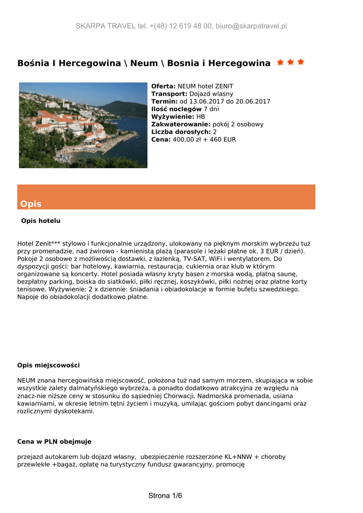 SKARPA TRAVEL tel. +(48) 12 619 48 00, [email protected] Bośnia I Hercegowina \ Neum \ Bosnia i Hercegowina Oferta: NEUM hotel ZENIT Transport: Dojazd wlasny Termin: od 13.06.2017 do 20.06.2017 Ilość noclegów 7 dni Wyżywienie: HB Zakwaterowanie: pokój 2 osobowy Liczba dorosłych: 2 Cena: 400,00 zł + 460 EUR Opis Opis hotelu Hotel Zenit*** stylowo i funkcjonalnie urządzony, ulokowany na pięknym morskim wybrzeżu tuż przy promenadzie, nad żwirowo - kamienistą plażą (parasole i leżaki płatne ok. 3 EUR / dzień). Pokoje 2 osobowe z możliwością dostawki, z łazienką, TV-SAT, WiFi i wentylatorem. Do dyspozycji gości: bar hotelowy, kawiarnia, restauracja, cukiernia oraz klub w którym organizowane są koncerty. Hotel posiada własny kryty basen z morska wodą, płatną saunę, bezpłatny parking, boiska do siatkówki, piłki ręcznej, koszykówki, piłki nożnej oraz płatne korty tenisowe. Wyżywienie: 2 x dziennie: śniadania i obiadokolacje w formie bufetu szwedzkiego. Napoje do obiadokolacji dodatkowo płatne. Opis miejscowości NEUM znana hercegowińska miejscowość, położona tuż nad samym morzem, skupiająca w sobie wszystkie zalety dalmatyńskiego wybrzeża, a ponadto dodatkowo atrakcyjna ze względu na znacz-nie niższe ceny w stosunku do sąsiedniej Chorwacji. Nadmorska promenada, usiana kawiarniami, w okresie letnim tętni życiem i muzyką, umilając gościom pobyt dancingami oraz rozlicznymi dyskotekami. Cena w PLN obejmuje przejazd autokarem lub dojazd własny, ubezpieczenie rozszerzone KL+NNW + choroby przewlekłe +bagaż, opłatę na turystyczny fundusz gwarancyjny, promocję Strona 1/6 SKARPA TRAVEL tel. +(48) 12 619 48 00, [email protected] Cena w EUR obejmuje 7, 9 lub 14 noclegów, wyżywienie 2 x dziennie. Dopłaty 1. Taksa klimatyczna płatna na miejscu: 1 EUR dziennie/osoba, dzieci do 12 lat nie płacą taksy 2. Do pokoju 1osobowego: 15 EUR / dzień 3. Do pokoju z balkonem : 5 EUR/ osoba / dzień (konieczna wcześniejsza rezerwacja) 4. Do lodówki w pokoju 4 EUR / dzień/ pokój (konieczna wcześniejsza rezerwacja) 6. Do trzeciego posiłku 7,5 EUR/ osoba/ dzień 7. Garaż: 4 EUR/ dzień (konieczna wcześniejsza rezerwacja) Zniżki W cenie uwzględniona PROMOCJĘ FIRST MINUTE: przy dojeździe autokarem – 100 zł / osoba przy dojeździe własnym – 50 zł / osoba 1. Dziecko do 2 lat jako 3 osoba w pokoju bez łóżka i wyżywienia, płaci 360 zł 2. Dziecko 2-12 lat jako 3 osoba w pokoju z łóżkiem, płaci kwotę w zł + 80% kwoty EUR 3. Dwoje dzieci 2-12 lat jako 3 i 4 osoba w pokoju na wspólnym łóżku płacą kwotę w zł + 50% kwoty EUR 4. Osoba powyżej 12 lat jako 3 osoba w pokoju płaci kwote w zł + 85% kwoty EUR 5. STAŁY KLIENT: obejmuje osoby korzystające trzeci kolejny rok z naszej oferty ! Uwagi organizatora 1.Kwota w złotych płatna jest w Polsce, kwota w EUR płatna w Neumie. 2.Przy dojeździe własnym, gdy potrzebna jest faktura na całość i przy zakupie ubezpieczenia od kosztów rezygnacji wtedy obowiązkowo równowartość kwoty w EUR płatna jest w Polsce. Kwota w EUR przeliczana jest na zł wg kursu NBP pieniądz sprzedaż z dnia ostatniej wpłaty. 3.W dniu wykupienia imprezy/ wpłaty zaliczki klient ma możliwość wykupienia dodatkowego ubezpieczenia od kosztów rezygnacji z imprezy zgodnie z Ogólnymi Warunkmi Ubezpieczenia Strona 2/6 SKARPA TRAVEL tel. +(48) 12 619 48 00, [email protected] KOSZTÓW IMPREZY TURYSTYCZNEJ w wysokości 3,3% jednak nie później niż 5 dni od dnia podpisania umowy. 4. Wycieczki fakultatywne organizowane są przez lokalne biura podróży. 5.Doba hotelowa rozpoczyna się o godz 14 i kończy o godz 9. 6. Miejsca i godziny odjazdów autokarów podano w rozkładzie jazdy 7. Potrzebny DOWÓD OSOBISTY lub PASZPORT ! Prosze pamiętać również o dokumencie dla dzieci. 8. Dla osób dojeżdżających do Krakowa możemy zarezerwować przednocleg w cenie od 100 zł. Uwagi przewoźnika 1.Transport na trasach antenowych w Polsce możliwy jest mikrobusem, autokarem klasy turystycznej, samochodem osobowym lub innym przewoźnikiem np. Polskim Busem, Luxbusem, PKP, PKS itp. Ewentualną zmianę godzin odjazdów podamy najpóźniej na 24 godziny przed odjazdem. Trasa połączeń na terenie kraju zależy od zgłoszeń z poszczególnych miast, co może spowodować, ze przejazd nie będzie realizowany najkrótszą z możliwych tras. 2. Na trasach poza granicami Polski transport odbywa się autokarami wyposażonymi w siedzenia uchylne, klimatyzację, toalety, video i nagłośnienie. Przy małej ilości osób, możliwość przewozu uczestników małym autobusem bez WC i mini baru, wtedy toalety na postojach płatne przez przewoźnika. 3. Podane godziny wyjazdów i przyjazdów mogą ulec zmianie z różnych przyczyn np. złe warunki drogowe, atmosferyczne, zwiększanie ruchu na drogach szczególnie w szczycie sezonu letniego i inne. 4. Prosimy o przybycie na miejsce zbiórki najpóźniej 15 minut przed planowaną godziną odjazdu. Miejsca w autokarze są przydzielane w kolejności podpisania umowy, a klienci o miejscach informowani są przez obsługę na miejscu zbiórki. W autokarze obowiązuje całkowity zakaz palenia papierosów oraz spożywania alkoholu. Osoby korzystające z samego przejazdu, powinny obowiązkowo ubezpieczyć się na czas pobytu. Przewoźnik gwarantuje tylko ubezpieczenie na czas przejazdu. Ramowy program imprezy (klasyczny 7 noclegowy) 1 dzień Wyjazd z Polski zgodnie z rozkładem jazdy, przejazd przez Słowację (dla chętnych posiłek w cenie ok. 5 EUR), Węgry i Chorwację. 2 dzień Przejazd przez Chorwację do Bośnii i Hercegowiny, przyjazd na miejsce wypoczynku w godzinach porannych. Zakwaterowanie od godz.14, obiadokolacja, nocleg. 3 – 8 dzień WYPOCZYNEK. Możliwość wykupienia wycieczek fakultatywnych. 9 dzień śniadanie, wykwaterowanie z hotelu do godz. 9, czas wolny, wyjazd w drogę powrotną w godz. południowych. Przejazd przez Bośnię i Chorwację. 10 dzień Przejazd prze