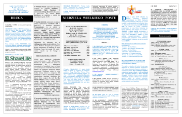 I czyt.: Rdz. 22,1-2,9-13.15-18 II czyt.: Rz 8,31b-34 Ew.: Mk 9,2-10 Refren psalmu responsorialnego: „W krainie życia będę widział Boga” DRUGA Na KAWĘ i PĄCZKI na rzecz parafii zapraszają HARCERZE. MŁODZIEŻ NASZEJ PARAFII wyjeżdzająca na ŚDM do Polski w 2016 roku prowadzi sprzedaż pierogów FIRMY SUPREME. Serdecznie zapraszamy do sali parafialnej na pierogi z kapustą i grzybami, owocowe (truskawki i jagody) ze słodkim serkiem, „Cottage Cheese,Potato & Cheddar Cheese”; z ziemniakami i cebulą, kopytka, pyzy z mięsem, z grzybami, kluski śląskie. Cena za jedno opakowanie tylko $3.00. Paczka 5 kg (165 pierogów)–tylko $25.00 Przy osobnym stoliku MŁODZIEŻ będzie sprzedawała słodycze; czekoladki na dzień Kobiet, zajączki wielkanocne palmy oraz inne smakołyki. Dzisiaj w sali parafialnej członkowie GR. PROLIFE będą udzielać informacji dotyczących nowego programu nauczania. W Wielkim Poście zapraszamy do naszej świątyni na wspólną modlitwę i rozważanie Męki Pańskiej. W poniedziałek Droga Krzyżowa dla dzieci o godz.18:30. We wtorek Droga Krzyżowa po angielsku a piątek dla wszystkich o godz. 18:30. W każdą niedzielę zapraszamy na piękne polskie nabożeństwo Gorzkich Żali o godz.18:15 z kazaniem pasyjnym. Przypominamy, że za udział w nabożeństwach pasyjnych można uzyskać odpust zupełny pod zwykłymi warunkami. Odpust zupełny można uzyskać także w każdy piątek Wielkiego Postu za odmówienie po Komunii św. modlitwy do Chrystusa ukrzyżowanego „Oto ja, dobry i najsłodszy Jezu”. Zachęcamy do włączenia się w wielkopostną akcję trzeźwościową. Przy ołtarzu Relikwii Świętych jest wyłożona Księga Abstynencji od alkoholu na okres Wielkiego Postu. Już ponad 350 osób i rodzin wpisało się do Księgi o Abstynencji. RÓŻANIEC prowadzi Róża nr. 57. REKOLEKCJE DLA DZIECI! Dzisiaj w całej Archidiecezji Toronto rozpoczęła się akcja charytatywna ShareLife. We wszystkich kościołach zbierana jest druga kolekta na ten cel. ShareLife to coroczna akcja charytatywna Archidiecezji Toronto, gromadząca fundusze na pomoc wielkiej rodzinie katolickich agencji. Każdego roku organizacje charytatywne wspierane przez ShareLife świadczą ponad 381,000 usług w ponad 20 językach dla ponad 114,000 osób w naszej Archidiecezji i wiele więcej w rozwijających się krajach na całym świecie. Co roku podczas Wielkiego Postu parafianie Archidiecezji Toronto okazują szczególną siłę katolickiej dobroczynności poprzez finansowe wsparcie ShareLife. Osiągnięcia ShareLife w 2014 roku: zgromadzono $12,261,189 podczas zbiórek parafialnych, co dało łączną sumę $14,267,640 w całej akcji ShareLife ponad 13,000 osób otrzymało porady indywidualne i rodzinne udzielone przez agencje Catholic Family Service ponad 600 chłopców dotkniętych biedą lub problemami rodzinnymi wyjechało na kolonie organizowane przez Camp Ozanam ponad 400 osób starszych i osób dotkniętych kalectwem skorzystało z całościowej opieki dzięki wolontariuszom z Society of Sharing Catholic Charities. Przy pomocy ShareLife udziela dodatkowego wsparcia finansowego głodującym, bezdomnym, dzieciom i młodzieży żyjącej w ubóstwie, kobietom zmagającym się z chorobami umysłowymi i przeżywającymi traumę po dokonaniu aborcji, osobom specjalnej troski i więźniom, a wszystko to dzięki programom reintegracyjnym w ich środowisku. Prosimy o wsparcie akcji ShareLife. Wielki post, rekolekcje, święconka, zmartwychwstanie… dla kilkuletniego dziecka to słowa trudne nie tylko do wymówienia, ale i właściwego zrozumienia w kontekście wiary, w której jest wychowywane. O ile Boże Narodzenie kojarzy się dzieciom zazwyczaj bardzo pozytywnie, Wielkanoc niesie ze sobą trudne tematy śmierci i cierpienia. Jak rozmawiać o nich z dzieckiem? Dlatego organizujemy specjalne rekolekcje dla dzieci, które wygłosi dla nich ks. Bp. Antoni Długosz, który w bardzo prosty sposób, poprzez Słowo Boże, śpiew, obrazki zbliża Pana Jezusa dzieciom i doskonale tłumaczy najbardziej zawiłe prawdy wiary. Rekolekcje rozpoczną się w przyszła niedzielę o godz. 13:00, następnie przez trzy dni obędą się spotkania rekolekcyjne dla dzieci podczas wieczornej Mszy św. Serdecznie zapraszamy. W przyszłą niedzielę do koszyczków dla ubogich zbierana będzie ofiara dla ks. Biskupa Długosza oraz dla Sióstr Albertynek w Częstochowie, które opiekują się kobietami niepełnosprawnymi intelektualnie. Ks. Biskup jest kapelanem Sióstr oraz tego ośrodka. PROGRAM ŚWIĄTECZNY. Prosimy każdą rodzinę o zaopatrzenie się w program świąteczny, który wyłożony jest przy wyjściu z kościoła. KARTKI ŚWIĄTECZNE są już dostępne w sali parafialnej. Serdecznie zapraszamy do wzięciu udziału w rekolekcjach wszystkich naszych parafian jak również młodzież tańczącą, śpiewającą i harcerzy. W czasie trwania rekolekcji wszystkie zajęcia w sali pod kościołem powinny być odwołane. NIEDZIELA WIELKIEGO POSTU CHRZTY REKOLEKCJE WIELKOPOSTNE: 8 - 11 III - dla dzieci ks. Bp Antoni Długosz 14 - 17 III - w j. ang. Biskup Gerald W. Wiesner OMI 21 - 27 III - w j. pol. o. Artur Piwowarczyk OMI WYKAZ GRUP PROWADZĄCYCH DROGĘ KRZYŻOWĄ o godz. 18:30 3 III, wtorek - Gr. Piątkowa 6 III, piątek - Gr. Pro-Life 13 III, piątek - Młodzież 17 III, wtorek - Ryc. Kolumba 20 III, piątek - K. Wyz.Człowieka 27 III, piątek - 9:15 27 III, piątek - Ministranci 18:15 (ang) (pol) (pol) (ang) (pol) (pol) (pol) NABOŻEŃSTWA POKUTNE W NASZEJ PARAFII: poniedziałek - 30 III, środę - 1 IV o godz. 19:00 UWAGA CHŁOPACY!!! W dniach 20-22 marca br. odbędą się rekolekcję dla młodzieży męskiej w Camp Charl’Bro, Wiarton. Celem rekolekcji jest poważne postawienie pytania: „Ja chcę… Rodzice chcą… A gdzie Pan Bóg mnie chce?” Są to rekolekcje zapoznawcze z pytaniem o powołanie i drogę, jaką Pan Bóg ma dla Ciebie. Twój cenny czas oddany Bogu, trud wspólnej p