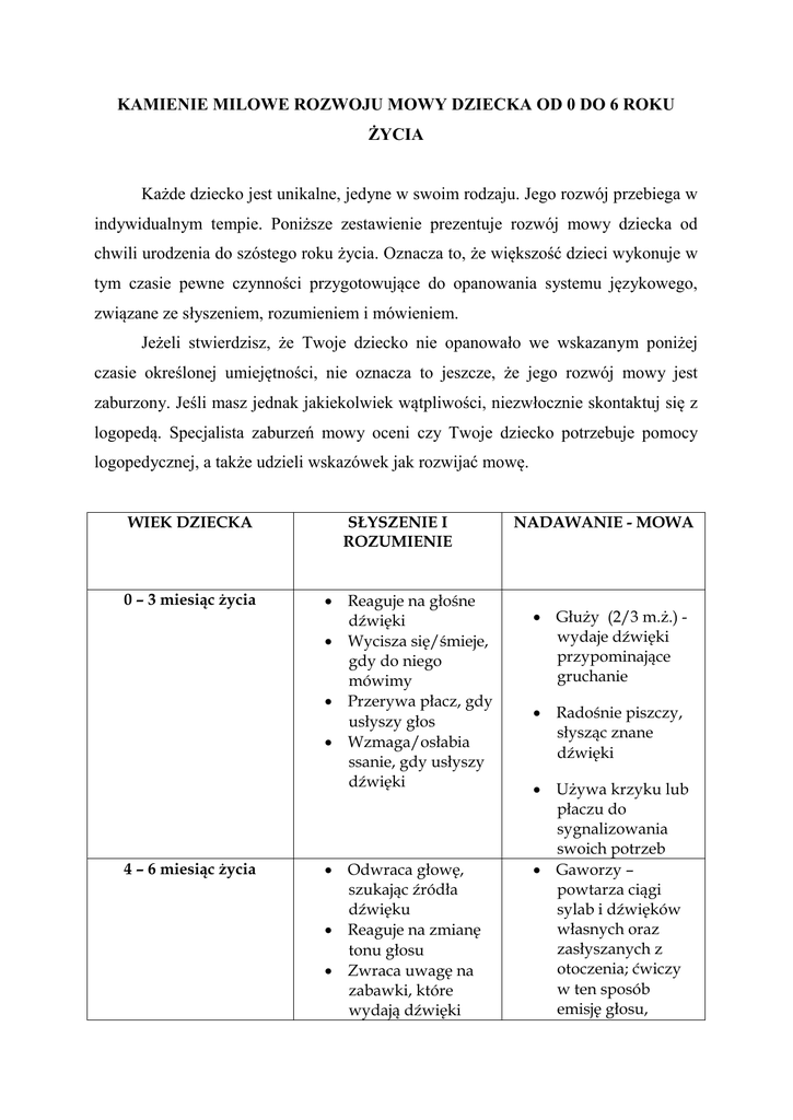 KAMIENIE MILOWE ROZWOJU MOWY DZIECKA OD 0 DO 6 ROKU ŻYCIA Każde dziecko jest unikalne, jedyne w swoim rodzaju. Jego rozwój przebiega w indywidualnym tempie. Poniższe zestawienie prezentuje rozwój mowy dziecka od chwili urodzenia do szóstego roku życia. Oznacza to, że większość dzieci wykonuje w tym czasie pewne czynności przygotowujące do opanowania systemu językowego, związane ze słyszeniem, rozumieniem i mówieniem. Jeżeli stwierdzisz, że Twoje dziecko nie opanowało we wskazanym poniżej czasie określonej umiejętności, nie oznacza to jeszcze, że jego rozwój mowy jest zaburzony. Jeśli masz jednak jakiekolwiek wątpliwości, niezwłocznie skontaktuj się z logopedą. Specjalista zaburzeń mowy oceni czy Twoje dziecko potrzebuje pomocy logopedycznej, a także udzieli wskazówek jak rozwijać mowę. WIEK DZIECKA 0 – 3 miesiąc życia 4 – 6 miesiąc życia SŁYSZENIE I ROZUMIENIE Reaguje na głośne dźwięki Wycisza się/śmieje, gdy do niego mówimy Przerywa płacz, gdy usłyszy głos Wzmaga/osłabia ssanie, gdy usłyszy dźwięki Odwraca głowę, szukając źródła dźwięku Reaguje na zmianę tonu głosu Zwraca uwagę na zabawki, które wydają dźwięki NADAWANIE - MOWA Głuży (2/3 m.ż.) wydaje dźwięki przypominające gruchanie Radośnie piszczy, słysząc znane dźwięki Używa krzyku lub płaczu do sygnalizowania swoich potrzeb Gaworzy – powtarza ciągi sylab i dźwięków własnych oraz zasłyszanych z otoczenia; ćwiczy w ten sposób emisję głosu, Reaguje na muzykę 7 – 12 miesiąc życia 12 – 24 miesiąc życia Odwraca się i patrzy w kierunku źródła dźwięku Skupia uwagę, gdy do niego mówimy Pytane: „gdzie mama?”, „gdzie tata?”, „gdzie lampa?” – wskazuje palcem Chętnie uczestniczy w prostych zabawach paluszkowych (np. „Idzie rak”) Zachęcane – wykonuje proste polecenia (np. „daj”), rozumie zakaz „nie wolno” Próbuje naśladować nasze ruchy Poproszone – wskazuje poprawnie podstawowe części ciała Wykonuje proste polecenia („daj buzi”, „zrób pa, pa”) Słucha z zainteresowanie prostych piosenek, krótkich wierszyków i opowiadań sprawność narządów artykulacyjnych oraz słuch fonemowy Zagadywane – gaworzy, uśmiecha się, porusza rękami i nogami Intensywnie gaworzy („ma-mama”, „ta-ta-ta”, „ba-ba-ba”) Używa dźwięków, by zwrócić na siebie uwagę Wykorzystuje gesty i mimikę, by spytać lub poprosić o coś Mogą pojawić się pierwsze wyrazy zbudowane z sylab otwartych, zawierające spółgłoski prymarne m, t, b, p („mama”, „tata”, „baba), nie zawsze kojarzone jeszcze z konkretną osobą lub przedmiotem Zamiast słów stosuje wyrazy dźwiękonaśladowc ze („miau”, „hau”, „bach”) Powtarza wielokrotnie wyrazy zasłyszane z otoczenia – echolalie Zaczyna łączyć dwa wyrazy („mama daj”, „tata tu”, „nie chcę”). Uwaga! 2 – 3 rok życia Potrafi wskazać często nazywane przedmioty Stały wzrost słownictwa Niepokojącym sygnałem jest brak budowania wypowiedzi dwuwyrazowych po ukończeniu 2 roku życia Upraszcza – może wymawiać początek lub koniec słowa Wymawia samogłoski a, u, i, o, e, y oraz spółgłoski m, b, p, t, n, ł, j, d Rozróżnia przeciwieństwa: np. „nie ma – jest” Wskazuje części ciała Wykonuje bardziej złożone polecenia („weź misia i chodź do mamy”) Nazywa większość przedmiotów znanych z otoczenia (tworzy przy tym własny język np. „ludź = człowiek”) Pyta „co to?”, stosuje przeczenia („nie ma mamy”), zaczyna używać liczby mnogiej Podaje swoje imię Trudne głoski zastępuje łatwiejszymi („sialik/ salik” = szalik, „lyba”= ryba) Pod koniec tego okresu dziecko wymawia samogłoski ustne i nosowe, wszystkie spółgłoski poza s, z, c, dz , sz, ż, cz, dż, r 3 – 4 rok życia Reaguje na głos z innego pokoju i komunikaty z radia i telewizji Potrafi odróżnić słuchowo wymowę prawidłową od zniekształconej (np. „sanki” a „sianki”) 4 – 5 rok życia Z uwagą słucha prostego opowiadania i potrafi odpowiedzieć na pytania związane z jego treścią Rozumie komunikaty wypowiadane przez obce osoby 5 – 6 rok życia Rozumie stosunki przestrzenne „pod”, „na”, „obok” Jest rozumiane przez osoby obce Buduje coraz dłuższe zdania Dużo pyta, odpowiada na pytania „kto”, „co”, „gdzie”, „z kim”, „w czym” Może jeszcze upraszczać najtrudniejsze głoski – sz, ż, cz, dż, r Zwykle mówi płynnie, choć mogą zdarzać się zawahania, powtórzenia dźwięków, sylab, wyrazów, przeciągania głosek = rozwojowa niepłynność mowy Zadaje bardzo dużo pytań Może wymawiać głoski sz, ż, cz, dż, zdarza się, że i r (uwaga! nie wymuszamy wymowy „r”!) Buduje bogate zdania, używa coraz więcej przymiotników, potrafi opowiedzieć prostą historyjkę Stosuje podstawowe reguły gramatyczne, choć czasem je myli Pod koniec tego okresu mowa jest wyraźna i Prawidłowo interpretuje znaki symboliczne (np. kółko+ trójkąt = znak drogowy) Rozumie morał np. bajki Rozumie trudniejsze instrukcje – „klaśnij w dłonie, a potem połóż ręce na kolanach”) poprawna, z zastosowaniem reguł gramatycznych 6 rok życia – dziecko prawidłowo wymawia wszystkie głoski języka polskiego Potrafi odpowiedzieć na bardziej złożone pytania, opowiada, używając zdań złożonych Potrafi opowiedzieć, co widzi na ilustracji, opowiada bajki Potrafi porozmawiać z osoba obcą, nie odbiegając od tematu Używa słów określających stosunki przestrzenne i nazywa podstawowe figury geometryczne Opr. na podstawie materiałów Śląskiego Oddziału Polskiego Towarzystwa Logopedycznego