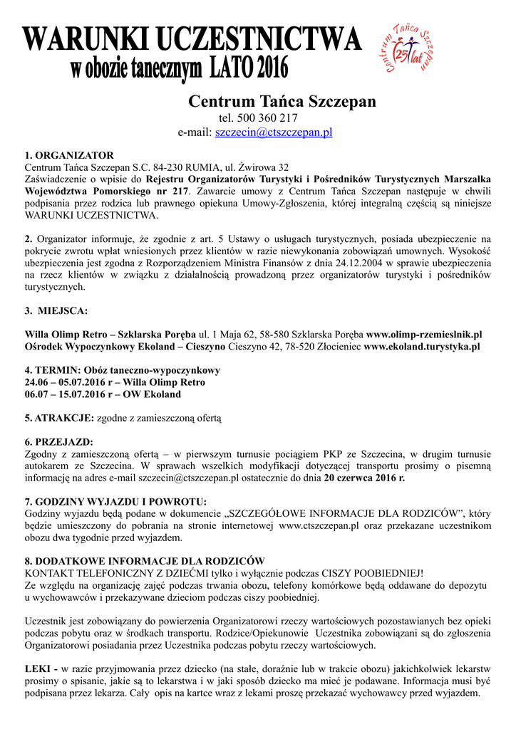 Centrum Tańca Szczepan tel. 500 360 217 e-mail: [email protected] 1. ORGANIZATOR Centrum Tańca Szczepan S.C. 84-230 RUMIA, ul. Żwirowa 32 Zaświadczenie o wpisie do Rejestru Organizatorów Turystyki i Pośredników Turystycznych Marszałka Województwa Pomorskiego nr 217. Zawarcie umowy z Centrum Tańca Szczepan następuje w chwili podpisania przez rodzica lub prawnego opiekuna Umowy-Zgłoszenia, której integralną częścią są niniejsze WARUNKI UCZESTNICTWA. 2. Organizator informuje, że zgodnie z art. 5 Ustawy o usługach turystycznych, posiada ubezpieczenie na pokrycie zwrotu wpłat wniesionych przez klientów w razie niewykonania zobowiązań umownych. Wysokość ubezpieczenia jest zgodna z Rozporządzeniem Ministra Finansów z dnia 24.12.2004 w sprawie ubezpieczenia na rzecz klientów w związku z działalnością prowadzoną przez organizatorów turystyki i pośredników turystycznych. 3. MIEJSCA: Willa Olimp Retro – Szklarska Poręba ul. 1 Maja 62, 58-580 Szklarska Poręba www.olimp-rzemieslnik.pl Ośrodek Wypoczynkowy Ekoland – Cieszyno Cieszyno 42, 78-520 Złocieniec www.ekoland.turystyka.pl 4. TERMIN: Obóz taneczno-wypoczynkowy 24.06 – 05.07.2016 r – Willa Olimp Retro 06.07 – 15.07.2016 r – OW Ekoland 5. ATRAKCJE: zgodne z zamieszczoną ofertą 6. PRZEJAZD: Zgodny z zamieszczoną ofertą – w pierwszym turnusie pociągiem PKP ze Szczecina, w drugim turnusie autokarem ze Szczecina. W sprawach wszelkich modyfikacji dotyczącej transportu prosimy o pisemną informację na adres e-mail [email protected] ostatecznie do dnia 20 czerwca 2016 r. 7. GODZINY WYJAZDU I POWROTU: Godziny wyjazdu będą podane w dokumencie „SZCZEGÓŁOWE INFORMACJE DLA RODZICÓW”, który będzie umieszczony do pobrania na stronie internetowej www.ctszczepan.pl oraz przekazane uczestnikom obozu dwa tygodnie przed wyjazdem. 8. DODATKOWE INFORMACJE DLA RODZICÓW KONTAKT TELEFONICZNY Z DZIEĆMI tylko i wyłącznie podczas CISZY POOBIEDNIEJ! Ze względu na organizację zajęć podczas trwania obozu, telefony komórkowe będą oddawane do depozytu u wychowawców i przekazywane dzieciom podczas ciszy poobiedniej. Uczestnik jest zobowiązany do powierzenia Organizatorowi rzeczy wartościowych pozostawianych bez opieki podczas pobytu oraz w środkach transportu. Rodzice/Opiekunowie Uczestnika zobowiązani są do zgłoszenia Organizatorowi posiadania przez Uczestnika podczas pobytu rzeczy wartościowych. LEKI - w razie przyjmowania przez dziecko (na stałe, doraźnie lub w trakcie obozu) jakichkolwiek lekarstw prosimy o spisanie, jakie są to lekarstwa i w jaki sposób dziecko ma mieć je podawane. Informacja musi być podpisana przez lekarza. Cały opis na kartce wraz z lekami proszę przekazać wychowawcy przed wyjazdem. Jeżeli dziecko wymaga specjalistycznej diety konieczne jest wcześniejsze poinformowanie o tym Organizatora wypoczynku. Dziecko może być uczestnikiem wypoczynku po sprawdzeniu czy wskazana specjalistyczna dieta jest przygotowywana w danym ośrodku. W przypadku dostarczania do ośrodka własnych produktów spożywczych opiekun dziecka nie ma prawa żądać zwrotu poniesionych kosztów. Zabrać dziecko z obozów (nawet na dwugodzinne odwiedziny) może tylko rodzic, prawny opiekun lub osoba posiadająca pisemne upoważnienie od rodziców (musi mieć przy sobie dowód osobisty oraz podpisać kartę wyjścia). Jeśli po przyjeździe z obozu dziecko nie będzie mogło być odebrane osobiście przez rodzica lub prawnych opiekunów, konieczne jest wcześniejsze, osobiste zgłoszenie tego faktu na piśmie na adres e-mail [email protected]. Należy podać dane osoby (nazwisko, imię i numer dowodu tożsamości), którą upoważnią Państwo do odbioru dziecka. BAGAŻ - w celu ułatwienia transportu bagażu prosimy, aby dziecko spakowane było w jedną torbę, najlepiej walizkę na kółkach. Bagaż ten musi mieć przyczepioną zawieszkę bagażową zawierającą: imię i nazwisko, adres, telefon. Po przybyciu na miejsce zbiórki należy odnaleźć grupę, do której zostało przydzielone dziecko. Informacje o grupach będą ujęte na listach wywieszonych na autokarach. Następnie należy znaleźć wychowawcę danej grupy. 9. ORGANIZATOR ZAPEWNIA: wykwalifikowanych opiekunów i wychowawców grup; nauczycieli tańca; opiekę pielęgniarską lub lekarską; wyżywienie: 4 posiłki dziennie, tj. śniadanie, obiad, podwieczorek, kolacja; zakwaterowanie: w pokojach z pełnym węzłem sanitarnym – bez możliwości wyboru pokoju; przejazd na miejsce wypoczynku i z powrotem zgodnie z pkt. 6. PRZEJAZD – przejazd pociągiem PKP lub autokarem. 10. UBEZPIECZENIE: Wszyscy uczestnicy po podpisaniu karty kwalifikacyjnej uczestnika obozu, o której mowa w pkt 11 oraz kadra, będą ubezpieczeni od Następstw Nieszczęśliwych Wypadków w AXA S.A. 11. KARTĘ KWALIFIKACYJNĄ UCZESTNIKA OBOZU, Umowę oraz Warunki można pobrać ze strony internetowej www.ctszczepan.pl. Kartę kwalifikacyjną uczestnika obozu należy oddać uzupełnioną do dnia 12 czerwca 2016 r. nauczycielowi tańca w szkole. UWAGA!!! Karta kwalifikacyjna jest niezbędnym dokumentem do ubezpieczenia dziecka. Prosimy o przestrzeganie daty złożenia jej w biurze Centrum Tańca Szczepan. 12. PŁATNOŚĆ I REZERWACJA WYPEŁNIAMY DEKLARACJĘ WSTĘPNĄ Wypełnioną deklarację prosimy przesyłać na adres biura, drogą elektroniczną lub przekazać nauczycielowi tańca. Warunkiem rezerwacji miejsca na liście jest wpłata zadatku w wysokości 100zł WPŁACAMY ZADATEK Kwotę zadatku – 100 zł prosimy wpłacać na konto. Zadatek w przypadku rezygnacji nie podlega zwrotowi gdyż stanowi część kosztów poniesionych na organizację i uczestnictwo w imprezie. Wpłat dokonujemy wyłącznie przelewem na konto wpisując w tytule przelewu: KOLONIE/nazwa ośrodka/turnus/imię i nazwisko dziecka ALIOR BANK nr konta 75 2490 0005 0000 4600 6965 3127 Miejsce wypoczynku Cena całkowita Zadatek I rata II rata 04.05.2016 r. 12.06.2016 r. Transport Wi