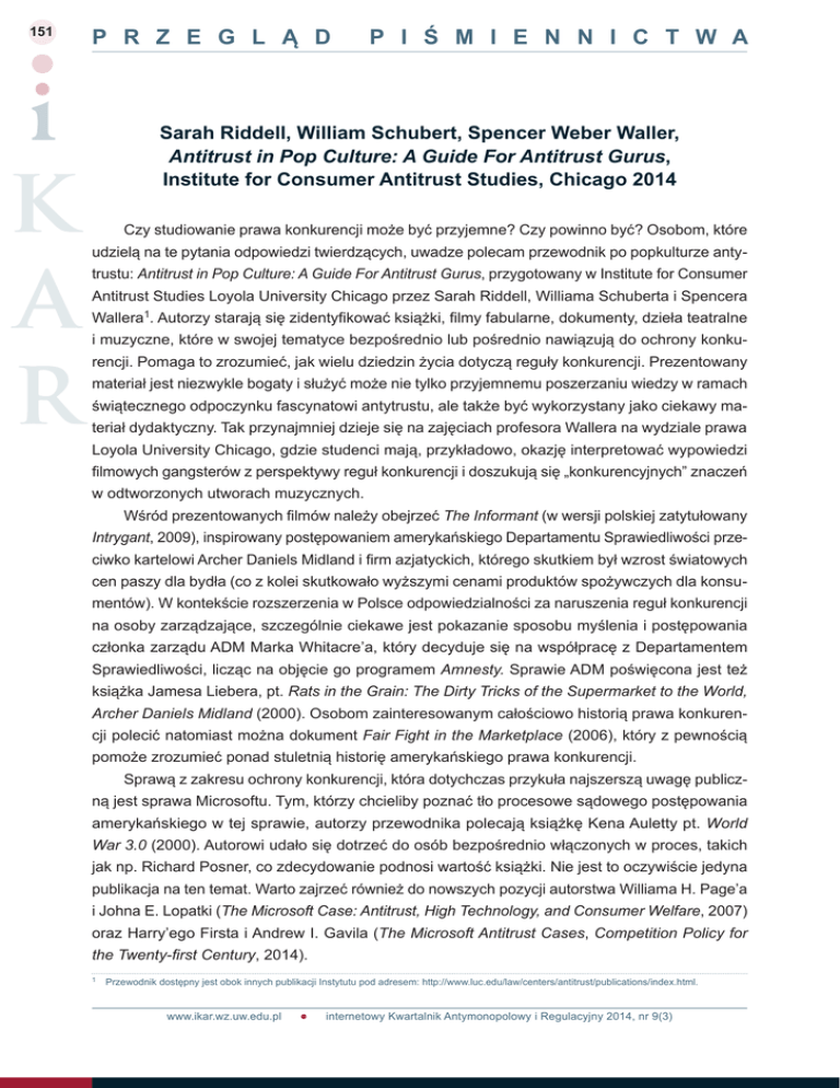 151 P R Z E G L Ą D P I Ś M I E N N I C T W A Sarah Riddell, William Schubert, Spencer Weber Waller, Antitrust in Pop Culture: A Guide For Antitrust Gurus, Institute for Consumer Antitrust Studies, Chicago 2014 Czy studiowanie prawa konkurencji może być przyjemne? Czy powinno być? Osobom, które udzielą na te pytania odpowiedzi twierdzących, uwadze polecam przewodnik po popkulturze antytrustu: Antitrust in Pop Culture: A Guide For Antitrust Gurus, przygotowany w Institute for Consumer Antitrust Studies Loyola University Chicago przez Sarah Riddell, Williama Schuberta i Spencera Wallera1. Autorzy starają się zidentyfikować książki, filmy fabularne, dokumenty, dzieła teatralne i muzyczne, które w swojej tematyce bezpośrednio lub pośrednio nawiązują do ochrony konkurencji. Pomaga to zrozumieć, jak wielu dziedzin życia dotyczą reguły konkurencji. Prezentowany materiał jest niezwykle bogaty i służyć może nie tylko przyjemnemu poszerzaniu wiedzy w ramach świątecznego odpoczynku fascynatowi antytrustu, ale także być wykorzystany jako ciekawy materiał dydaktyczny. Tak przynajmniej dzieje się na zajęciach profesora Wallera na wydziale prawa Loyola University Chicago, gdzie studenci mają, przykładowo, okazję interpretować wypowiedzi filmowych gangsterów z perspektywy reguł konkurencji i doszukują się „konkurencyjnych” znaczeń w odtworzonych utworach muzycznych. Wśród prezentowanych filmów należy obejrzeć The Informant (w wersji polskiej zatytułowany Intrygant, 2009), inspirowany postępowaniem amerykańskiego Departamentu Sprawiedliwości przeciwko kartelowi Archer Daniels Midland i firm azjatyckich, którego skutkiem był wzrost światowych cen paszy dla bydła (co z kolei skutkowało wyższymi cenami produktów spożywczych dla konsumentów). W kontekście rozszerzenia w Polsce odpowiedzialności za naruszenia reguł konkurencji na osoby zarządzające, szczególnie ciekawe jest pokazanie sposobu myślenia i postępowania członka zarządu ADM Marka Whitacre’a, który decyduje się na współpracę z Departamentem Sprawiedliwości, licząc na objęcie go programem Amnesty. Sprawie ADM poświęcona jest też książka Jamesa Liebera, pt. Rats in the Grain: The Dirty Tricks of the Supermarket to the World, Archer Daniels Midland (2000). Osobom zainteresowanym całościowo historią prawa konkurencji polecić natomiast można dokument Fair Fight in the Marketplace (2006), który z pewnością pomoże zrozumieć ponad stuletnią historię amerykańskiego prawa konkurencji. Sprawą z zakresu ochrony konkurencji, która dotychczas przykuła najszerszą uwagę publiczną jest sprawa Microsoftu. Tym, którzy chcieliby poznać tło procesowe sądowego postępowania amerykańskiego w tej sprawie, autorzy przewodnika polecają książkę Kena Auletty pt. World War 3.0 (2000). Autorowi udało się dotrzeć do osób bezpośrednio włączonych w proces, takich jak np. Richard Posner, co zdecydowanie podnosi wartość książki. Nie jest to oczywiście jedyna publikacja na ten temat. Warto zajrzeć również do nowszych pozycji autorstwa Williama H. Page’a i Johna E. Lopatki (The Microsoft Case: Antitrust, High Technology, and Consumer Welfare, 2007) oraz Harry’ego Firsta i Andrew I. Gavila (The Microsoft Antitrust Cases, Competition Policy for the Twenty-first Century, 2014). 1 Przewodnik dostępny jest obok innych publikacji Instytutu pod adresem: http://www.luc.edu/law/centers/antitrust/publications/index.html. www.ikar.wz.uw.edu.pl internetowy Kwartalnik Antymonopolowy i Regulacyjny 2014, nr 9(3) 152 Maciej Bernatt Sarah Riddell, William Schubert, Spencer Weber Waller, Antitrust in Pop Culture… Ciekawym zagadnieniem zarówno w amerykańskim, jak i europejskim prawie konkurencji jest stosowanie reguł konkurencji w sporcie. Może się wydawać, że co do zasady, bez względu na rodzaj dyscypliny sportowej, w tym zakresie nie powinno być wyjątków. By się przekonać, że to twierdzenie jest błędne warto sięgnąć po książkę Stuarta Bannera pt. The Baseball Trust: A History of Baseball’s Antitrust Exemption. Pokazuje ona, że baseball, jak żaden inny rodzaj sportu w USA, oparł się wpływowi reguł konkurencji. Amerykanie na pytanie: dlaczego tak się stało, odpowiadają – bo to baseball… Prawo konkurencji tworzą ludzie – zarówno przedsiębiorcy, jak i urzędnicy – o czym możemy się przekonać, sięgając po biografie. O przedsiębiorcy Johnie D. Rockefellerze i jego Standard Oil opowiada książka Rona Cherwona zatytułowa Titan. The Life of John D. Rockefeller, Sr. (1998). Biografię urzędnika przybliża nam natomiast książka Spencera Wallera pt. Thurman Arnold. A Biography (2005). Książka opowiada historię jednego z najbardziej wpływowych amerykańskich prawników – Thurmana Arnolda, szefa Antitrust Division Departamentu Sprawiedliwości w okresie New Deal i obrońcy w głośnych procesach osób oskarżanych o poglądy prokomunistyczne w czasach Mc Carthy’ego. A kiedy już zaczniemy czytać, to w tle należy słuchać rockowej muzyki Antitrust Division. Dopuszczalną, spokojniejszą alternatywą są Trzej Tenorzy (The Three Tenors), płyta która stała się podstawą do wypracowania w precedensowym wyroku D.C. Circuit testu inherently suspect w ramach którego możliwe jest stwierdzenie ograniczania konkurencji bez konieczności przeprowadzenia pełnej analizy w ramach reguły rozsądku (por. Polygram Holding v. FTC, 416 F. 3d 39, D.C. Cir. 2005). Zachęcam do zapoznania się ze wszystkimi materiałami prezentowanymi w omawianym przewodniku. Rozważyć też można stworzenie jego polskiej wersji. Czy, aby zrozumieć historię reguł rządzących polską gospodarką sięgnęlibyśmy po Ziemię Obiecaną Andrzeja Wajdy? Dr Maciej Bernatt Zakład Europejskiego Prawa Gospodarczego Wydziału Zarządzania UW; e-mail: [email protected] www.ikar.wz.uw.edu.pl internetowy Kwartalnik Antymonopolowy i Regulacyjny 2014, n