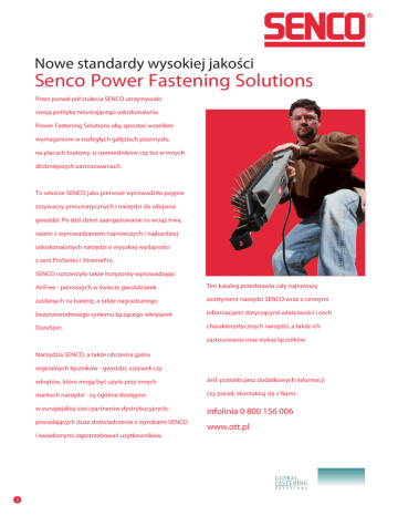 Nowe standardy wysokiej jakości Senco Power Fastening Solutions Przez ponad pół stulecia SENCO utrzymywało swoją politykę nieustającego udoskonalania Power Fastening Solutions aby sprostać wszelkim wymaganiom w rozległych gałęziach przemysłu, na placach budowy, u rzemieślników czy też w innych drobniejszych zastosowaniach. To właśnie SENCO jako pierwsze wprowadziło pojęcie zszywaczy pneumatycznych i narzędzi do wbijania gwoździ. Po dziś dzień zaangażowanie to wciąż trwa, razem z wprowadzaniem najnowszych i najbardziej udoskonalonych narzędzi o wysokiej wydajności z serii ProSeries i XtremePro. SENCO rozszerzyło także horyzonty wprowadzając AirFree - pierwszych w świecie gwoździarek Ten katalog przedstawia cały najnowszy zasilanych na baterię, a także nagradzanego asortyment narzędzi SENCO wraz z cennymi bezprzewodowego systemu łączącego wkrętarek informacjami dotyczącymi właściwości i cech DuraSpin. charakterystycznych narzędzi, a także ich zastosowania oraz wykaz łączników. Narzędzia SENCO, a także obszerna gama orginalnych łączników - gwoździ, zszywek czy wkrętów, które mogą być użyte przy innych Jeśli potrzebujesz dodatkowych informacji markach narzędzi - są ogólnie dostępne czy porad, skontaktuj się z Nami. w europejskiej sieci partnerów dystrybucyjnych, infolinia 0 800 156 006 posiadających duże doświadczenie z wyrobami SENCO i świadomymi zapotrzebowań użytkowników. 2 www.ott.pl Index Zszywacze - Tapicerstwo . . . . . . . SFW08 SFT10 . . . . . . . . . . . . . . . . . . SFW10XP . . . . . . . . . . . . . . . . 4 4 4 4 Zszywacze - Wykończenia . . . . . SLS15 L,M, 92 . . . . . . . . . . . . SLS18 L,M, 92 SLS20XP . . . . . . . . . . . . . . . . . SLS25XP . . . . . . . . . . . . . . . . . 5 5 5 5 5 Zszywacze - Szkielety konstrukcji . . . . . . . . . . . . . . SKS L, M, N . . . . . . . . . . . . . . . SNS41 . . . . . . . . . . . . . . . . . . SNS44XP . . . . . . . . . . . . . . . . SNS45XP . . . . . . . . . . . . . . . . SNS50 . . . . . . . . . . . . . . . . . . SQS55 . . . . . . . . . . . . . . . . . . PW150 . . . . . . . . . . . . . . . . . . PW200 . . . . . . . . . . . . . . . . . . 6-7 6 6 6 6 7 7 7 7 Sztyfciarki - Prace stolarskie, Wykończenia . . . . . . . . . . . . FIP10 . . . . . . . . . . . . . . . . . . . FIP15 . . . . . . . . . . . . . . . . . . . FIP18 SLP20XP . . . . . . . . . . . . . . . . . FIP25XP . . . . . . . . . . . . . . . . . FIP32 . . . . . . . . . . . . . . . . . . . FIP35 . . . . . . . . . . . . . . . . . . . FP42XP . . . . . . . . . . . . . . . . . FP2N1 . . . . . . . . . . . . . . . . . . 8-10 8 8 8 8 9 9 9 10 10 Gwoździarki - Szkielety konstrukcji . . . . . . . . . . . . . . FP601 . . . . . . . . . . . . . . . . . . FP651 . . . . . . . . . . . . . . . . . . FP701 . . . . . . . . . . . . . . . . . . FP751 . . . . . . . . . . . . . . . . . . FP701XP . . . . . . . . . . . . . . . . FP751XP . . . . . . . . . . . . . . . . FP702XP . . . . . . . . . . . . . . . . FP752XP . . . . . . . . . . . . . . . . FP602 . . . . . . . . . . . . . . . . . . FP652 . . . . . . . . . . . . . . . . . . SN902XP . . . . . . . . . . . . . . . . STN130 . . . . . . . . . . . . . . . . . 11-12 11 11 11 11 11 11 12 12 12 12 12 12 Gwoździarki bębnowe, Szkielety konstrukcji, palety . . . SCN34 . . . . . . . . . . . . . . . . . . SCN45 . . . . . . . . . . . . . . . . . . SCN90 . . . . . . . . . . . . . . . . . . . PAL 57 PAL 70 .................. PAL 83 .................. PAL 90 SCN65 . . . . . . . . . . . . . . . . . . . 13-15 13 13 13 14 14 14 15 15 Gwoździarki bębnowe - Dachy . . . 16 RoofPro450 . . . . . . . . . . . . . . 16 Narzędzia specjalistyczne . . . . . SHF15 . . . . . . . . . . . . . . . . . . SHF50 . . . . . . . . . . . . . . . . . . STN64 . . . . . . . . . . . . . . . . . . SCF15 . . . . . . . . . . . . . . . . . . DFP . . . . . . . . . . . . . . . . . . . . F75 . . . . . . . . . . . . . . . . . . . . 17-18 17 17 18 18 18 18 Gwoździarki gazowe . . . . . . . . . GT90 19 19 Sztyfciarki zasilane baterią Cordless Finish 25 Cordless Finish 32 Cordless Finish 41 20 20 20 20 ..... ......... ......... ......... DuraSpin - Wkrętarki DuraSpin DS200-AC DuraSpin DS300-AC DuraSpin DS275-AC DuraSpin DS202-14v DuraSpin DS205-14v DuraSpin DS275-18v DuraSpin DS300-24v ....... ....... ....... ....... ....... ....... ....... ....... 21-24 21 21 22 23 23 24 24 Wiertarki i Wkrętarki ...... SEN610 ................. SEN611 ................. SEN612 ................. SEN510 ................. SEN511 ................. 25 25 25 25 25 25 Kompresory bezolejowe PC1010 PC0968 ..... 26 26 26 Kompresory olejowe PC2225 PC0967 ..... 27 27 27 Narzędzia pozostałe . . . . 28 SFW05 . . . . . . . . . . . . . . . . . . 28 ELPA BOX . . . . . . . . . . . . . . . 28 Łączniki . . . . . . . . . . . . . . . . . . . . 29-35 Zszywki ................ 29-31 Sztyfty ................ 32 Gwoździe . . . . . . . . . . . . . . . . 33-34 Wkręty Duraspin . . . . . . . . . . . 35 Oleje do narzędzi pneumatycznych 36 PC0101 36 PC0102 . . . . . . . . . . . . . . . . . . . . 36 PC0103 . . . . . . . . . . . . . . . . . . . . 36 Olej do kompresorów . . . . . . . . . PC0344 36 36 3 Zszywacze - Tapicerstwo SFW08 Wysokość: 152 mm Długość: 229 mm Waga: 1,0 kg nr ref. 207055 Zalety t Kierunek wylotu powietrza od tyłu t Łatwe otwieranie magazynku t Metalowy magazynek t Wbijak wykonany z utwardzonej stali t Bardzo długa płyta czołowa t Miękka rękojeść t Wskaźnik ponownego ładowania 6 12 B 10 8 12 6 C 16 AT (80) Zastosowanie Meble tapicerowane, izolacje, ściany tylne, listwy profilowane, prace wykończeniowe, scalanie ram obrazów, przemysł motoryzacyjny SFT10 Wysokość: 155 mm 10 8 12 14 6 16 345 8 10 Pojemność: 190 zszywek Zszywka TYP 80: - 80/10 mm - nr ref. 207379 - 80/16 mm - nr ref. 207380 Długość: 218 mm Waga: 0,9 kg 8 10 13 Zalety 6 t Wchodzi w szczelinę grubości 25 mm t Dostępny model z wydłużoną płytą czołową B t Opły