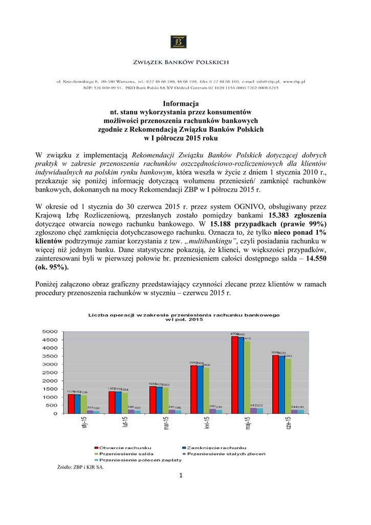 Informacja nt. stanu wykorzystania przez konsumentów możliwości przenoszenia rachunków bankowych zgodnie z Rekomendacją Związku Banków Polskich w I półroczu 2015 roku W związku z implementacją Rekomendacji Związku Banków Polskich dotyczącej dobrych praktyk w zakresie przenoszenia rachunków oszczędnościowo-rozliczeniowych dla klientów indywidualnych na polskim rynku bankowym, która weszła w życie z dniem 1 stycznia 2010 r., przekazuje się poniżej informację dotyczącą wolumenu przeniesień/ zamknięć rachunków bankowych, dokonanych na mocy Rekomendacji ZBP w I półroczu 2015 r. W okresie od 1 stycznia do 30 czerwca 2015 r. przez system OGNIVO, obsługiwany przez Krajową Izbę Rozliczeniową, przesłanych zostało pomiędzy bankami 15.383 zgłoszenia dotyczące otwarcia nowego rachunku bankowego. W 15.188 przypadkach (prawie 99%) zgłoszono chęć zamknięcia dotychczasowego rachunku. Oznacza to, że tylko nieco ponad 1% klientów podtrzymuje zamiar korzystania z tzw. „multibankingu”, czyli posiadania rachunku w więcej niż jednym banku. Dane statystyczne pokazują, że klienci, w większości przypadków, zainteresowani byli w pierwszej połowie br. przeniesieniem całości dostępnego salda – 14.550 (ok. 95%). Poniżej załączono obraz graficzny przedstawiający czynności zlecane przez klientów w ramach procedury przenoszenia rachunków w styczniu – czerwcu 2015 r. Źródło: ZBP i KIR SA. 1 Od początku funkcjonowania Rekomendacji ZBP przeniesiono w ramach systemu OGNIVO 97.567 rachunków bankowych. Poniższy wykres obrazuje liczbę przeniesionych rachunków bankowych w latach 2010-2014 oraz w I poł. 2015 roku. Źródło: ZBP i KIR SA. Nieprzerwanie od roku 2010 utrzymuje się tendencja umiarkowanego wzrostu zainteresowania konsumentów korzystaniem z możliwości stworzonych przez polskie środowisko bankowe oraz zwiększania się liczby klientów przenoszących rachunki bankowe w formule zaproponowanej przez Związek Banków Polskich. Uwzględniając fakt, że tendencja ta wyraźnie nasila się w drugiej połowie roku, to na podstawie danych z okresu od stycznia do czerwca br. można prognozować, że w całym roku 2015 liczba klientów przenoszących swoje rachunki bankowe na zasadach określonych w Rekomendacji ZBP osiągnie rekordowy poziom w ciągu 6 lat jej funkcjonowania na polskim rynku. Jak wynika z raportu TNS Polska z czerwca br., jako czynnik skłaniający klientów do zmiany banku na pierwszym miejscu wskazuje się działania prowadzone przez konkurencję, tj. zachęty ze strony innego banku (74% ankietowanych). W dalszej kolejności bankowcy podają – jako powód rezygnacji klientów z usług dotychczasowego banku – wysokie opłaty i prowizje (60%), niemiłą obsługę (28%) i nieatrakcyjną ofertę w aktualnym banku (24%). Rzadziej wskazywane są kwestie dostępności bankomatów (13%) czy dostępu do usług bankowości internetowej i mobilnej (8%). 2 Źródło: TNS Polska na zlecenie ZBP . Poniżej załączono wykres przedstawiający liczbę przeniesionych rachunków bankowych w poszczególnych miesiącach I poł. 2010 – 2015 r. Źródło: ZBP i KIR SA. 3 Jednocześnie należy przypomnieć, że z dniem 17 września 2014 r. weszła w życie zapowiadana Dyrektywa Parlamentu Europejskiego i Rady w sprawie porównywalności opłat za prowadzenie rachunku płatniczego, przenoszenia rachunku płatniczego oraz dostępu do podstawowego rachunku płatniczego (tzw. Dyrektywa PAD), która zastąpi w zakresie przenoszenia rachunków obowiązujące dotychczas samoregulacyjne porozumienie europejskiego środowiska bankowego. Termin na jej implementacji do krajowych porządków prawnych upływa z dniem 18 września 2016 r. Rekomendacja ZBP realizuje europejskie standardy w zakresie przenoszenia rachunków, ujęte w Dyrektywie, jak i projektowanej ustawie o zmianie ustawy o usługach płatniczych implementującej dyrektywę PAD. Związek Banków Polskich bierz udział w pracach Ministerstwa Finansów nad tym projektem – przedłożył stanowisko środowiska bankowego w toku dwóch rund konsultacji roboczych przedmiotowego projektu (w marcu i maju br.). Jeszcze w lipcu br. projekt ustawy zostanie przekazany na formalną ścieżkę uzgodnień międzyresortowych i konsultacji społecznych. W celu uzyskania bardziej szczegółowych informacji związanych z niniejszym zagadnieniem prosimy o kontakt z Panem Norbertem Jeziolowiczem (tel. 22-4868110 oraz e-mail: [email protected]) lub Panią Olgą Naszkiewicz (tel. 22-4868148 oraz e-mail: [email protected]). Sporządziła: Olga Naszkiewicz Warszawa, dnia 13 lipca 2015 roku 4