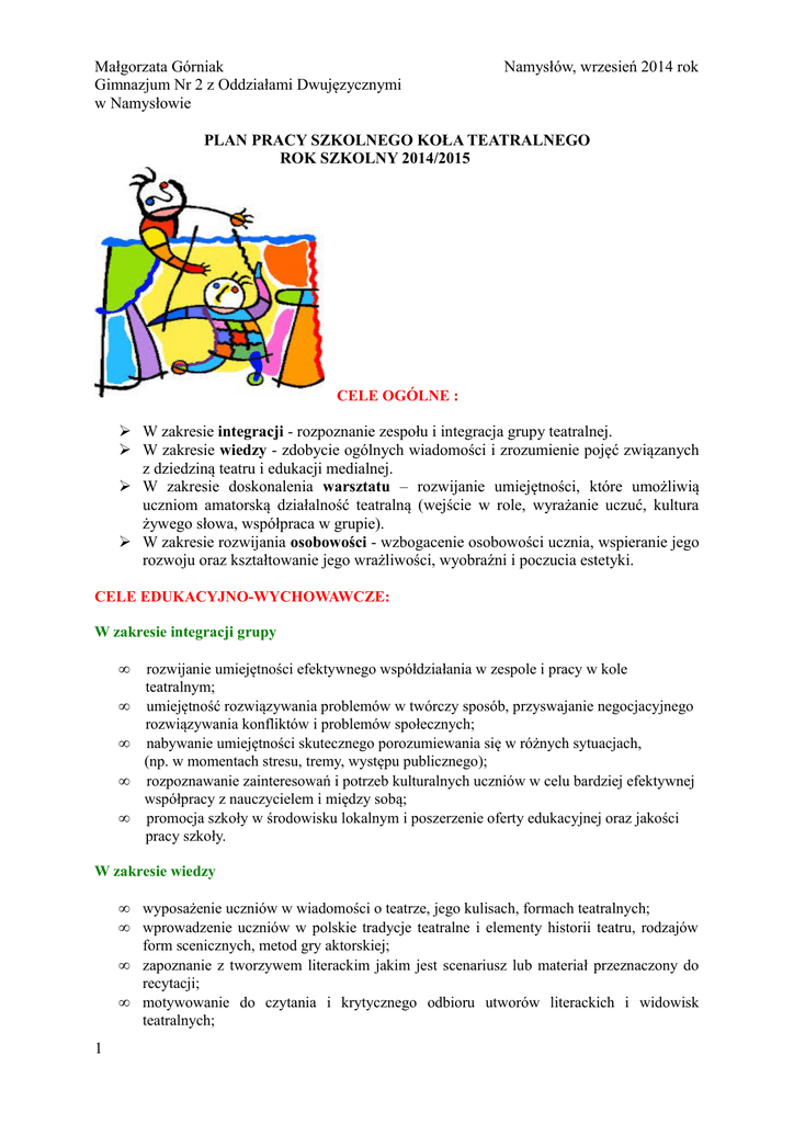 Małgorzata Górniak Gimnazjum Nr 2 z Oddziałami Dwujęzycznymi w Namysłowie Namysłów, wrzesień 2014 rok PLAN PRACY SZKOLNEGO KOŁA TEATRALNEGO ROK SZKOLNY 2014/2015 CELE OGÓLNE : W zakresie integracji - rozpoznanie zespołu i integracja grupy teatralnej. W zakresie wiedzy - zdobycie ogólnych wiadomości i zrozumienie pojęć związanych z dziedziną teatru i edukacji medialnej. W zakresie doskonalenia warsztatu – rozwijanie umiejętności, które umożliwią uczniom amatorską działalność teatralną (wejście w role, wyrażanie uczuć, kultura żywego słowa, współpraca w grupie). W zakresie rozwijania osobowości - wzbogacenie osobowości ucznia, wspieranie jego rozwoju oraz kształtowanie jego wrażliwości, wyobraźni i poczucia estetyki. CELE EDUKACYJNO-WYCHOWAWCZE: W zakresie integracji grupy • • • • • rozwijanie umiejętności efektywnego współdziałania w zespole i pracy w kole teatralnym; umiejętność rozwiązywania problemów w twórczy sposób, przyswajanie negocjacyjnego rozwiązywania konfliktów i problemów społecznych; nabywanie umiejętności skutecznego porozumiewania się w różnych sytuacjach, (np. w momentach stresu, tremy, występu publicznego); rozpoznawanie zainteresowań i potrzeb kulturalnych uczniów w celu bardziej efektywnej współpracy z nauczycielem i między sobą; promocja szkoły w środowisku lokalnym i poszerzenie oferty edukacyjnej oraz jakości pracy szkoły. W zakresie wiedzy • • • • 1 wyposażenie uczniów w wiadomości o teatrze, jego kulisach, formach teatralnych; wprowadzenie uczniów w polskie tradycje teatralne i elementy historii teatru, rodzajów form scenicznych, metod gry aktorskiej; zapoznanie z tworzywem literackim jakim jest scenariusz lub materiał przeznaczony do recytacji; motywowanie do czytania i krytycznego odbioru utworów literackich i widowisk teatralnych; • • przygotowanie do dalszej edukacji teatralnej w następnych etapach edukacyjnych; wzbogacenie w wiedzę o człowieku, życiu i świecie poprzez przeżywanie, wczuwanie się w role oraz dystansowanie się od emocji kreowanych postaci. W zakresie doskonalenia warsztatu - umiejętności • • • • • pobudzanie uczniów do działań rozwijających zdolności aktorskie, recytatorskie, plastyczne, muzyczne i taneczne; ćwiczenie sprawności poprawnego wypowiadania się uczniów i recytacji tekstów: właściwej wymowy, modulacji głosu, doboru jego siły, pauzowania, intonacji i poprawnego akcentowania wyrazowego i zdaniowego; rozwijanie umiejętności prezentacji na scenie i wyrażania uczuć i stanów emocjonalnych poprzez gesty, ruch, mowę ciała i mimikę; poszukiwanie i wykorzystywanie informacji z różnych źródeł oraz efektywne posługiwanie się technologią informacyjną: (tworzenie własnych słowników terminologii teatralnej, redagowanie zaproszeń, planowanie przedsięwzięć teatralnych – gdzie, kiedy, kto i co jest grane itp.); wykorzystanie w praktyce zdobytej wiedzy (przygotowywanie inscenizacji, opracowanie i wykonywanie scenografii, dobór kostiumów, odpowiednia prezencja na scenie, zastosowanie zasad kultury żywego słowa, umiejętność adaptacji utworu literackiego na scenariusz teatralny). W zakresie rozwijania osobowości uczniów • • • • • wspieranie psychologicznych aspektów rozwoju uczniów; rozbudzanie dociekliwości intelektualnej, samodzielności i rozwój sprawności umysłowych i uzdolnień, wyzwalanie w uczniach możliwości kreacyjnych, ćwiczenia zmysłów słuchu, wzroku, dotyku, koncentracji poprzez zabawy ogólnorozwojowe i gry dramowe; uwrażliwienie na sztukę i kształtowanie postawy aktywnego odbiorcy; przygotowanie do funkcjonowania w różnych rolach społecznych poprzez umiejętność wchodzenia w rozmaite role; rozwijanie pozytywnych cech charakteru (m.in. odpowiedzialność za słowa i czyny, tolerancja, otwartość) i postaw (działania na rzecz innych zwłaszcza młodszych i mniej doświadczonych, szacunek dla pracy drugiego człowieka). METODY I FORMY PRACY: 1. 2. 3. 4. 5. 6. 7. 8. Wizyty w teatrach (przynajmniej dwa razy w roku); Zajęcia teatralne prowadzone przez profesjonalistów (instruktorów teatralnych, aktorów); Współpraca z lokalnymi animatorami życia kulturalnego (np. w NOK-u); Przygotowywanie spektakli, inscenizacji, uroczystości, apeli; Przygotowywanie , kostiumów, scenografii, podkładów muzycznych i rekwizytów; Próby opracowania scenariuszy teatralnych; Prezentacje dokonań na forum szkoły, dla rodziców, środowiska lokalnego; Konfrontowanie swoich umiejętności poprzez udział w przeglądach teatralnych, konkursach i turniejach wiedzy; 9. Nawiązanie kontaktów z innymi grupami o podobnych zainteresowaniach; wymiana doświadczeń; 10. Wykorzystanie dramy i umiejętności zdobytych podczas zajęć koła w procesie dydaktyczno-wychowawczym; 11. Ćwiczenie kultury żywego słowa (np. przygotowywanie recytacji na konkurs lub w ramach procesu realizacji programu); 12. Zorganizowanie szkolnego Konkursu „Wiedzy o teatrze”; 2 13. Redagowanie zaproszeń i przygotowywanie materiałów promujących działalność koła (np. strona internetowa szkoły, wystawa zdjęć, informacje w lokalnej prasie…). 14. Śledzenie ciekawych imprez kulturalnych w regionie; 15. Współpraca z Namysłowskim Ośrodkiem Kultury i Gminną Biblioteką Publiczną w Namysłowie; 16. Nawiązanie kontaktów z kołem teatralnym w zaprzyjaźnionej szkole; wymiana doświadczeń, spotkania; 17. Wizyta na próbie i za kulisami teatru profesjonalnego w Opolu lub we Wrocławiu; 18. Akcentowanie Międzynarodowego Dnia Teatru (27 marca) – konkurs wiedzy o teatrze; 19. Udział w Konkursach recytatorskich organizowanych np. przez szkołę, gminę; 20. Przygotowywanie akademii z okazji świąt narodowych, oprawy uroczystości szkolnych; TREŚCI NAUCZANIA Wiedza o teatrze • Składniki dzieła teatralnego, ich twórcy i znaczenie: scenografia, kostiumy, charakteryzacja, rekwiz