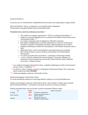 Szanowni Państwo, Cieszymy się, że wielu klientów niejednokrotnie powierzyło nam organizację swojego urlopu. Dla tych Klientów, którzy co najmniej 3 razy spędzili urlop z katalogów Neckermann"a przygotowaliśmy kartę Neckermann Klub Posiadanie karty zapewnia atrakcyjne przywileje *: • • • • • • • • • 10% zniżki na wynajem samochodu w AVIS na wybranych kierunkach ** zniżkę na wycieczki fakultatywne na wybranych kierunkach oferowanych przez Neckermann Polska *** 5% zniżki na ubezpieczenie kompleksowe Mondial Assistance brak opłaty manipulacyjnej za zmianę dokonaną na więcej niż 30 dni przed terminem wyjazdu (w przypadku mieszkań wakacyjnych powyżej 45 dni) regularne informacje na temat ofert specjalnych i Last Minute na podany adres email właściciele karty w pierwszej kolejności otrzymają nasze nowe katalogi 20% zniżki na bilety na mecze drużyny Neckermann AZS Politechnika Warszawska 5% zniżki na podróż dla nowożeńców z katalogów Neckermann Polska 2 razy w roku po zakończeniu sezonu letniego i zimowego odbędzie się losowanie cennych nagród rzeczowych dla właścicieli kart, którzy dokonali rezerwacji w danym sezonie. * w/w zniżki przysługują właścicielowi karty, wspólnie podróżującej osobie towarzyszącej i dwójce dzieci, z wyjątkiem *** ** nie dotyczy oferty wynajmu zawartej w katalogach Neckermann Polska. Przy rezerwacji należy podać kod zniżki P812000. *** zniżka przysługuje wyłącznie właścicielowi karty. Zniżki przysługujące właścicielowi karty: W wielu kierunkach urlopowych otrzymają Państwa zniżkę na wycieczki fakultatywne. Zniżka ta przysługuje wyłącznie właścicielowi karty. Aby uzyskać tę zniżkę, proszę okazać kartę Neckermann Klub w momencie rezerwacji wycieczki u naszego rezydenta. Poniżej przedstawiamy listę wycieczek, na które otrzymacie Państwo rabat . Cel Zniżka Nazwa wycieczki Tunezja 10% Wycieczki autokarowe Gran Canaria 20% Wycieczki Iberoservice w języku polskim Maroko 5% Wycieczka Cala Iris Masaże w Argan Palace Hurghada 10% Wycieczki autokarowe Marsa Alam 10% Wycieczki autokarowe Dominikana 10% Megatruck Caribbean Festival Tajlandia 10% Wycieczki agencji Travel Center Asia Jamajka 5 USD Sri Lanka 10% Wszystkie wycieczki Wenezuela 50% Jeep Safari Fantastyczne Port Antonio dla Gości hoteli Iberostar i Gran Bahia
