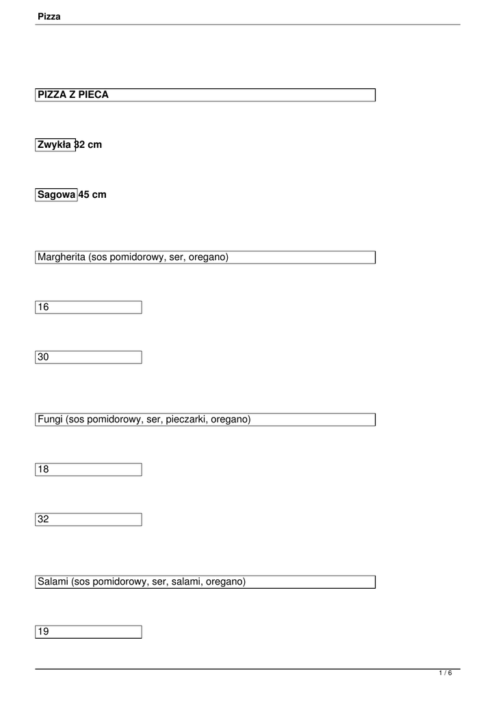 Pizza PIZZA Z PIECA Zwykła 32 cm Sagowa 45 cm Margherita (sos pomidorowy, ser, oregano) 16 30 Fungi (sos pomidorowy, ser, pieczarki, oregano) 18 32 Salami (sos pomidorowy, ser, salami, oregano) 19 1/6 Pizza 32 Vesuvio(sos pomidorowy, ser szynka, oregano) 19 32 Hawai (sos pomidorowy, ser, szynka, ananas, oregano) 19 34 Capriciosa (sos pomidorowy, ser, pieczarki, szynka, oregano) 19 34 2/6 Pizza Diabelska (sos pomidorowy, ser, papryka pepperoni, salami, cebula, sos słodkie chili, oregano) 19 34 Grecka (sos pomidorowy, ser, feta, oliwki, pomidor, oregano) 22 38 Chicken Pizza (sos pomidorowy, ser, kurczak, cebula, papryka konserwowa, kukurydza, oregano) 22 40 Spinaci (sos pomidorowy, ser, kurczak, szpinak, ser lazur, czosnek, jajo, oregano) 22 3/6 Pizza 40 Wiejska (sos pomidorowy, ser, ogórek kiszony, cebula, boczek, pieczarki, papryka konserwowa, kiełbas 23 44 Cztery Sery (sos pomidorowy, ser, feta, ser lazur, camembert, oregano) 24 44 Sagowy Specjał (sos pomidorowy, ser, kurczak, boczek, szynka, kiełbasa, cebula, oregano) 24 45 4/6 Pizza DODATKI Sos (czosnkowy, pomidorowy, coctajlowy), cebula 2 Pieczarki, por, pomidor, ogórek, oliwki, peperoni, kukurydza, papryka, ananas, brokuły 3 6 Ser, ser feta, szynka, boczek, tuńczyk 3 6 5/6 Pizza Łosoś wędzony, kurczak, salami, owoce morza 4 8 6/6