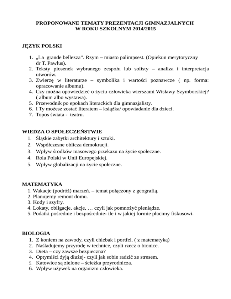 PROPONOWANE TEMATY PREZENTACJI GIMNAZJALNYCH W ROKU SZKOLNYM 2014/2015 JĘZYK POLSKI 1. „La grande bellezza”. Rzym – miasto palimpsest. (Opiekun merytoryczny dr T. Pawlus). 2. Teksty piosenek wybranego zespołu lub solisty – analiza i interpretacja utworów. 3. Zwierzę w literaturze – symbolika i wartości poznawcze ( np. forma: opracowanie albumu). 4. Czy można opowiedzieć o życiu człowieka wierszami Wisławy Szymborskiej? ( album albo wystawa). 5. Przewodnik po epokach literackich dla gimnazjalisty. 6. I Ty możesz zostać literatem – książka/ opowiadanie dla dzieci. 7. Topos świata - teatru. WIEDZA O SPOŁECZEŃSTWIE 1. Śląskie zabytki architektury i sztuki. 2. Współczesne oblicza demokracji. 3. Wpływ środków masowego przekazu na życie społeczne. 4. Rola Polski w Unii Europejskiej. 5. Wpływ globalizacji na życie społeczne. MATEMATYKA 1. Wakacje (podróż) marzeń. – temat połączony z geografią. 2. Planujemy remont domu. 3. Kody i szyfry. 4. Lokaty, obligacje, akcje, … czyli jak pomnożyć pieniądze. 5. Podatki pośrednie i bezpośrednie- ile i w jakiej formie płacimy fiskusowi. BIOLOGIA 1. Z koniem na zawody, czyli chlebak i portfel. ( z matematyką) 2. Naśladujemy przyrodę w technice, czyli rzecz o bionice. 3. Dieta – czy zawsze bezpieczna? 4. Optymiści żyją dłużej- czyli jak sobie radzić ze stresem. 5. Katowice są zielone – ścieżka przyrodnicza. 6. Wpływ używek na organizm człowieka. GEOGRAFIA 1. Niezwykłe plemiona na Ziemi i ich tajemnice. 2. Barwy kontynentów. 3. Pustynia niejedno ma imię. 4. Tajemnice morskich głębin. 5. Biel czy czerń czyli kontrasty w geografii. HISTORIA 1. „W każdej legendzie jest ziarno prawdy”- rola legend w historii; 2. Wielcy wodzowie Rzeczypospolitej szlacheckiej; 3. „Na co dzień i od święta” -obyczaje szlachty polskiej w XVII i XVIII wieku; 4. Patroni Polski- rola świętych w tradycji państwa polskiego; 5. Charakter, duma i siła- najsłynniejsze polskie królowe. RELIGIA 1. Dlaczego warto zobaczyć Rzym? 2. Symbolika w Apokalipsie św. Jana Apostoła. 3. Orędzie objawień Maryjnych. 4. Cuda Jezusa w Nowym Testamencie. 5. Ziemia Święta – Śladami Jezusa. Historia i Geografia biblijna miejsc związanych z życiem i działalnością Jezusa. FIZYKA 1. Jeden dzień z fizyką- wybrane zjawiska fizyczne obserwowane w ciągu dnia. 2. Izaak Newton- życie (na tle epoki), osiągnięcia naukowe ze szczególnym uwzględnieniem zasad dynamiki 3. Archimedes – życie na tle epoki, odkrycia naukowe ze szczególnym uwzględnieniem prawa Archimedesa. 4. Fizyka jest ciekawa 5. Czy fizyka jest obecna w naszym domu? CHEMIA 1.Świat wskaźników pH. 2. Chemia w kuchni. 3. Barwy i zapachy chemii. 4. Historia szczepionki (temat chemia + biologia). TECHNIKA 1.Historia motoryzacji w Polsce. 2.Wybitni polscy wynalazcy z dziedziny techniki . 3. Ochrona środowiska naturalnego. 4.Zabytki techniki w moim regionie. 5. Poradnik początkującego fotografa - czyli jak robić dobre zdjęcia. JĘZYK ANGIELSKI Agnieszka Owczarek: 1.American Dream- Czy życie za oceanem daje nam większe szanse? 2.Muzyka popularna w Wielkiej Brytanii od lat 60-tych do współczesności. Iwona Langer: 1.Survival English- niezbędnik turysty w Wielkiej Brytanii. 2.Brytyjska rodzina królewska. 3.W krainie kangurów. Katarzyna Najder: 1.Jak zachęcić zagranicznych turystów do zwiedzania naszego miasta?- ilustrowany przewodnik po naszym mieście dla turystów zagranicznych. 2…..i dlatego właśnie warto uczyć się angielskiego. Film zachęcający do nauki języka angielskiego JĘZYK NIEMIECKI Das Deutschland-ABC (Niemcy od A do Z – alfabet skojarzeń) Deutsche Erfindungen, die die Welt veränderten (Niemieckie wynalazki, które zmieniły nasz świat) Austauschwerbung – mach mit! (Reklama wymiany, mająca na celu zachęcenie kolejnych roczników do udziału w wymianie) Deutsch ist international (Niemiecki jest językiem międzynarodowym – internacjonalizmy w języku niemieckim) Küche unserer Nachbarn – multimediales deutsches Kochbuch (Kuchnia naszych sąsiadów – multimedialna książka kucharska) JĘZYK HISZPAŃSKI 1. Wirtualny spacer po Hiszpanii jej zabytkach i historii. 2. Hiszpańskojęzyczne abecadło. Alfabet skojarzeń. 3. Europejska stolica Kultury 2016. San Sebastian i Wrocław. 4. Hiszpańskie wynalazki. Hiszpańska gospodarka, jej osiągnięcia i kryzys. 5. Fiesta espaniola. Tradycje i święta w hiszpańskojęzycznym kręgu kulturowym. INFORMATYKA 1. Internet- jak to działa?. 2. Od filmu nakręconego telefonem komórkowym do Youtuba. 3. Wirtualna wycieczka po mojej szkole. 4. Serwisy społecznościowe - jak działają, dlaczego je tak lubimy?. 5. Komunikatory internetowe, zasada działania, najważniejsze funkcje.