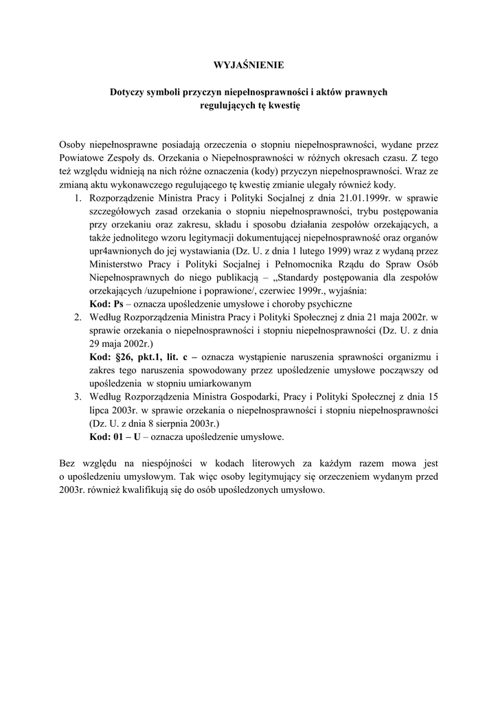 WYJAŚNIENIE Dotyczy symboli przyczyn niepełnosprawności i aktów prawnych regulujących tę kwestię Osoby niepełnosprawne posiadają orzeczenia o stopniu niepełnosprawności, wydane przez Powiatowe Zespoły ds. Orzekania o Niepełnosprawności w różnych okresach czasu. Z tego też względu widnieją na nich różne oznaczenia (kody) przyczyn niepełnosprawności. Wraz ze zmianą aktu wykonawczego regulującego tę kwestię zmianie ulegały również kody. 1. Rozporządzenie Ministra Pracy i Polityki Socjalnej z dnia 21.01.1999r. w sprawie szczegółowych zasad orzekania o stopniu niepełnosprawności, trybu postępowania przy orzekaniu oraz zakresu, składu i sposobu działania zespołów orzekających, a także jednolitego wzoru legitymacji dokumentującej niepełnosprawność oraz organów upr4awnionych do jej wystawiania (Dz. U. z dnia 1 lutego 1999) wraz z wydaną przez Ministerstwo Pracy i Polityki Socjalnej i Pełnomocnika Rządu do Spraw Osób Niepełnosprawnych do niego publikacją – „Standardy postępowania dla zespołów orzekających /uzupełnione i poprawione/, czerwiec 1999r., wyjaśnia: Kod: Ps – oznacza upośledzenie umysłowe i choroby psychiczne 2. Według Rozporządzenia Ministra Pracy i Polityki Społecznej z dnia 21 maja 2002r. w sprawie orzekania o niepełnosprawności i stopniu niepełnosprawności (Dz. U. z dnia 29 maja 2002r.) Kod: §26, pkt.1, lit. c – oznacza wystąpienie naruszenia sprawności organizmu i zakres tego naruszenia spowodowany przez upośledzenie umysłowe począwszy od upośledzenia w stopniu umiarkowanym 3. Według Rozporządzenia Ministra Gospodarki, Pracy i Polityki Społecznej z dnia 15 lipca 2003r. w sprawie orzekania o niepełnosprawności i stopniu niepełnosprawności (Dz. U. z dnia 8 sierpnia 2003r.) Kod: 01 – U – oznacza upośledzenie umysłowe. Bez względu na niespójności w kodach literowych za każdym razem mowa jest o upośledzeniu umysłowym. Tak więc osoby legitymujący się orzeczeniem wydanym przed 2003r. również kwalifikują się do osób upośledzonych umysłowo.