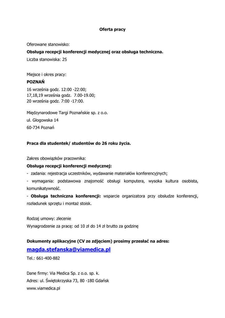 Oferta pracy Oferowane stanowisko: Obsługa recepcji konferencji medycznej oraz obsługa techniczna. Liczba stanowiska: 25 Miejsce i okres pracy: POZNAŃ 16 września godz. 12:00 -22:00; 17,18,19 września godz. 7.00-19.00; 20 września godz. 7:00 -17:00. Międzynarodowe Targi Poznańskie sp. z o.o. ul. Głogowska 14 60-734 Poznań Praca dla studentek/ studentów do 26 roku życia. Zakres obowiązków pracownika: Obsługa recepcji konferencji medycznej: - zadania: rejestracja uczestników, wydawanie materiałów konferencyjnych; - wymagania: podstawowa znajomość obsługi komputera, wysoka kultura osobista, komunikatywność. - Obsługa techniczna konferencji: wsparcie organizatora przy obsłudze konferencji, rozładunek sprzętu i montaż stoisk. Rodzaj umowy: zlecenie Wynagrodzenie za pracę: od 10 zł do 14 zł brutto za godzinę Dokumenty aplikacyjne (CV ze zdjęciem) prosimy przesłać na adres: [email protected] Tel.: 661-400-882 Dane firmy: Via Medica Sp. z o.o. sp. k. Adres: ul. Świętokrzyska 73, 80 -180 Gdańsk www.viamedica.pl