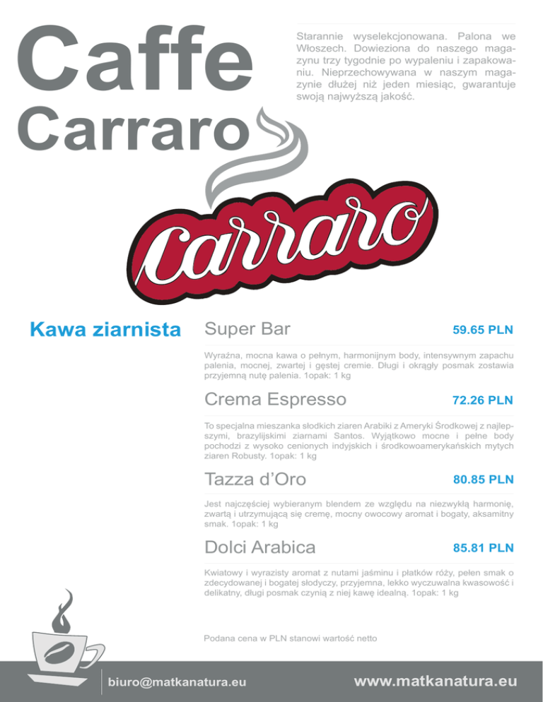 Caffe Carraro Kawa ziarnista Starannie wyselekcjonowana. Palona we Włoszech. Dowieziona do naszego magazynu trzy tygodnie po wypaleniu i zapakowaniu. Nieprzechowywana w naszym magazynie dłużej niż jeden miesiąc, gwarantuje swoją najwyższą jakość. Super Bar 59.65 PLN Wyraźna, mocna kawa o pełnym, harmonijnym body, intensywnym zapachu palenia, mocnej, zwartej i gęstej cremie. Długi i okrągły posmak zostawia przyjemną nutę palenia. 1opak: 1 kg Crema Espresso 72.26 PLN To specjalna mieszanka słodkich ziaren Arabiki z Ameryki Środkowej z najlepszymi, brazylijskimi ziarnami Santos. Wyjątkowo mocne i pełne body pochodzi z wysoko cenionych indyjskich i środkowoamerykańskich mytych ziaren Robusty. 1opak: 1 kg Tazza d’Oro 80.85 PLN Jest najczęściej wybieranym blendem ze względu na niezwykłą harmonię, zwartą i utrzymującą się cremę, mocny owocowy aromat i bogaty, aksamitny smak. 1opak: 1 kg Dolci Arabica 85.81 PLN Kwiatowy i wyrazisty aromat z nutami jaśminu i płatków róży, pełen smak o zdecydowanej i bogatej słodyczy, przyjemna, lekko wyczuwalna kwasowość i delikatny, długi posmak czynią z niej kawę idealną. 1opak: 1 kg Podana cena w PLN stanowi wartość netto [email protected] www.matkanatura.eu Caffe Carraro 1972 320.68 PLN Mieszanka 1927 to efekt syntezy ponad 80 lat doświadczeń oraz umiejętności nabytych przez właścicieli palarni Caffe Carraro w przygotowywaniu włoskiego espresso. Mieszanka ta Powstała ona na drodze starannego doboru, z 8 różnych ziaren Arabik najwyższej jakości. Ziarna te wyhodowano na najlepszych plantacjach. W filiżance znajdziemy bardzo dobrze zbalansowaną strukturę, jedwabistą kremowość, intensywny aromat, pełne body i długi posmak czekolady. Cechuje ją niska zwartość kofeiny. Wypalana tradycyjną metodą powolnego palenia. Pakowana w kontrolowanej atmosferze. 100% ziaren Arabiki.1opak: 3 kg Linia vending Kawa mielona Linia kaw typu vending, gdzie większą część mieszanki stanowią ziarna robusty. Najlepsza w parze z ekspresem automatycznym, Caffe Carraro Globo Rosso Caffe Carraro Globo Verde Caffe Carraro Globo Oro 1kg / 39.75 PLN 1kg / 43.93 PLN 1kg / 57.53 PLN Caffe Carraro Globo Verde 500g / 21.99 PLN Podana cena w PLN stanowi wartość netto [email protected] www.matkanatura.eu