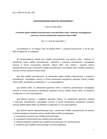 Dz.U. 2005 Nr 94, poz. 795 ROZPORZĄDZENIE MINISTRA ŚRODOWISKA 1) z dnia 16 maja 2005 r. w sprawie typów siedlisk przyrodniczych oraz gatunków roślin i zwierząt, wymagających ochrony w formie wyznaczenia obszarów Natura 2000 (Dz. U. z dnia 30 maja 2005 r.) Na podstawie art. 26 ustawy z dnia 16 kwietnia 2004 r. o ochronie przyrody (Dz. U. Nr 92, poz. 880) zarządza się, co następuje: § 1. Rozporządzenie określa typy siedlisk przyrodniczych oraz gatunki roślin i zwierząt, ze wskazaniem typów siedlisk przyrodniczych i gatunków o znaczeniu priorytetowym, wymagające ochrony w formie wyznaczenia obszarów Natura 2000, oraz kryteria i sposoby wyboru reprezentatywnej liczby i powierzchni siedlisk przyrodniczych oraz siedlisk roślin i siedlisk zwierząt do ochrony w formie obszarów Natura 2000. § 2. Typy siedlisk przyrodniczych, ze wskazaniem typów siedlisk przyrodniczych o znaczeniu priorytetowym, wymagające ochrony w formie wyznaczenia specjalnych obszarów ochrony siedlisk Natura 2000, są określone w załączniku nr 1 do rozporządzenia. § 3. Gatunki roślin, ze wskazaniem gatunków roślin o znaczeniu priorytetowym, wymagające ochrony w formie wyznaczenia specjalnych obszarów ochrony siedlisk Natura 2000, są określone w załączniku nr 2 do rozporządzenia. § 4. Gatunki zwierząt, z wyjątkiem gatunków ptaków, ze wskazaniem gatunków zwierząt o znaczeniu priorytetowym, wymagające ochrony w formie wyznaczenia specjalnych obszarów ochrony siedlisk Natura 2000, są określone w załączniku nr 3 do rozporządzenia. § 5. Kryteria wyboru reprezentatywnej liczby i powierzchni siedlisk przyrodniczych do ochrony w formie specjalnych obszarów ochrony siedlisk Natura 2000 są następujące: 1) priorytetowe znaczenie typu siedliska przyrodniczego; 2) wewnętrzne zróżnicowanie typu siedliska przyrodniczego; 3) wielkość krajowych zasobów typu siedliska przyrodniczego i ich rozmieszczenie; 4) podatność typu siedliska przyrodniczego na proces degradacji; 1 5) zachowanie pełnej zmienności danego typu siedliska przyrodniczego; 6) znaczenie poszczególnych obszarów Natura 2000 dla skutecznej ochrony typu siedliska przyrodniczego, uwzględniające w szczególności: a) stopień, w jakim siedlisko przyrodnicze jest reprezentatywne, b) powierzchnię zajmowaną przez siedlisko przyrodnicze w stosunku do całkowitej powierzchni tego typu siedliska przyrodniczego na obszarze kraju, c) stopień, w jakim struktura i funkcja siedliska przyrodniczego jest zachowana lub możliwości jego renaturyzacji, d) istniejące i potencjalne zagrożenia. § 6. Sposoby wyboru reprezentatywnej liczby i powierzchni siedlisk przyrodniczych są następujące: 1) wyznaczenie obszarów występowania typu siedliska przyrodniczego z załącznika nr 1 do rozporządzenia; 2) znaczenie poszczególnych obszarów Natura 2000 dla skutecznej ochrony typu siedliska przyrodniczego; 3) uwzględnienie współwystępowania gatunków roślin i zwierząt wymagających ochrony; 4) wyznaczenie powierzchni obszaru Natura 2000, która powinna: a) umożliwiać skuteczne i trwałe zachowanie siedlisk przyrodniczych, b) obejmować wszystkie występujące na obszarze Natura 2000 siedliska przyrodnicze. § 7. 1. Kryteria wyboru reprezentatywnej liczby i powierzchni siedlisk gatunków roślin i zwierząt, z wyjątkiem ptaków, do ochrony w formie specjalnych obszarów ochrony siedlisk Natura 2000 są następujące: 1) priorytetowe znaczenie gatunku; 2) wielkość krajowej populacji i jej rozmieszczenie; 3) stopień zagrożenia; 4) podatność siedlisk na proces degradacji; 5) występowanie siedlisk gatunków, które mają nie więcej niż 10 miejsc występowania w kraju; 6) występowanie co najmniej 2 % krajowej populacji gatunku; 7) występowanie zimowych i letnich schronień nietoperzy, których znaczenie w skali kraju oceniono na co najmniej 10 punktów, zgodnie z kryteriami podanymi w załączniku nr 4 do rozporządzenia. 2. Kryteria oceny znaczenia schronień nietoperzy są określone w załączniku nr 4 do rozporządzenia. 3. Kryteria wyboru reprezentatywnej liczby siedlisk gatunków ptaków, do ochrony w formie obszarów specjalnej ochrony ptaków Natura 2000, są następujące: 1) występowanie co najmniej 1 % lęgowej populacji krajowej gatunku zagrożonego w skali globalnej; 2) występowanie co najmniej 1 % populacji gatunku wędrownego lub co najmniej 1 % europejskiej populacji lęgowej gatunku zagrożonego; 3) występowanie co najmniej 1 % europejskiej populacji gatunku wędrownego niezagrożonego; 2 4) występowanie co najmniej 20.000 osobników ptaków wodno-błotnych podczas wędrówek lub zimowania lub co najmniej 10.000 par jednego lub wielu wędrownych gatunków ptaków morskich; 5) występowanie co najmniej 5.000 osobników bocianów białych lub 3.000 żurawi, lub 3.000 ptaków drapieżnych podczas wędrówek. § 8. Sposoby wyboru reprezentatywnej liczby siedlisk gatunków roślin i zwierząt, z wyjątkiem ptaków, do ochrony w formie specjalnych obszarów ochrony siedlisk Natura 2000 są następujące: 1) wyznaczenie obszarów występowania gatunków roślin i zwierząt wyszczególnionych w załącznikach nr 2 i 3 do rozporządzenia; 2) znaczenie poszczególnych obszarów Natura 2000 występowania gatunków roślin i zwierząt dla skutecznej ochrony tych gatunków; 3) znaczenie poszczególnych obszarów Natura 2000 dla przemieszczania się gatunków, z uwzględnieniem: a) położenia na trasie wędrówek innych gatunków wymienionych w załączniku nr 3 do rozporządzenia, b) funkcjonowania jako korytarzy ekologicznych łączących inne obszary istotne dla ochrony siedlisk gatunków priorytetowych, wymienionych w załączniku nr 3 do rozporządzenia, c) połączenia z innymi obszarami ważnymi dla ochrony siedlisk gatunków i siedlisk przyrodniczych, wymienionych w załącznikach nr 1-3 do rozporządzenia, w szczególności z innymi obszarami Natura 2000 i terenami objętymi pozostałymi formami o