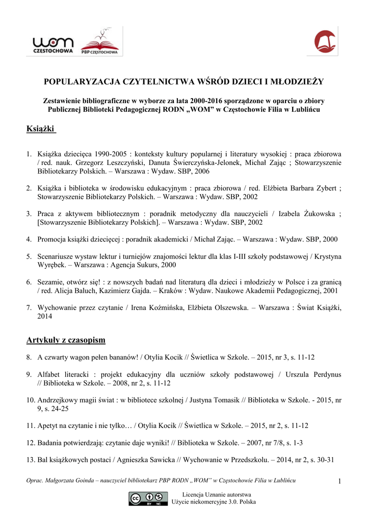 POPULARYZACJA CZYTELNICTWA WŚRÓD DZIECI I MŁODZIEŻY Zestawienie bibliograficzne w wyborze za lata 2000-2016 sporządzone w oparciu o zbiory Publicznej Biblioteki Pedagogicznej RODN „WOM” w Częstochowie Filia w Lublińcu Książki 1. Książka dziecięca 1990-2005 : konteksty kultury popularnej i literatury wysokiej : praca zbiorowa / red. nauk. Grzegorz Leszczyński, Danuta Świerczyńska-Jelonek, Michał Zając ; Stowarzyszenie Bibliotekarzy Polskich. – Warszawa : Wydaw. SBP, 2006 2. Książka i biblioteka w środowisku edukacyjnym : praca zbiorowa / red. Elżbieta Barbara Zybert ; Stowarzyszenie Bibliotekarzy Polskich. – Warszawa : Wydaw. SBP, 2002 3. Praca z aktywem bibliotecznym : poradnik metodyczny dla nauczycieli / Izabela Żukowska ; [Stowarzyszenie Bibliotekarzy Polskich]. – Warszawa : Wydaw. SBP, 2002 4. Promocja książki dziecięcej : poradnik akademicki / Michał Zając. – Warszawa : Wydaw. SBP, 2000 5. Scenariusze wystaw lektur i turniejów znajomości lektur dla klas I-III szkoły podstawowej / Krystyna Wyrębek. – Warszawa : Agencja Sukurs, 2000 6. Sezamie, otwórz się! : z nowszych badań nad literaturą dla dzieci i młodzieży w Polsce i za granicą / red. Alicja Baluch, Kazimierz Gajda. – Kraków : Wydaw. Naukowe Akademii Pedagogicznej, 2001 7. Wychowanie przez czytanie / Irena Koźmińska, Elżbieta Olszewska. – Warszawa : Świat Książki, 2014 Artykuły z czasopism 8. A czwarty wagon pełen bananów! / Otylia Kocik // Świetlica w Szkole. – 2015, nr 3, s. 11-12 9. Alfabet literacki : projekt edukacyjny dla uczniów szkoły podstawowej / Urszula Perdynus // Biblioteka w Szkole. – 2008, nr 2, s. 11-12 10. Andrzejkowy magii świat : w bibliotece szkolnej / Justyna Tomasik // Biblioteka w Szkole. - 2015, nr 9, s. 24-25 11. Apetyt na czytanie i nie tylko… / Otylia Kocik // Świetlica w Szkole. – 2015, nr 2, s. 11-12 12. Badania potwierdzają: czytanie daje wyniki! // Biblioteka w Szkole. – 2007, nr 7/8, s. 1-3 13. Bal książkowych postaci / Agnieszka Sawicka // Wychowanie w Przedszkolu. – 2014, nr 2, s. 30-31 Oprac. Małgorzata Goinda – nauczyciel bibliotekarz PBP RODN „WOM” w Częstochowie Filia w Lublińcu Licencja Uznanie autorstwa Użycie niekomercyjne 3.0. Polska 1 14. Bardziej zrozumieć siebie : o trudnym dojrzewaniu / Katarzyna John // Biblioteka w Szkole. – 2015, nr 10, s. 21 15. Bariery w dostępie do bibliotek szkolnych i ich diagnozowania / Joanna Naruszewicz // Poradnik Bibliotekarza. – 2015, nr 2, s. 5-9 16. Biblioteczne spotkanie z historią : o zaprowadzeniu w Polsce chrześcijaństwa / Agnieszka Olejarz // Biblioteka w Szkole. - 2016, nr 4, s. 12-16 17. Biblioteka - dobre miejsce / Iwona Pietrucha // Wychowanie w Przedszkolu. – 2013, nr 5, s. 68-69 18. Biblioteka - przestrzeń emocji (nie tylko literackich) dla najmłodszych / Urszula Kubajek ; Bibl. Wydz. Nauk Pedagogicznych Uniwersytetu Kardynała Stefana Wyszyńskiego w Warszawie // Nowa Szkoła. – 2013, nr 4, s. 20-27 19. Biblioteka cyfrowa czyli jaka? : scenariusz lekcji bibliotecznej dla klasy III gimnazjum / Paulina Bartosik // Poradniki Bibliotekarza. – 2013, nr 2, s. 45-46 20. Biblioteka sercem szkoły / Alina Grabna // Częstochowski Biuletyn Oświatowy. – 2015, nr 2, s. 89-90 21. Biesiady czytelnicze i Ferienada : pomysł na popularyzację książki / Jolanta Niwińska // Biblioteka w Szkole. – 2007, nr 10, s. 12 22. Bookcrossing - święto książek i dzieci / Krystyna Wojtera // Biblioteka w Szkole. – 2010, nr 4, s. 1415 23. Bookcrossing : i ty możesz uwalniać książki / Jolanta Niwińska // Biblioteka w Szkole. - 2014, nr 5, s. 19 24. Bookcrossing w bibliotece pedagogicznej / Bożena Zwierzyńska // Biblioteka w Szkole. – 2011, nr 4, s. 5-6 25. By czytać się chciało - zakładkę zrób wspaniałą! : o konkursie przeprowadzonym przez bibliotekę pedagogiczną wśród okolicznych szkół / Iwona Mickiewicz // Biblioteka w Szkole. – 2010, nr 10, s. 21 26. Całoroczny konkurs czytelniczy w klasie III / Sabina Kurzawa // Życie Szkoły. – 2008, nr 10, s. 36-42 27. Cały Rybnik czyta dzieciom / Katarzyna Gozdawa-Grajewska, Anna Węgrzyn // Biblioteka w Szkole. – 2015, nr 6, s. 28-29 28. Chłopackie i dziewczyńskie czytanie / Katarzyna John // Biblioteka w Szkole. – 2014, nr 9, s. 10-11 29. Co na niechęć do czytania lektur? / Iwona Jabłońska // Życie Szkoły. – 2010, nr 1, s. 31-33 30. Codzienne czytanie / Joanna Rynek // Wychowanie w Przedszkolu. – 2007, nr 10, s. 42-44 31. Czy pisarzom burczy w brzuchu? : gdy młody czytelnik spotyka żywego człowieka / Danuta Bula // Język Polski w Szkole. – 2014/2015, nr 4, s. 32-42 32. Czy trzecioklasiści mogą pisać książki? / Irena Nałęcka // Biblioteka w Szkole. – 2008, nr 2, s. 16-17 Oprac. Małgorzata Goinda – nauczyciel bibliotekarz PBP RODN „WOM” w Częstochowie Filia w Lublińcu Licencja Uznanie autorstwa Użycie niekomercyjne 3.0. Polska 2 33. Czy warto czytać dzieciom? / Danuta Doskocz // Wychowanie w Przedszkolu. – 2005, nr 2, s. 56-58 34. Czy wiesz, że książki rozmawiają? : scenariusz lekcji bibliotecznych : materiał przeznaczony dla uczniów gimnazjum lub liceum / Marzena Tyl // Biblioteka w Szkole. – 2014, nr 1, s. 12-13 35. Czytając poznaję świat / Anna Nowacka // Życie Szkoły. – 2015, nr 2, s. 2-6 36. Czytajmy dzieciom! : spotkania młodzieży z przedszkolakami "przy książce" / Jolanta Rolnik, Renata Saks // Biblioteka w Szkole. – 2006, nr 2, s. 15-17 37. „Czytajmy dzieciom..." : jak zachęcić rodziców do aktywnej współpracy / Wanda Niedorozow // Nauczanie Początkowe. – 2004/2005, nr 2, s. 69-78 38. Czytam, bawię, uczę... / Agnieszka Danielewicz // Wychowanie w Przedszkolu. – 2007, nr 10, s. 3236 39. Czytam, bo lubię - o rozwijaniu zainteresowań czytelniczych uczniów / Anna Magdalena Glinka // Życie Szkoły. – 2014, nr 6, s. 14-17 40. Czytam, więc jestem... / Grażyna Bilska // Poradnik Bibliotekarza.