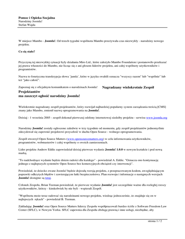 Pomoc i Opieka Socjalna Narodziny Joomla! Stefan Wajda W miejsce Mambo - Joomla!. Od trzech tygodni wspólnota Mambo przeżywała czas niezwykły - narodziny nowego projektu. Co się stało? Przyczyną tej niezwykłej sytuacji były działania Miro Ltd., które założyło Mambo Foundation i postanowiło przekazać jej prawa własności do Mambo, nie licząc się z ani głosem liderów projektu, ani całej wspólnoty użytkowników i programistów. Nazwa to fonetyczna transkrypcja słowa ’jumla’, które w języku swahili oznacza "wszyscy razem" lub "wspólnie" lub też "jako całość". Zapoznaj się z oficjalnym komunikatem o narodzinach Joomla! Projektantów ma zaszczyt ogłosić narodziny Joomla! Nagradzany wielokrotnie Zespół Wielokrotnie nagradzany zespół projektantów, który rozwijał najbardziej popularny system zarządzania treścią [CMS] znany jako Mambo, zmienił nazwę oprogramowania na Joomla!. Dzisiaj - 1 września 2005 - zespół dokonał pierwszej odsłony internetowej siedziby projektu - serwisu www.joomla.org Narodziny Joomla! zostały ogłoszone zaledwie w trzy tygodnie od momentu, gdy zespół projektantów jednomyślnie zdecydował się zapewnić projektowi przyszłość w duchu Open Source - wolnego oprogramowania. Zespół stworzył Open Source Matters (www.opensourcematters.org) w celu informowania użytkowników, programistów, webmasterów i całej wspólnoty o swoich zamierzeniach. Lider projektu Andrew Eddie zapowiedział dzisiaj pierwsze wydanie Joomla! 1.0.0 w nowym kształcie i pod nową marką. "To nadchodzące wydanie będzie dniem radości dla każdego" - powiedział A. Eddie. "Oznacza ono kontynuację jednego z najlepszych systemów Open Source bez komercyjnych obciążeń czy interwencji". Powiedział, że dziecko zwane Joomla! będzie dojrzałą wersją projektu, z przepracowanym kodem, uwzględniającym poprawki odkrytych błędów i zawierającym łatki bezpieczeństwa. Plan rozwoju i informacje o następnych wersjach Joomla! dostępne są tutaj. Członek Zespołu, Brian Teeman powiedział, że pierwsze wydanie Joomla! jest szczególnie ważne dla rozległej rzeszy użytkowników, którzy - kimkolwiek by nie byli - wspierali Zespół. "Wspólnota może teraz radować się narodzinami nowego projektu, wiedząc jednocześnie, że znajduje się on w najlepszych rękach" - powiedział B. Teeman. Zakładając Joomla! oraz Open Source Matters liderzy Zespołu współpracowali bardzo ściśle z Software Freedom Law Center (SFLC), w Nowym Yorku. SFLC zapewnia dla Zespołu obsługę prawną i inne usługi, niezbędne, aby strona 1 / 2 Pomoc i Opieka Socjalna Narodziny Joomla! Stefan Wajda zagwarantować projektowi swobodny rozwój i przyszłość jako wolne oprogramowanie typu Open Source. "Jesteśmy wdzięczni Ebenowi Moglenowi i jego zespołowi z Centrum (SFLC) za doskonałej jakości porady i wsparcie od strony prawnej - opracowane i zrealizowane (dla nas) w tak krótkim czasie" - podkreślił B. Teeman. "W trakcie rodzenia się Joomla! zespół projektu otrzymał tysiące emaili, postów, listów i telefonów wyrażających poparcie ludzi z całego świata" - powiedział A. Eddie "Ilość osób wyrażających poparcie dla nas i naszego projektu jest wręcz zdumiewająca - od hobbistów, programistów, developerów dodatkowych komponentów, projektantów witryn, właścicieli firm po nauczycieli, studentów, a nawet projektantów innych projektów CMS" - podkreślił pan Eddie. "Teraz słowo się stało i Joomla! narodził się. Teraz skupiamy się na kontynuowaniu naszego nagradzanego wielokrotnie wcześniej projektu i wznoszeniu go na jeszcze nowsze szczyty". Oprogramowanie do tworzenia witryn Joomla! jest rozpowszechniane na warunkach wolnego oprogramowania Powszechnej Licencji Publicznej GNU/GPL Tłum. Stefan Wajda i Maciej Borowik strona 2 / 2