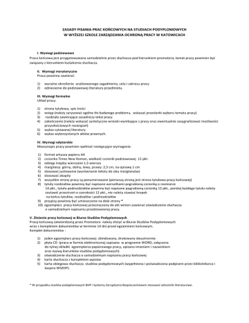 ZASADY PISANIA PRAC KOŃCOWYCH NA STUDIACH PODYPLOMOWYCH W WYŻSZEJ SZKOLE ZARZĄDZANIA OCHRONĄ PRACY W KATOWICACH I. Wymogi podstawowe Praca końcowa jest przygotowywana samodzielnie przez słuchacza pod kierunkiem promotora; temat pracy powinien być związany z kierunkiem kształcenia słuchacza. II. Wymogi merytoryczne Praca powinna zawierać: 1) 2) wyraźne określenie analizowanego zagadnienia, celu i zakresu pracy odniesienie do podstawowej literatury przedmiotu. III. Wymogi formalne Układ pracy: 1) 2) 3) 4) 5) 6) strona tytułowa, spis treści wstęp (należy zarysować ogólne tło badanego problemu, wskazać przesłanki wyboru tematu pracy) rozdziały zawierające zasadniczy tekst pracy zakończenie (należy wskazać syntetyczne wnioski wynikające z pracy oraz ewentualnie zasygnalizować możliwości przyszłościowych rozwiązań) wykaz cytowanej literatury wykaz wykorzystanych aktów prawnych. IV. Wymogi edytorskie Maszynopis pracy powinien spełniać następujące wymagania: 1) 2) 3) 4) 5) 6) 7) 8) format arkusza papieru A4 czcionka Times New Roman, wielkość czcionki podstawowej 12 pkt. odstęp między wierszami 1,5 wiersza marginesy: górny, dolny, lewy, prawy: 2,5 cm, na oprawę 1 cm stosować justowanie (wyrównanie tekstu do obu marginesów) stosować akapity wszystkie strony pracy są ponumerowane (pierwszą stroną jest strona tytułowa pracy końcowej) tytuły rozdziałów powinny być napisane wersalikami pogrubioną czcionką o rozmiarze 14 pkt., tytułu podrozdziałów powinny być napisane pogrubioną czcionką 12 pkt., poniżej każdego tytułu należy zostawić przestrzeń o szerokości 12 pkt., nie należy stawiać kropek na końcu tytułów, rozdziałów i podrozdziałów 9) przypisy powinny być umieszczone na dole strony * 10) egzemplarz pracy końcowej przeznaczony do akt winien zawierać oświadczenie słuchacza o samodzielnym napisaniu przedstawionej pracy. V. Złożenie pracy końcowej w Biurze Studiów Podyplomowych Pracę końcową zatwierdzoną przez Promotora należy złożyć w Biurze Studiów Podyplomowych wraz z kompletem dokumentów w terminie 14 dni przed egzaminem końcowym. Komplet dokumentów : 1) 2) 3) 4) 5) jeden egzemplarz pracy końcowej: zbindowany, drukowany dwustronnie płyta CD (praca w formie elektronicznej zapisana w programie WORD, załączona do tylnej okładki egzemplarza papierowego pracy, opisana imieniem i nazwiskiem oraz nazwą kierunków studiów podyplomowych) oświadczenie słuchacza o samodzielnym napisaniu pracy końcowej karta słuchacza z kompletem wpisów karta obiegowa słuchacza studiów podyplomowych (wypełniona i poświadczona podpisem przez bibliotekarza i kasjera WSZOP). * W przypadku studiów podyplomowych BHP i Systemy Zarządzania Bezpieczeństwem stosować odnośniki literaturowe.