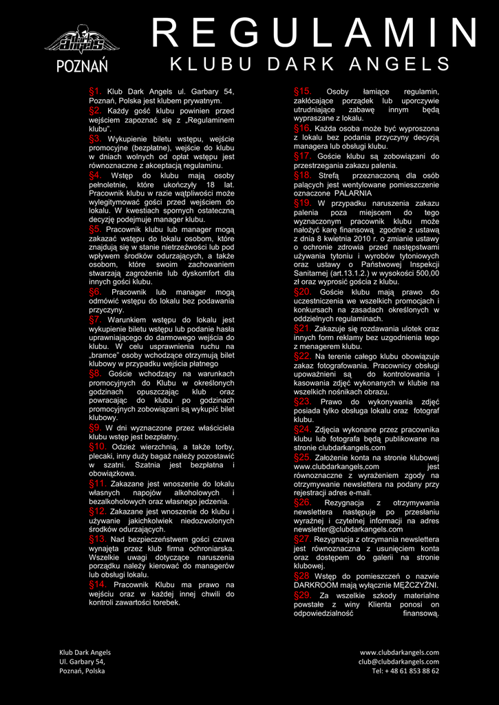 REGULAMIN KLUBU DARK ANGELS §1. Klub Dark Angels ul. Garbary 54, Poznań, Polska jest klubem prywatnym. §2. Każdy gość klubu powinien przed wejściem zapoznać się z „Regulaminem klubu”. §3. Wykupienie biletu wstępu, wejście promocyjne (bezpłatne), wejście do klubu w dniach wolnych od opłat wstępu jest równoznaczne z akceptacją regulaminu. §4. Wstęp do klubu mają osoby pełnoletnie, które ukończyły 18 lat. Pracownik klubu w razie wątpliwości może wylegitymować gości przed wejściem do lokalu. W kwestiach spornych ostateczną decyzję podejmuje manager klubu. §5. Pracownik klubu lub manager mogą zakazać wstępu do lokalu osobom, które znajdują się w stanie nietrzeźwości lub pod wpływem środków odurzających, a także osobom, które swoim zachowaniem stwarzają zagrożenie lub dyskomfort dla innych gości klubu. §6. Pracownik lub manager mogą odmówić wstępu do lokalu bez podawania przyczyny. §7. Warunkiem wstępu do lokalu jest wykupienie biletu wstępu lub podanie hasła uprawniającego do darmowego wejścia do klubu. W celu usprawnienia ruchu na „bramce” osoby wchodzące otrzymują bilet klubowy w przypadku wejścia płatnego §8. Goście wchodzący na warunkach promocyjnych do Klubu w określonych godzinach opuszczając klub oraz powracając do klubu po godzinach promocyjnych zobowiązani są wykupić bilet klubowy. §9. W dni wyznaczone przez właściciela klubu wstęp jest bezpłatny. §10. Odzież wierzchnią, a także torby, plecaki, inny duży bagaż należy pozostawić w szatni. Szatnia jest bezpłatna i obowiązkowa. §11. Zakazane jest wnoszenie do lokalu własnych napojów alkoholowych i bezalkoholowych oraz własnego jedzenia. §12. Zakazane jest wnoszenie do klubu i używanie jakichkolwiek niedozwolonych środków odurzających. §13. Nad bezpieczeństwem gości czuwa wynajęta przez klub firma ochroniarska. Wszelkie uwagi dotyczące naruszenia porządku należy kierować do managerów lub obsługi lokalu. §14. Pracownik Klubu ma prawo na wejściu oraz w każdej innej chwili do kontroli zawartości torebek. Klub Dark Angels Ul. Garbary 54, Poznań, Polska §15. Osoby łamiące regulamin, zakłócające porządek lub uporczywie utrudniające zabawę innym będą wypraszane z lokalu. §16. Każda osoba może być wyproszona z lokalu bez podania przyczyny decyzją managera lub obsługi klubu. §17. Goście klubu są zobowiązani do przestrzegania zakazu palenia. §18. Strefą przeznaczoną dla osób palących jest wentylowane pomieszczenie oznaczone PALARNIA §19. W przypadku naruszenia zakazu palenia poza miejscem do tego wyznaczonym pracownik klubu może nałożyć karę finansową zgodnie z ustawą z dnia 8 kwietnia 2010 r. o zmianie ustawy o ochronie zdrowia przed następstwami używania tytoniu i wyrobów tytoniowych oraz ustawy o Państwowej Inspekcji Sanitarnej (art.13.1.2.) w wysokości 500,00 zł oraz wyprosić gościa z klubu. §20. Goście klubu mają prawo do uczestniczenia we wszelkich promocjach i konkursach na zasadach określonych w oddzielnych regulaminach. §21. Zakazuje się rozdawania ulotek oraz innych form reklamy bez uzgodnienia tego z menagerem klubu. §22. Na terenie całego klubu obowiązuje zakaz fotografowania. Pracownicy obsługi upoważnieni są do kontrolowania i kasowania zdjęć wykonanych w klubie na wszelkich nośnikach obrazu. §23. Prawo do wykonywania zdjęć posiada tylko obsługa lokalu oraz fotograf klubu. §24. Zdjęcia wykonane przez pracownika klubu lub fotografa będą publikowane na stronie clubdarkangels.com §25. Założenie konta na stronie klubowej www.clubdarkangels,com jest równoznaczne z wyrażeniem zgody na otrzymywanie newslettera na podany przy rejestracji adres e-mail. §26. Rezygnacja z otrzymywania newslettera następuje po przesłaniu wyraźnej i czytelnej informacji na adres [email protected] §27. Rezygnacja z otrzymania newslettera jest równoznaczna z usunięciem konta oraz dostępem do galerii na stronie klubowej. §28 Wstęp do pomieszczeń o nazwie DARKROOM mają wyłącznie MĘŻCZYŹNI. §29. Za wszelkie szkody materialne powstałe z winy Klienta ponosi on odpowiedzialność finansową. www.clubdarkangels.com [email protected] Tel: + 48 61 853 88 62