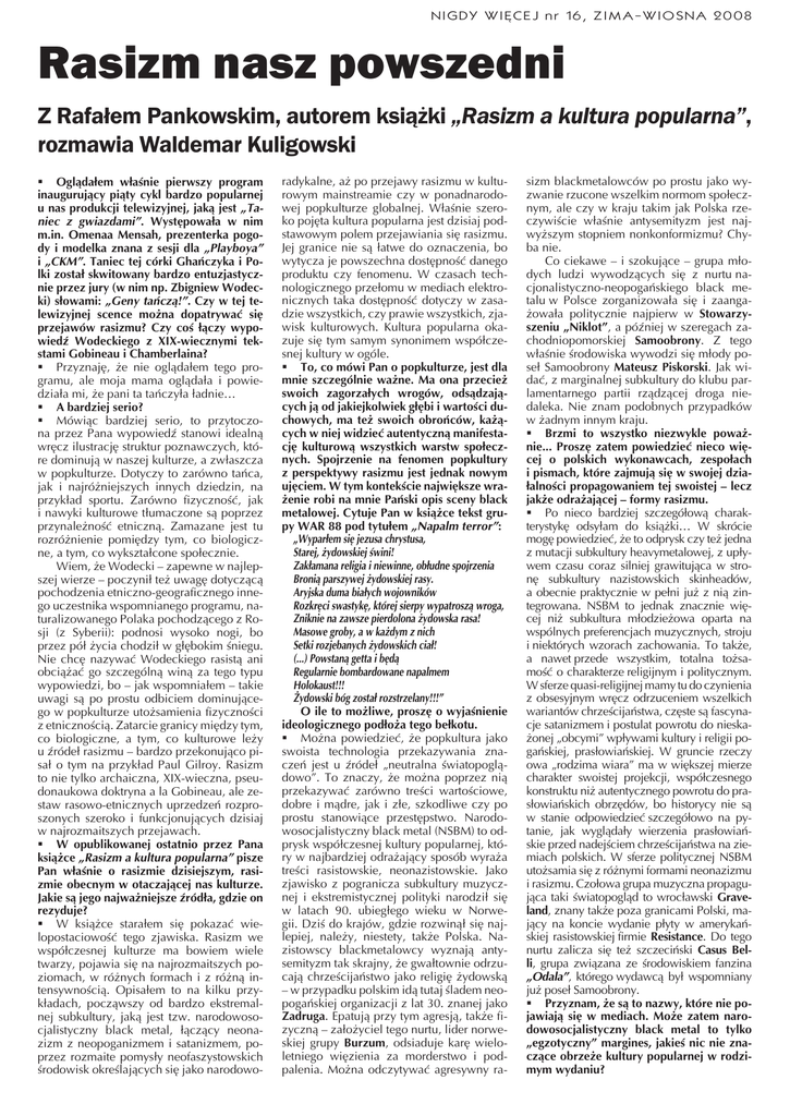 NIGDY WIĘCEJ nr 16, ZIMA-WIOSNA 2008 Rasizm nasz powszedni Z Rafałem Pankowskim, autorem książki „Rasizm a kultura popularna”, rozmawia Waldemar Kuligowski § Oglądałem właśnie pierwszy program inaugurujący piąty cykl bardzo popularnej u nas produkcji telewizyjnej, jaką jest „Taniec z gwiazdami”. Występowała w nim m.in. Omenaa Mensah, prezenterka pogody i modelka znana z sesji dla „Playboya” i „CKM”. Taniec tej córki Ghańczyka i Polki został skwitowany bardzo entuzjastycznie przez jury (w nim np. Zbigniew Wodecki) słowami: „Geny tańczą!”. Czy w tej telewizyjnej scence można dopatrywać się przejawów rasizmu? Czy coś łączy wypowiedź Wodeckiego z XIX-wiecznymi tekstami Gobineau i Chamberlaina? § Przyznaję, że nie oglądałem tego programu, ale moja mama oglądała i powiedziała mi, że pani ta tańczyła ładnie… § A bardziej serio? § Mówiąc bardziej serio, to przytoczona przez Pana wypowiedź stanowi idealną wręcz ilustrację struktur poznawczych, które dominują w naszej kulturze, a zwłaszcza w popkulturze. Dotyczy to zarówno tańca, jak i najróżniejszych innych dziedzin, na przykład sportu. Zarówno fizyczność, jak i nawyki kulturowe tłumaczone są poprzez przynależność etniczną. Zamazane jest tu rozróżnienie pomiędzy tym, co biologiczne, a tym, co wykształcone społecznie. Wiem, że Wodecki – zapewne w najlepszej wierze – poczynił też uwagę dotyczącą pochodzenia etniczno-geograficznego innego uczestnika wspomnianego programu, naturalizowanego Polaka pochodzącego z Rosji (z Syberii): podnosi wysoko nogi, bo przez pół życia chodził w głębokim śniegu. Nie chcę nazywać Wodeckiego rasistą ani obciążać go szczególną winą za tego typu wypowiedzi, bo – jak wspomniałem – takie uwagi są po prostu odbiciem dominującego w popkulturze utożsamienia fizyczności z etnicznością. Zatarcie granicy między tym, co biologiczne, a tym, co kulturowe leży u źródeł rasizmu – bardzo przekonująco pisał o tym na przykład Paul Gilroy. Rasizm to nie tylko archaiczna, XIX-wieczna, pseudonaukowa doktryna a la Gobineau, ale zestaw rasowo-etnicznych uprzedzeń rozproszonych szeroko i funkcjonujących dzisiaj w najrozmaitszych przejawach. § W opublikowanej ostatnio przez Pana książce „Rasizm a kultura popularna” pisze Pan właśnie o rasizmie dzisiejszym, rasizmie obecnym w otaczającej nas kulturze. Jakie są jego najważniejsze źródła, gdzie on rezyduje? § W książce starałem się pokazać wielopostaciowość tego zjawiska. Rasizm we współczesnej kulturze ma bowiem wiele twarzy, pojawia się na najrozmaitszych poziomach, w różnych formach i z różną intensywnością. Opisałem to na kilku przykładach, począwszy od bardzo ekstremalnej subkultury, jaką jest tzw. narodowosocjalistyczny black metal, łączący neonazizm z neopoganizmem i satanizmem, poprzez rozmaite pomysły neofaszystowskich środowisk określających się jako narodowo- radykalne, aż po przejawy rasizmu w kulturowym mainstreamie czy w ponadnarodowej popkulturze globalnej. Właśnie szeroko pojęta kultura popularna jest dzisiaj podstawowym polem przejawiania się rasizmu. Jej granice nie są łatwe do oznaczenia, bo wytycza je powszechna dostępność danego produktu czy fenomenu. W czasach technologicznego przełomu w mediach elektronicznych taka dostępność dotyczy w zasadzie wszystkich, czy prawie wszystkich, zjawisk kulturowych. Kultura popularna okazuje się tym samym synonimem współczesnej kultury w ogóle. § To, co mówi Pan o popkulturze, jest dla mnie szczególnie ważne. Ma ona przecież swoich zagorzałych wrogów, odsądzających ją od jakiejkolwiek głębi i wartości duchowych, ma też swoich obrońców, każących w niej widzieć autentyczną manifestację kulturową wszystkich warstw społecznych. Spojrzenie na fenomen popkultury z perspektywy rasizmu jest jednak nowym ujęciem. W tym kontekście największe wrażenie robi na mnie Pański opis sceny black metalowej. Cytuje Pan w książce tekst grupy WAR 88 pod tytułem „Napalm terror”: „Wyparłem się jezusa chrystusa, Starej, żydowskiej świni! Zakłamana religia i niewinne, obłudne spojrzenia Bronią parszywej żydowskiej rasy. Aryjska duma białych wojowników Rozkręci swastykę, której sierpy wypatroszą wroga, Zniknie na zawsze pierdolona żydowska rasa! Masowe groby, a w każdym z nich Setki rozjebanych żydowskich ciał! (...) Powstaną getta i będą Regularnie bombardowane napalmem Holokaust!!! Żydowski bóg został rozstrzelany!!!” O ile to możliwe, proszę o wyjaśnienie ideologicznego podłoża tego bełkotu. § Można powiedzieć, że popkultura jako swoista technologia przekazywania znaczeń jest u źródeł „neutralna światopoglądowo”. To znaczy, że można poprzez nią przekazywać zarówno treści wartościowe, dobre i mądre, jak i złe, szkodliwe czy po prostu stanowiące przestępstwo. Narodowosocjalistyczny black metal (NSBM) to odprysk współczesnej kultury popularnej, który w najbardziej odrażający sposób wyraża treści rasistowskie, neonazistowskie. Jako zjawisko z pogranicza subkultury muzycznej i ekstremistycznej polityki narodził się w latach 90. ubiegłego wieku w Norwegii. Dziś do krajów, gdzie rozwinął się najlepiej, należy, niestety, także Polska. Nazistowscy blackmetalowcy wyznają antysemityzm tak skrajny, że gwałtownie odrzucają chrześcijaństwo jako religię żydowską – w przypadku polskim idą tutaj śladem neopogańskiej organizacji z lat 30. znanej jako Zadruga. Epatują przy tym agresją, także fizyczną – założyciel tego nurtu, lider norweskiej grupy Burzum, odsiaduje karę wieloletniego więzienia za morderstwo i podpalenia. Można odczytywać agresywny ra- sizm blackmetalowców po prostu jako wyzwanie rzucone wszelkim normom społecznym, ale czy w kraju takim jak Polska rzeczywiście właśnie antysemityzm jest najwyższym stopniem nonkonformizmu? Chyb