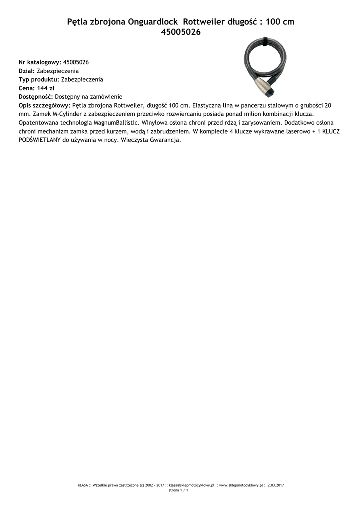 Pętla zbrojona Onguardlock Rottweiler długość : 100 cm 45005026 Nr katalogowy: 45005026 Dział: Zabezpieczenia Typ produktu: Zabezpieczenia Cena: 144 zł Dostępność: Dostępny na zamówienie Opis szczegółowy: Pętla zbrojona Rottweiler, długość 100 cm. Elastyczna lina w pancerzu stalowym o grubości 20 mm. Zamek M-Cylinder z zabezpieczeniem przeciwko rozwiercaniu posiada ponad milion kombinacji klucza. Opatentowana technologia MagnumBallistic. Winylowa osłona chroni przed rdzą i zarysowaniem. Dodatkowo osłona chroni mechanizm zamka przed kurzem, wodą i zabrudzeniem. W komplecie 4 klucze wykrawane laserowo + 1 KLUCZ PODŚWIETLANY do używania w nocy. Wieczysta Gwarancja. KLASA :: Wszelkie prawa zastrzeżone (c) 2002 - 2017 :: [email protected] :: www.sklepmotocyklowy.pl :: 2.03.2017 strona 1 / 1