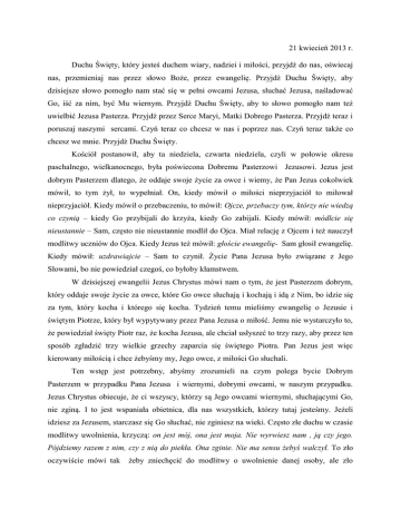 21 kwiecień 2013 r. Duchu Święty, który jesteś duchem wiary, nadziei i miłości, przyjdź do nas, oświecaj nas, przemieniaj nas przez słowo Boże, przez ewangelię. Przyjdź Duchu Święty, aby dzisiejsze słowo pomogło nam stać się w pełni owcami Jezusa, słuchać Jezusa, naśladować Go, iść za nim, być Mu wiernym. Przyjdź Duchu Święty, aby to słowo pomogło nam też uwielbić Jezusa Pasterza. Przyjdź przez Serce Maryi, Matki Dobrego Pasterza. Przyjdź teraz i poruszaj naszymi sercami. Czyń teraz co chcesz w nas i poprzez nas. Czyń teraz także co chcesz we mnie. Przyjdź Duchu Święty. Kościół postanowił, aby ta niedziela, czwarta niedziela, czyli w połowie okresu paschalnego, wielkanocnego, była poświecona Dobremu Pasterzowi Jezusowi. Jezus jest dobrym Pasterzem dlatego, że oddaje swoje życie za owce i wiemy, że Pan Jezus cokolwiek mówił, to tym żył, to wypełniał. On, kiedy mówił o miłości nieprzyjaciół to miłował nieprzyjaciół. Kiedy mówił o przebaczeniu, to mówił: Ojcze, przebaczy tym, którzy nie wiedzą co czynią – kiedy Go przybijali do krzyża, kiedy Go zabijali. Kiedy mówił: módlcie się nieustannie – Sam, często nie nieustannie modlił do Ojca. Miał relację z Ojcem i też nauczył modlitwy uczniów do Ojca. Kiedy Jezus też mówił: głoście ewangelię- Sam głosił ewangelię. Kiedy mówił: uzdrawiajcie – Sam to czynił. Życie Pana Jezusa było związane z Jego Słowami, bo nie powiedział czegoś, co byłoby kłamstwem. W dzisiejszej ewangelii Jezus Chrystus mówi nam o tym, że jest Pasterzem dobrym, który oddaje swoje życie za owce, które Go owce słuchają i kochają i idą z Nim, bo idzie się za tym, który kocha i którego się kocha. Tydzień temu mieliśmy ewangelię o Jezusie i świętym Piotrze, który był wypytywany przez Pana Jezusa o miłość. Jemu nie wystarczyło to, że powiedział święty Piotr raz, że kocha Jezusa, ale chciał usłyszeć to trzy razy, aby przez ten sposób zgładzić trzy wielkie grzechy zaparcia się świętego Piotra. Pan Jezus jest więc kierowany miłością i chce żebyśmy my, Jego owce, z miłości Go słuchali. Ten wstęp jest potrzebny, abyśmy zrozumieli na czym polega bycie Dobrym Pasterzem w przypadku Pana Jezusa i wiernymi, dobrymi owcami, w naszym przypadku. Jezus Chrystus obiecuje, że ci wszyscy, którzy są Jego owcami wiernymi, słuchającymi Go, nie zginą. I to jest wspaniała obietnica, dla nas wszystkich, którzy tutaj jesteśmy. Jeżeli idziesz za Jezusem, starczasz się Go słuchać, nie zginiesz na wieki. Często złe duchu w czasie modlitwy uwolnienia, krzyczą: on jest mój, ona jest moja. Nie wyrwiesz nam , ją czy jego. Pójdziemy razem z nim, czy z nią do piekła. Ona zginie. Nie ma sensu żebyś walczył. To zło oczywiście mówi tak żeby zniechęcić do modlitwy o uwolnienie danej osoby, ale zło przegrało, ono wie, że kiedy jest walka o daną duszę człowieka, również podczas modlitwy uwolnienia, to zło już przegrało i nie ma szansy na to żeby tą duszę wyrwać z rąk z Jezusa. Jest to walka na śmierć i życie. Naprawdę walczmy ze złem, po naszej stronie jest Dobry Pasterz, Baranek. I rzeczywiście, zło zrobi wszystko żeby nas pokonać, ale Jezus Dobry Pasterz, mimo, że pozwoli na walkę z wilkami, ze złymi duchami, ale także z ludźmi, którzy są oddani złu, ale nie pozwoli żebyś zginął. Jest taka historia w Meksyku, męczeństwa kościoła przed wojną II światową. W Meksyku były wielkie prześladowania kościoła, rządzili w tamtych czasach masoni, którzy chcieli kościół całkowicie zniszczyć. Dochodziło do wielu zabójstw kapłanów. Między innymi był taki kapłan, który została kilkanaście lat temu, który został przez Ojca Świętego beatyfikowany. Był Dobrym Pasterzem, był w tamtych czasach, taki, kiedy była ta wojna domowa, kiedy masoneria chciała zniszczyć kościół i dokonywała masowych eksterminacji, takich, jak właśnie potem czynili to Niemcy czy faszyści i to był kapłan, który służył właśnie swojemu ludowi. Był to starszy kapłan. Całe życie głosił Chrystusa, chrzcił, spowiadał. Kochali go ludzie. I zbliżało się takie wojsko do tego miasta, w którym przebywał, bo chcieli ukarać tego kapłana, bo wiedzieli, że on mimo, że miał zakaz spowiadania, wykonywania funkcji kapłańskich, mimo, że był zakaz chodzenia w sutannie, to on to wszystko robił. Nie słuchał ich i przyszło wojsko, ale jeszcze był taki młody chłopak, który był, który widział, że to wojsko się zbliża i chciał ostrzec tego kapłana. Mówił: proszę księdza, niech ksiądz ratuje się. My ukryjemy księdza, w moim domu. A ten mówi: nie, synu, ja mam już tyle lat, jestem starym kapłanem. Ja swoje życie chce ofiarować za owce, również za te, które, za te wilki, które mnie zabiją. Chce być dobrym pasterzem do końca. Niewiele mi życia zostało, nie chce je oszczędzać. Nie chce stchórzyć. Żyłem całe życie dla Jezusa i warto żebym umarł za Jezusa, którego głosiłem, za owce, którym służyłem. Jezus umarł za mnie. Ja chce umrzeć dla Niego. Nie będę się bronił. Niech przyjdą. Jestem gotów. Chce być dobrym pasterzem do końca. I ten chłopak zaczął dalej jeszcze tego kapłana przekonywać, żeby jednak się schował, a ten mówi: nie, albo biorę ornat i będę czekał tutaj na nich. Ty idź, ukryj się mój synu. Módl się za mnie w domu, kiedy wrócisz, abym umarł tak jak Jezus tego chce. I rzeczywiście po jakimś czasie, przyszło wojsko. Był wtedy w kościele i modlił się przed Najświętszym Sakramentem. Weszli do kościoła, wojsko weszli do kościoła, zdemolowali cały kościół, sprofanowali. Najświętszy Sakrament był schowany, więc nie mogli tego dokonać tak jak by chcieli, do schował Go kapłan głęboko w innym miejscu, znanym tylko osobie zaufanej. Tego kapłana potem wyprowadzili przed kościół. On miał rę