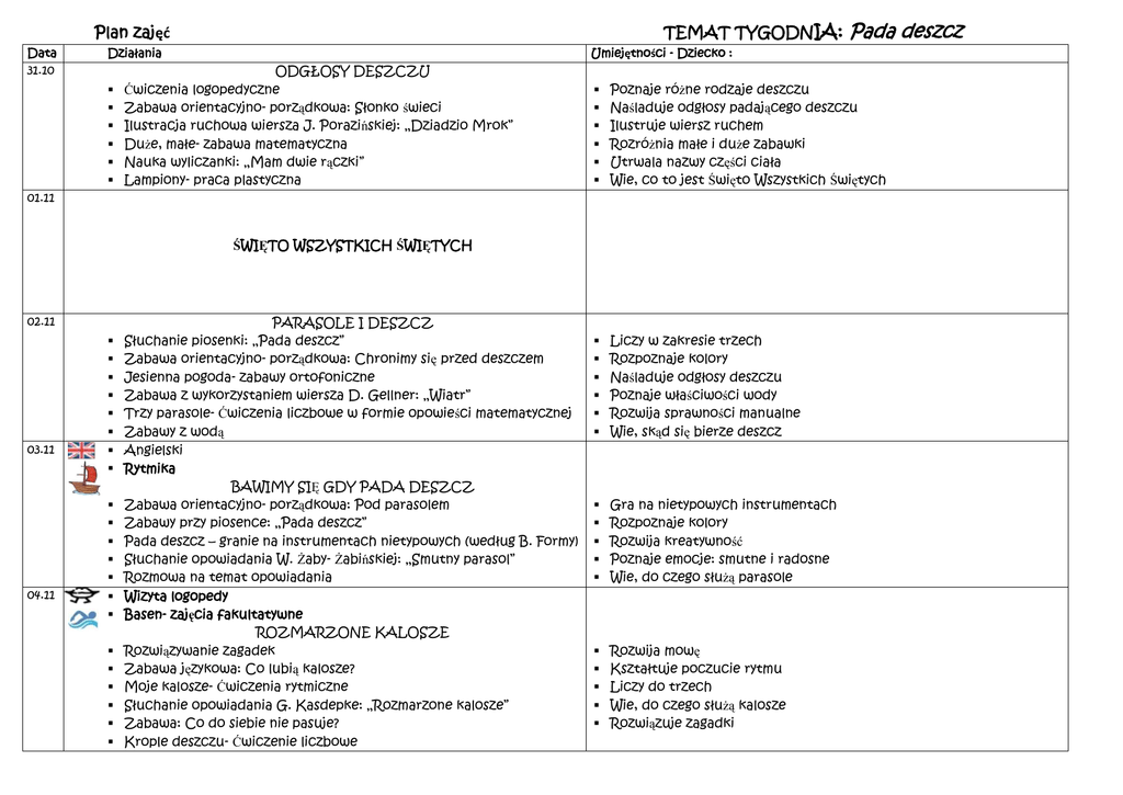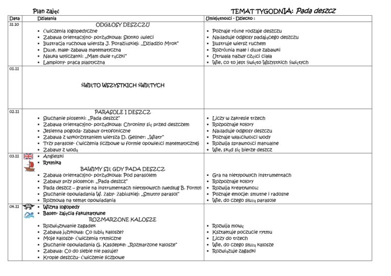 TEMAT TYGODNIA: Plan zajęć Data 31.10 Działania ODGŁOSY DESZCZU Ćwiczenia logopedyczne Zabawa orientacyjno- porządkowa: Słonko świeci Ilustracja ruchowa wiersza J. Porazińskiej: „Dziadzio Mrok” Duże, małe- zabawa matematyczna Nauka wyliczanki: „Mam dwie rączki” Lampiony- praca plastyczna Poznaje różne rodzaje deszczu Naśladuje odgłosy padającego deszczu Ilustruje wiersz ruchem Rozróżnia małe i duże zabawki Utrwala nazwy części ciała Wie, co to jest Święto Wszystkich Świętych Liczy w zakresie trzech Rozpoznaje kolory Naśladuje odgłosy deszczu Poznaje właściwości wody Rozwija sprawności manualne Wie, skąd się bierze deszcz Gra na nietypowych instrumentach Rozpoznaje kolory Rozwija kreatywność Poznaje emocje: smutne i radosne Wie, do czego służą parasole Rozwija mowę Kształtuje poczucie rytmu Liczy do trzech Wie, do czego służą kalosze Rozwiązuje zagadki 01.11 ŚWIĘTO WSZYSTKICH ŚWIĘTYCH 02.11 03.11 04.11 Pada deszcz Umiejętności - Dziecko : PARASOLE I DESZCZ Słuchanie piosenki: „Pada deszcz” Zabawa orientacyjno- porządkowa: Chronimy się przed deszczem Jesienna pogoda- zabawy ortofoniczne Zabawa z wykorzystaniem wiersza D. Gellner: „Wiatr” Trzy parasole- Ćwiczenia liczbowe w formie opowieści matematycznej Zabawy z wodą Angielski Rytmika BAWIMY SIĘ GDY PADA DESZCZ Zabawa orientacyjno- porządkowa: Pod parasolem Zabawy przy piosence: „Pada deszcz” Pada deszcz – granie na instrumentach nietypowych (według B. Formy) Słuchanie opowiadania W. Żaby- Żabińskiej: „Smutny parasol” Rozmowa na temat opowiadania Wizyta logopedy Basen- zajęcia fakultatywne ROZMARZONE KALOSZE Rozwiązywanie zagadek Zabawa językowa: Co lubią kalosze? Moje kalosze- Ćwiczenia rytmiczne Słuchanie opowiadania G. Kasdepke: „Rozmarzone kalosze” Zabawa: Co do siebie nie pasuje? Krople deszczu- Ćwiczenie liczbowe