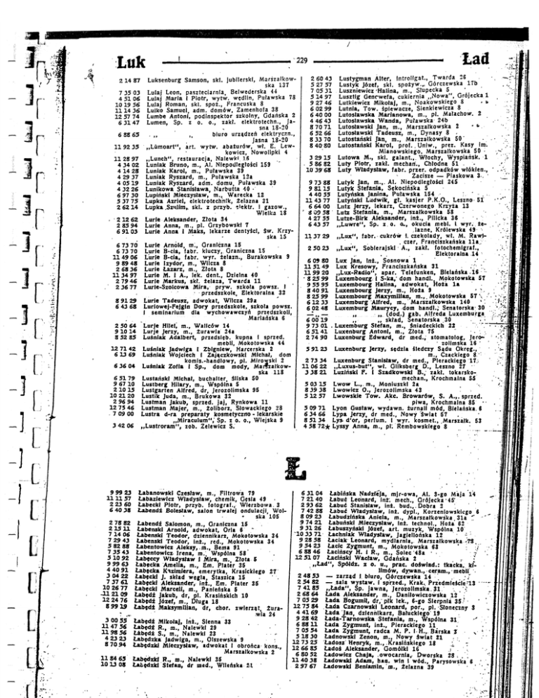 Łuk 2 14 87 229 Luksenburg Samson, skl. jubilerski, Marszałkow ska 137 7 35 03 Lulaj Leon, paszteciarnla, Belwederska 44 4 51 06 Lulaj Maria 1 Piotr, wytw. wędlin, Puławska 78 1019 56 Lulaj Roman, skl. spoż., Francuska 8 1114 36 Lulko Samuel, adm. domów, Zamenhofa 38 12 57 74 Lumbe Antoni, podinspektor szkolny, Gdańska 2 6 3147 Lumen, Sp. z o. o., zakł. elektrotechn., Ja sna 18-20 6 88 65 . ,, , biuro urządzeń elektryczn., Jasna 18-20 1192 35 „Lümoart", art. wytw. abażurów, wł. E. Lew kowicz, Nowolipki 4 1128 97 „Lunch", restauracja, Nalewki. 16 4 34 02 Luniak Bruno, m., Al. Niepodległości 159 414 28 Luniak Karpi, m., Puławska 39 4 29 37 Luniak Ryszard, m., Puławska 12a 4 0519 Luniak Ryszard, adm. domu, Puławska 39 4 32 26 Lunikowa Stanisława, Narbutta 40 6 97 30 Lupiński Mieczysław, m., Warecka 12 5 37 75 Lupka Azrieł, elektrotechnik, Żelazna 31 2 6214 Lupka .Szulim,. skl. z przyb. e»ektr. 1 gazów., Wielka 18 . 2 12 62 Lurie Aleksander, Złota 34 2 85 94 Lurie Anna, rn., pl. Grzybowski 7 6 9103 Lurie Anna i Maks, lekarze dentyści, Sw. Krzy ska 15 6 73 70 Lurie Arnold, m., Graniczna 15 6 73 70 Lurie B-cia, fabr. kluczy, Graniczna 15 1149 06 Lurie B-cła, fabr. wyr. żelazn., Burakowska 9 9 89 48 Lurie Izydor, m., Wilcza 8 2 68 36 Lurie Łazarz, m., Złota 8 11 34 97 Lurie M . i A., lek. dent., Dzielna 40 2 79 46 Lurie Markus, skł. żelaza, Twarda 11 2 36 77 Lurie-Szolcowa Mira, pryw. szkoła powsz. I • przedszkole. Elektoralna 32 8 9129 Lurie Tadeusz, adwokat, Wilcza 29a 6 43 68 Lurłowej-Fejgin Dory przedszkole, szkoła powsz. i seminarium dla wychowawczyń przedszkoli, Mariańska 6 2 50 64 Lurje Hilel, m., Waliców 14 9 10 14 Lurje Jerzy, m., Żurawia 24a 8 52 85 Luśniak Adalbert, przedsieb. kupna I sprzed. mebli, Mokotowska 44 12 7142 Luśniak Jadwiga i Zbigniew, Harcerska 2 613 69 Luśniak Wojciech i Zajączkowski Michał, dom komis.-handłowy, pl. Mirowski 2 6 36 04 Luśniak Zofia 1 Sp., dom mody, Marszałkow ska 118 6 5179 Lustański Michał, buchalter, śliska 50 9 67 10 Lustberg Hilary, m., Wspólna 5 2 10 15 Lustgarten Alfred, dr, Jerozolimska 95 10 2120 Lustik Juda, m., Brukowa 32 2 96 94 Lustman Jakub, sprzed, jaj, Rynkowa 11 12 75 46 Lustman Majer, m., żoliborz, Słowackiego 28 7 09 00 Lustra d-ra preparaty kosmetyczno - lekarskie „Miraculum"," Sp. z o. o., Wiejska 9 3 42 06 „Lustroram", zob. Zelewicz S. 9 99 11 U 2 23 6 40 23 Łabanowski Czesław, m., Filtrowa 79 57 Łabaziewicz Władysław, chemik, Gęsia 49 60 Łabęcki Piotr, przyb. fotograf., Wierzbowa. 3 38 Łabendź Bolesław, salon trwałej ondulacji, Wol ska 105 2 78 82 Łabendź Salomon, m., Graniczna 15 21511 Łabensk! Arnold, adwokat, Orla 6 7 14 06 Łabensk! Teodor, dziennikarz, Mokotowska 34 7 29 43 Łabensk! Teodor, inż., red., Mokotowska 34 5 82 88 Łabentowicz Aleksy,.nu, Bema 91 . 7 35 43 Łabentowicz Irena, m. Wspólna 58 5 10 92 Łabęccy Władysław 1 Mira, m. Złota 5 9 99 63 Łabęcka Amelia, m., Em. Plater 35 4 40 91 Łabęcka Kazimiera, emerytka, Krasickiego 27 3 04 22 Łabęcki J. skład węgla, Staszica 15 7 37 61 Łabęcki Aleksander, inż., Em. Plater 35 10 26 77 Łabęcki Marceli, m., Panieńska 5 -11 2109 Łabędź Jakub, dr, pl. Krasińskich 10 12 24 76 Łabędź Józef, m., Długa 18 8 9919 Łabędź Maksymilian, dr, chor. zwierząt, Żura wia 24 3 00 55* Łabędź Mikołaj, Inż., Sienna 33 11 47 56 Łabędź R., m., Nalewki 29 1198 56 Łabędź S., m., Nalewki 23 • 423 23 Łabędzka Jadwiga, m., Olszewska 9 8 70 94 Łabędzic! Mieczysław, adwokat I obrońca kons., Marszałkowska 2 1184 65 ŁabędzW R., m., Nalewki 35 1013 08 Lafcędzki Stefan, dr med.. Wileńska 21 Ład Lustygman Alter, introllgat., Twarda 28 Lustyk Józef, skl. spożyw.,< Górczewska 17b Luszniewicz'Halina, m., Słupecka 5 Lusztig Genowefa, cukiernia „Nowa", Grójecka 1 Lutkiewicz Mikołaj, m., Noakowskiego 8 . * Lutnia, Tow. śpiewacze, Sienkiewicza 8 Lutosławska Marianowa, m., pl. Małachow. 2 Lutosławska Wanda, Puławska 24b Lutosławski Jan, m., Marszałkowska 2 • * Lutosławski Tadeusz, rn., Dynasy 8 ^ Lutostański Jan, m., Marszałkowska 50" Lutostański Karol, prof.. Uniw., prez. Kasy im. Mianowskiego, Marszałkowska 50 • Lutowa M . , skl. galant.,. Włochy, Wyspiańsk. 1 Luty Piotr, zakł. mechan., Chłodna 51 . Luty Władysław, fabr. przer. odpadków włókien., Zacisze — Piaskowa 3-, Lutyk Jan, m.,. AL Niepodległości 245 Lutyk Stefania, Sękocińśka 5 Lutyńska Janina, Puławska 154 Lutyński Ludwik, gł. kasjer P.K.O., Leszno 51 Lntz Jerzy, lekarz, Czerwonego Krzyża 13 Lutz Stefania, m., Marszałkowska 58 Lutze-Birk Aleksander, inż., Pilicka 36 „ L u w r e " , Sp. z. o. o., okucia mebl. I. wyr., że lazne, Królewska 49 „ L u x " , fabr. cukrów I . czekolady, wł. M. Rawl. czer, Franciszkańska l l a . ; „ L u x " , Sobłerajski A., zakł. fotochernigraf.. Elektoralna 14 Lux Jan, Inż., Sosnowa 1 Lux Kresowy, Franciszkańska 31 „Lux-Radio", apar. Telefunken, Bielańska. 16 Luxembourg i S-ka,' dom handl. Mokotowska 57 Luxembourg Halina, adwokat, Hoża l a Luxembourg Jerzy, m., Hoża 9 Luxembourg Maxymillan, m.,. Mokotowska 57'. Luxemburg Alfred, m.. Marszałkowska 140 Luxemburg Maurycy, dom handl.; Senatorska- 30 „ (dod.) gab. Alfreda Luxemburga ,, „ skład, Senatorska .30 . Luxemburg Stefan, m., Śniadeckich 22 Luxenburg Antoni, m., Złota 75 Luxenburg Edward, dr med., stomatolog. Jero zolimska 16 ' Luxenburg Jerzy, sędzia śledczy Sądu Okręg., m., Czackiego 8.'' Luxenburg Stanisław, dr med., Pierackiego 17.. „Luxus-but", wł. Giiksberg D., Leszno 27 Luziński F. 1 Szadkowski B., zakł. tokarskomechan., Krochmalna 55 Lwów L.,. m., Moniuszki 2a Lwowicz O., Jerozolimska 43 Lwowskie Tow. Akc. Browarów, S. A*,, sprzed. piwa, Krochmalna 85 •• Lyon Gustaw, wydawn. żurnall mód, Bielańska. 6 Lypa Jerzy, dr med., Nowy świat 57 Lys- d'or, perfum, i wyr. kosmet., .Marszałk. 53 1 6 31 04 Łabińska Nadzieja, mjr-owa, A l . 3-go Maja 14 