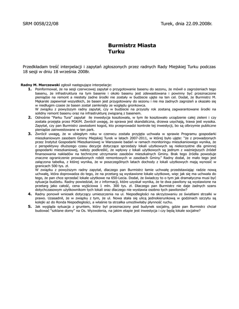 SRM 0058/22/08 Turek, dnia 22.09.2008r. Burmistrz Miasta Turku Przedkładam treść interpelacji i zapytań zgłoszonych przez radnych Rady Miejskiej Turku podczas 18 sesji w dniu 18 września 2008r. Radny M. Marczewski zgłosił następujące interpelacje: 1. Poinformował, że na sesji czerwcowej zapytał o przygotowanie basenu do sezonu, że mówił o zagrożeniach tego basenu, że infrastruktura na tym basenie i około basenu jest zdewastowana i powinny być przeznaczone pieniądze na remont a niestety żadne środki nie zostały w budżecie ujęte na ten cel. Dodał, że Burmistrz M. Mękarski zapewniał wszystkich, że basen jest przygotowany do sezonu i nie ma żadnych zagrożeń a okazało się w niedługim czasie że basen został zamknięty ze względu gronkowca. W związku z powyższym radny zapytał, czy w budżecie na przyszły rok zostaną zagwarantowane środki na solidny remont basenu oraz na infrastrukturę związaną z basenem. 2. Odnośnie “Parku Tura” zapytał ile inwestycja kosztowała, w tym ile kosztowało urządzenie całej zieleni i czy została przejęta przez PGKiM. Zwrócił uwagę, że sprawa jest skandaliczna, drzewa usychają, trawa jest wysoka. Zapytał, czy pan Burmistrz zawiodomi kogoś, kto przeprowadzi kontrole tej inwestycji, bo są olbrzymie publiczne pieniądze zainwestowane w ten park. 3. Zwrócił uwagę, że w ubiegłym roku w czerwcu została przyjęta uchwała w sprawie Programu gospodarki mieszkaniowym zasobem Gminy Miejskiej Turek w latach 2007-2011, w której było ujęte: “że z prowadzonych przez Instytut Gospodarki Mieszkaniowej w Warszawie badań w ramach monitoringu mieszkaniowego wynika, że z perspektywy dłuższego czasu decyzje dotyczące sprzedaży lokali użytkowych są niekorzystne dla gminnej gospodarki mieszkaniowej, należy podkreślić, że wpływy z lokali użytkowych są jednym z ważniejszych źródeł finansowania nakładów na techniczne utrzymanie zasobów mieszkalnych Gminy. Brak tego źródła powoduje znaczne ograniczenie prowadzonych robót remontowych w zasobach Gminy.” Radny dodał, że mało tego jest załączona tabelka, z której wynika, że w poszczególnych latach dochody z lokali użytkowych mają wynosić w granicach 500 tys. zł. W związku z powyższym radny zapytał, dlaczego pan Burmistrz łamie uchwałę przedstawiając radzie nową uchwałę, która doprowadza do tego, że na przetarg są wystawione lokale użytkowe, więc jak się ma uchwała do tego, że pan chce sprzedać lokale użytkowe na 650-Lecia. Dodał, że świadczy to o tym jak dramatyczna musi być sytuacja budżetu. Radny powiedział, że z informacji, które uzyskał wynika, że te dwa pawilony są wystawione na przetarg jako całość, cena wyjściowa 1 mln. 300 tys. zł. Dlaczego pan Burmistrz nie daje żadnych szans dotychczasowym użytkownikom tych lokali oraz dlaczego nie wystawia osobno tych pawilonów? 4. Radny ponowił wniosek dotyczący umieszczenia na ul. Niepodległości na skrzyżowaniu ze światłami strzałki w prawo. Uzasadnił, że w związku z tym, że ul. Nowa stała się ulicą jednokierunkową w godzinach szczytu są kolejki aż do Ronda Niepodległości, a właśnie ta strzałka umożliwiłaby płynność ruchu. 5. Jak wygląda sytuacja z gruntem, który był przeznaczony pod budynek socjalny, gdzie pan Burmistrz chciał budować “szklane domy” na Os. Wyzwolenia, na jakim etapie jest inwestycja i czy będą lokale socjalne?