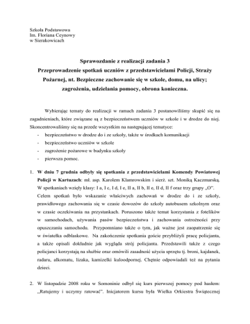 Szkoła Podstawowa Im. Floriana Ceynowy w Sierakowicach Sprawozdanie z realizacji zadania 3 Przeprowadzenie spotkań uczniów z przedstawicielami Policji, Straży Pożarnej, nt. Bezpieczne zachowanie się w szkole, domu, na ulicy; zagrożenia, udzielania pomocy, obrona konieczna. Wybierając tematy do realizacji w ramach zadania 3 postanowiliśmy skupić się na zagadnieniach, które związane są z bezpieczeństwem uczniów w szkole i w drodze do niej. Skoncentrowaliśmy się na przede wszystkim na następującej tematyce: - bezpieczeństwo w drodze do i ze szkoły, także w środkach komunikacji - bezpieczeństwo uczniów w szkole - zagrożenie pożarowe w budynku szkoły - pierwsza pomoc. 1. W dniu 7 grudnia odbyły się spotkania z przedstawicielami Komendy Powiatowej Policji w Kartuzach: mł. asp. Karolem Klamrowskim i sierż. szt. Moniką Kaczmarską. W spotkaniach wzięły klasy: I a, I c, I d, I e, II a, II b, II e, II d, II f oraz trzy grupy „O”. Celem spotkań było wskazanie właściwych zachowań w drodze do i ze szkoły, prawidłowego zachowania się w czasie dowozów do szkoły autobusem szkolnym oraz w czasie oczekiwania na przystankach. Poruszono także temat korzystania z fotelików w samochodach, używania pasów bezpieczeństwa i zachowania ostrożności przy opuszczaniu samochodu. Przypomniano także o tym, jak ważne jest zaopatrzenie się w światełka odblaskowe. Na zakończenie spotkania goście przybliżyli pracę policjanta, a także opisali dokładnie jak wygląda strój policjanta. Przedstawili także z czego policjanci korzystają na służbie oraz omówili zasadność użycia sprzętu tj. broni, kajdanek, radaru, alkomatu, lizaka, kamizelki kuloodpornej. Chętnie odpowiadali też na pytania dzieci. 2. W listopadzie 2008 roku w Somoninie odbył się kurs pierwszej pomocy pod hasłem: ,,Ratujemy i uczymy ratować”. Inicjatorem kursu była Wielka Orkiestra Świątecznej Pomocy. Z naszej szkoły wzięły w nim udział nauczycielki p. Natalia Labuda i p. Halina Treder. Zapoznały się tam z najnowszymi wytycznymi dotyczącymi udzielania pierwszej pomocy. Kurs był podzielony na dwie części: - Udzielenie pierwszej pomocy poszkodowanemu, który jest nieprzytomny, ale oddycha. - Udzielenie pierwszej pomocy poszkodowanemu, który jest nieprzytomny i nie oddycha. Podstawą programu jest utrzymanie poszkodowanego przy życiu do przyjazdu odpowiednio wykwalifikowanych służb. W ramach programu WOŚP nasza szkoła otrzymała pomoce do prowadzenia zajęć. Jest to pięć fantomów, jeden duży i cztery małe oraz podręczniki dla każdego ucznia. Po zakończeniu kursu obie panie realizują zajęcia, w czasie których dzieci uczą się najważniejszych zasad udzielania pierwszej pomocy: od prawidłowego wezwania pomocy przez telefon, po wykonanie czynności ratujących życie przy osobie poszkodowanej. Co roku uczniowie klas I biorą udział w zajęciach z zakresu pierwszej pomocy w roku 2008 było to około 104 uczniów, w roku 2009 przeszkolono 98 uczniów. W czasie dodatkowych godzin z Karty Nauczyciela od trzech lat prowadzone są raz w tygodniu kursy dla wybranej grupy uczniów (najczęściej z klas I). Również corocznie w okresie ferii zimowych organizowany jest kurs dla wszystkich chętnych dzieci. 3. W ramach realizacji konkursu „Bezpieczna szkoła - bezpieczny uczeń” p. Natalia Labuda przeprowadziła we wszystkich oddziałach przedszkolnych zajęcia z zakresu pierwszej pomocy. 4. Uczniom wszystkich klas I-VI zaprezentowano w ramach zajęć komputerowych „Poradnik bezpiecznych zachowań – multimedialną prezentację edukacyjną” opracowaną i udostępnioną przez Jednostkę Ratowniczo-Gaśniczą nr 1 w Szczecinie. W ciekawy, interaktywny sposób uczniowie zapoznali się z zagrożeniami, które mogą spotkać ich nie tylko w szkole. Szczególnie ważne były zagadnienia, które pomogły im przygotować się do próbnego alarmu przeciwpożarowego, który miał miejsce 19 listopada 2012 i przeprowadzony został przy współpracy z Państwową Strażą w Kartuzach. Pożarną 5. Od kilku już lat w naszej szkole w klasach I realizowany jest, przy zaangażowaniu Straży Pożarnej, program „Bezpieczne Życie”. Oparty jest on na doświadczeniach Szwedzkiej Ligi Obrony Cywilnej. Uczy dzieci bezpiecznych zachowań, umiejętności przetrwania oraz zapobiegania nieszczęśliwym wypadkom w domu, w szkole i na wakacjach. Celem programu jest zgromadzenie doświadczeń w zakresie upowszechniania wiedzy i umiejętności przydatnych w sytuacjach zagrożenia wśród dzieci i młodzieży oraz podniesienia ich świadomości z zakresu bezpieczeństwa. - zasad zachowania się w sytuacjach zagrożenia życia, - zasad bezpieczeństwa podczas gier i zabaw na świeżym powietrzu, - sposobów wzywania pomocy, gdy doszło do wypadku, - udzielanie pomocy bezpośrednio po wypadku, - zachowanie się podczas pożaru i po pożarze, - ochrona i zabezpieczenie mieszkania przed różnymi zdarzeniami, bezpieczeństwo w ruchu drogowym, - zachowania się w niesprzyjających warunkach atmosferycznych, postępowania w przypadku kontaktu z niebezpiecznymi substancjami. W naszej szkole, co roku, uczniowie wraz z przeszkolonymi nauczycielami przystępują do realizacji programu. Zdobywanie nowej wiedzy i doświadczeń przebiega w różnorodnych formach, np. podczas biwaków w terenie, zajęć w lesie, spotkań z policjantem, strażakiem oraz zajęć eksperymentalnych w salach lekcyjnych (projekcje, pokazy, doświadczenia). Każdego roku uczestniczą w konkursach: plastycznych, wiedzowych i praktycznych podsumowujących realizację zadań, podczas których wykazują się wysokim stopniem znajomości zasad bezpiecznego życia. Realizowany program składa się z dwóch części poświęconych różnego rodzaju wypadkom oraz zaginięciom dzieci: - część I „Kicia i Rufi"- wypadki, które zdarzają się codziennie Kurs uczy zapobiegania nieszczęśliwym wypadkom w domu. Podczas kursu 