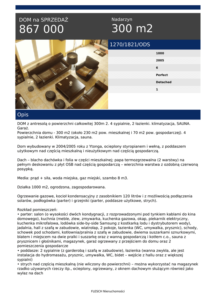 Nadarzyn DOM na SPRZEDAŻ 300 m2 867 000 1270/1821/ODS 1000 2005 6 Perfect Detached 1 Opis DOM z antresolą o powierzchni całkowitej 300m 2. 4 sypialnie, 2 łazienki. klimatyzacja, SAUNA. Garaż. Powierzchnia domu - 300 m2 (około 230 m2 pow. mieszkalnej i 70 m2 pow. gospodarczej). 4 sypialnie, 2 łazienki. Klimatyzacja, sauna. Dom wybudowany w 2004/2005 roku z Ytonga, ocieplony styropianem i wełną, z poddaszem użytkowym nad częścią mieszkalną i nieużytkowym nad częścią gospodarczą. Dach – blacho dachówka i folia w części mieszkalnej; papa termozgrzewalna (2 warstwy) na pełnym deskowaniu z płyt OSB nad częścią gospodarczą – wierzchnia warstwa z ozdobną czerwoną posypką. Media: prąd + siła, woda miejska, gaz miejski, szambo 8 m3. Działka 1000 m2, ogrodzona, zagospodarowana. Ogrzewanie gazowe, kocioł kondensacyjny z zasobnikiem 120 litrów i z możliwością podłączenia solarów, podłogówka (parter) i grzejniki (parter, poddasze użytkowe, strych). Rozkład pomieszczeń: • parter: salon (o wysokości dwóch kondygnacji, z rozprowadzonymi pod tynkiem kablami do kina domowego), kuchnia (meble, zlew, zmywarka, kuchenka gazowa, okap, piekarnik elektryczny, kuchenka mikrofalowa, lodówka side-by-side Samsung z kostkarką lodu i dystrybutorem wody), jadalnia, hall z szafą w zabudowie, wiatrołap, 2 pokoje, łazienka (WC, umywalka, prysznic), schody, schowek pod schodami, kotłownia/pralnia z szafą w zabudowie, dwiema suszarkami sznurkowymi, blatem i miejscem na dwie pralki i suszarkę oraz z wanną gospodarczą i kotłem c.o., sauna z prysznicem i głośnikami, magazynek, garaż ogrzewany z przejściem do domu oraz 2 pomieszczenia gospodarcze • poddasze: 2 sypialnie (z garderobą i szafą w zabudowie), łazienka (wanna zwykła, ale jest instalacja do hydromasażu, prysznic, umywalka, WC, bidet – wejście z hallu oraz z większej sypialni) • strych nad częścią mieszkalną (nie wliczony do powierzchni) – można wykorzystać na magazynek rzadko używanych rzeczy itp., ocieplony, ogrzewany, z oknem dachowym służącym również jako wyłaz na dach FLESCH Nieruchomości Klimatyzacja w największej sypialni na górze i w biurze na dole, kominek z rozprowadzeniem ciepła do dwóch sypialni i biura, elektrycznie otwierane okna dachowe w salonie i nad schodami, sauna z prysznicem, alarm przystosowany do obecności zwierząt. Drzwi zewnętrzne antywłamaniowe z atestowanymi zamkami. Drzwi wewnętrzne drewniane. Okna białe PCV, roletki wewnętrzne, karnisze, moskitiery. Duży taras wyłożony kostką od południowo wschodniej strony. Markiza elektryczna z czujnikiem wiatru (aktualnie brak napędu, ale jest instalacja). Brama wjazdowa (przesuwna samonośna) i garażowa automatyczne. Wideodomofon. Śmietnik. Wyłożony kostką podjazd, ścieżka od furtki do domu, opaska wokół domu oraz dodatkowe powierzchnie w ogrodzie. Ogrodzenie wewnętrzne z siatki na podmurówce zabudowanej panelami drewnianymi; zewnętrzne – słupki klinkierowe i metal. Oświetlenie zewnętrzne domu i ogrodu, częściowo aktywowane ruchem (czujniki ruchu). Automatyczne podlewanie ogrodu (brak programatorów). Dwa krany zewnętrzne i kilka gniazd elektrycznych. Internet, instalacja do telewizji satelitarnej, monitoring. Dojazd drogą gminną, utwardzoną, oświetloną. Do asfaltu 350 m, do Trasy Katowickiej 1500 m. Bardzo dobry dojazd do Warszawy (tylko 25 km do centrum). Do centrum handlowego w Jankach 10 km. Dom bardzo solidnie zbudowany i wykończony z najlepszych materiałów, ciepły i ekonomiczny w użytkowaniu. W pełni gotowy do zamieszkania. Bardzo zadbany i czysty. Ściany pomalowane farbą z najwyższej półki – farba Para, zmywalna, nieblaknąca, w ciepłym żółtym kolorze. Idealny dla rodziny prowadzącej własną działalność ze względu na część gospodarczą, którą można wykorzystać na biuro, warsztat, gabinet, hodowlę psów/kotów itp. (z dodatkowym oddzielnym wyjściem na zewnątrz i umywalką). Dom bardzo dobrze doświetlony i słoneczny (dużo okien od południowego wschodu i południowego zachodu), funkcjonalny, w cichej i bezpiecznej okolicy, wśród zabudowy jednorodzinnej. Bardzo sympatyczni i pomocni sąsiedzi. Możliwość sprzedaży z pełnym umeblowaniem (m. in. kolekcja mebli z litego drewna w kolorze wenge). POLECAM I ZAPRASZAM NA PREZENTACJE ! WIĘCEJ INFORMACJI tel. kom. 693 615 825 RENATA STRUŻYNA [email protected] Prezentowana oferta ma charakter informacyjny i nie stanowi oferty handlowej w rozumieniu art. 66 &1 Kodeksu Cywilnego. Renata Strużyna tel. 693 615 825 email: [email protected] FLESCH Nieruchomości Powered by TCPDF (www.tcpdf.org)